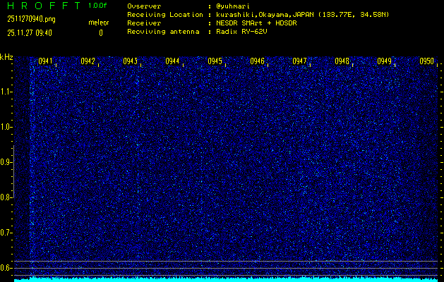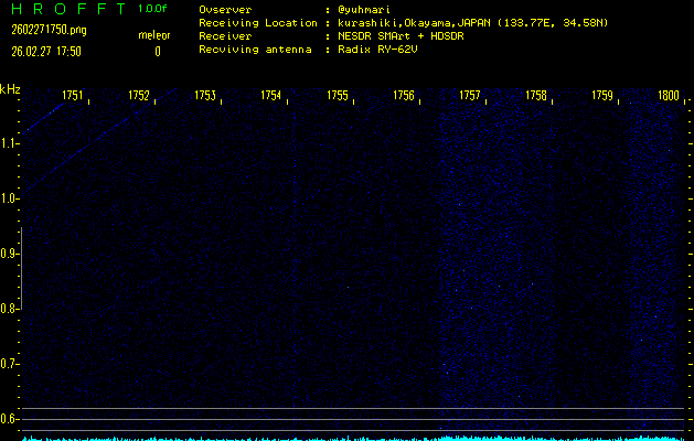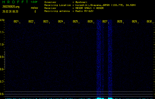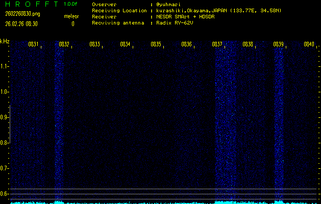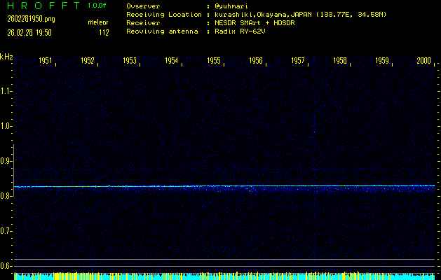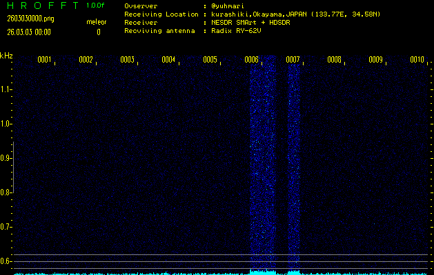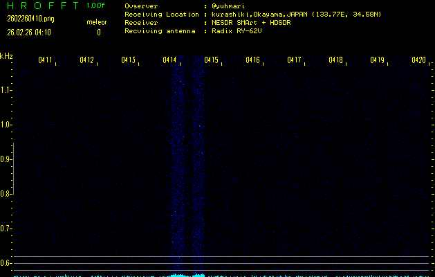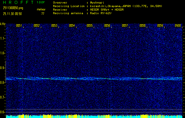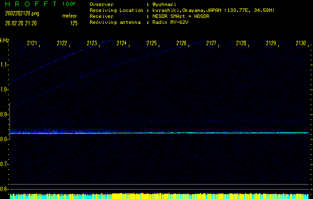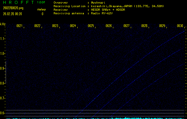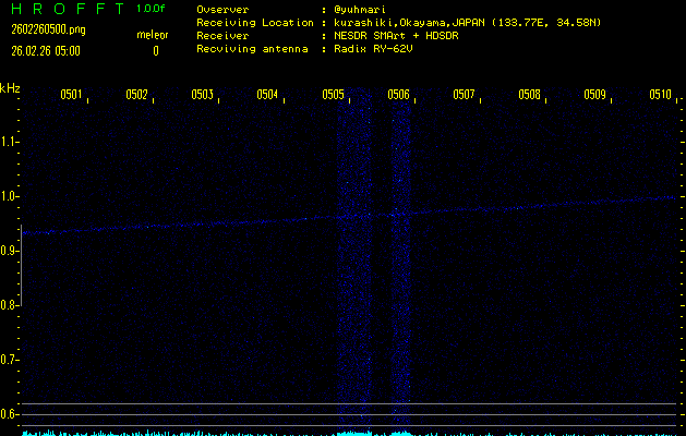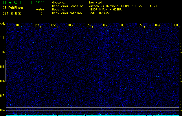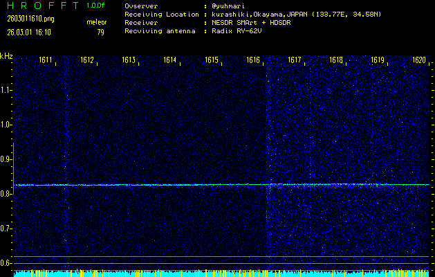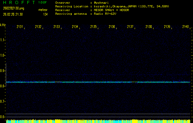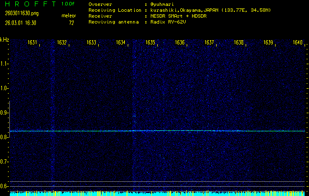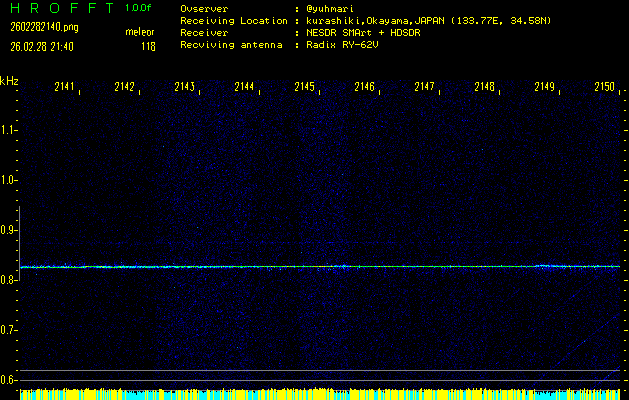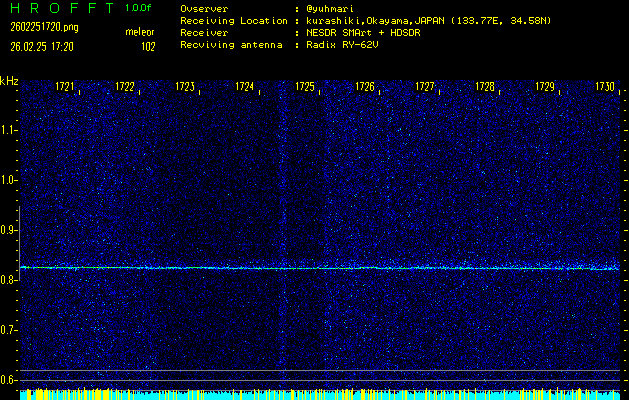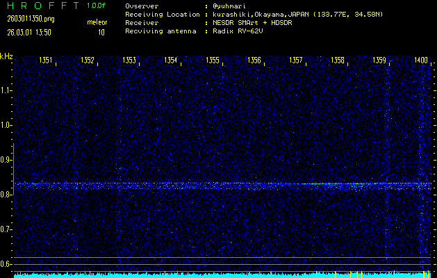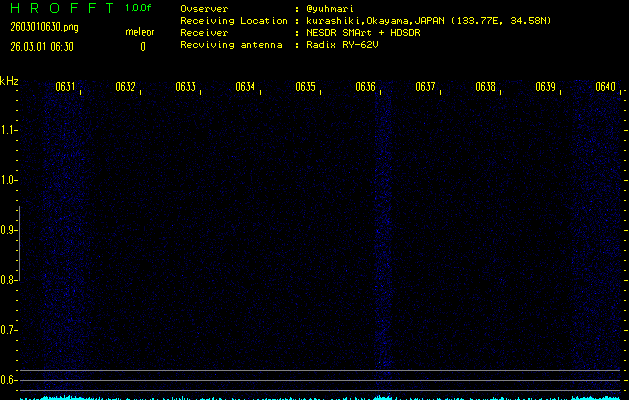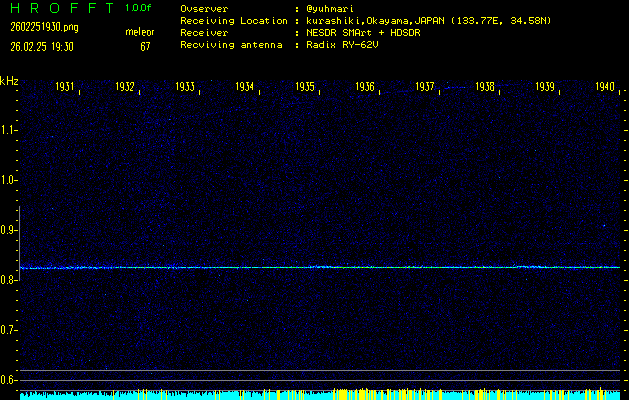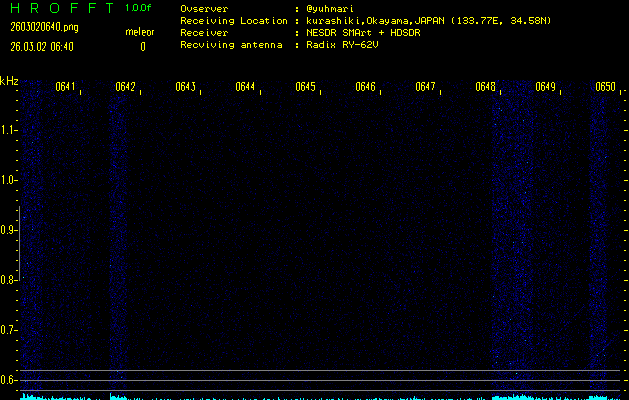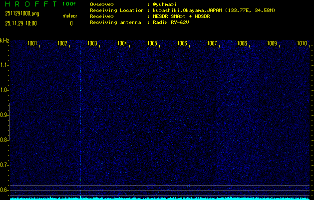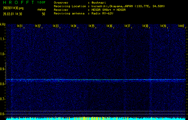 ただいま宮崎大学無線部OB会によって運用されているアマチュア無線50.017MHz(JA6YBR,50/10/1/0.1W,CW)を利用して試験受信を行っています。