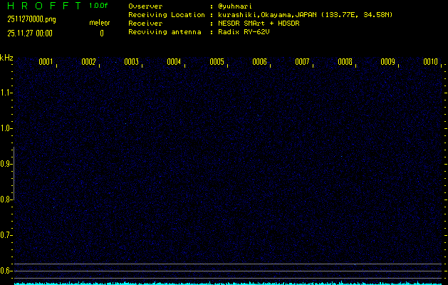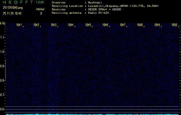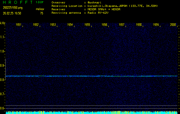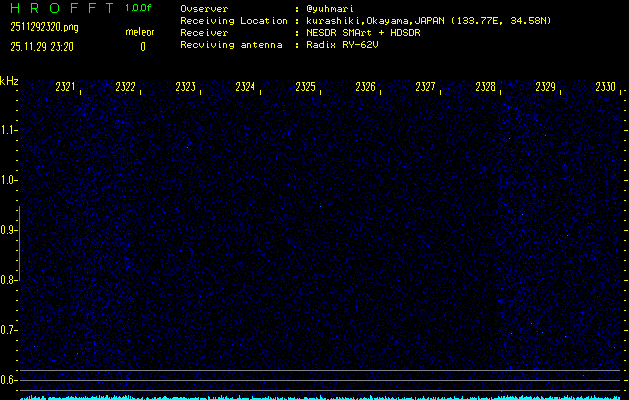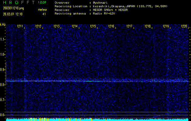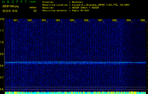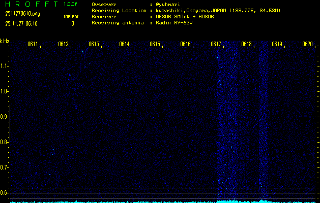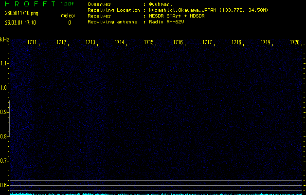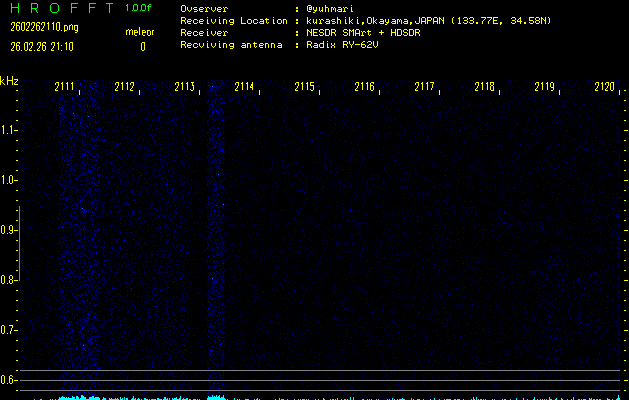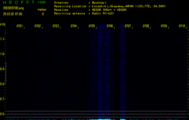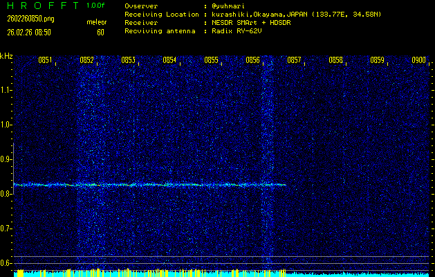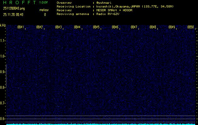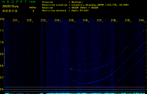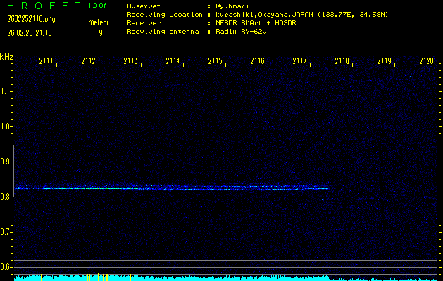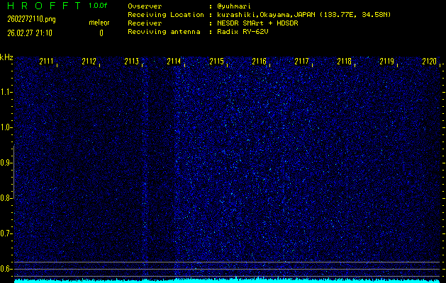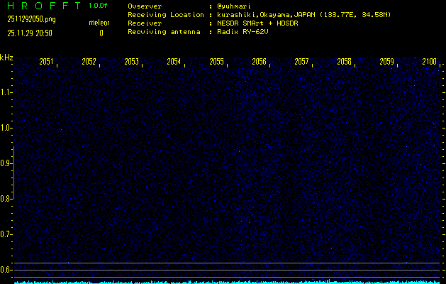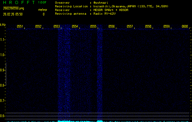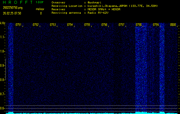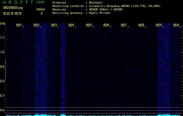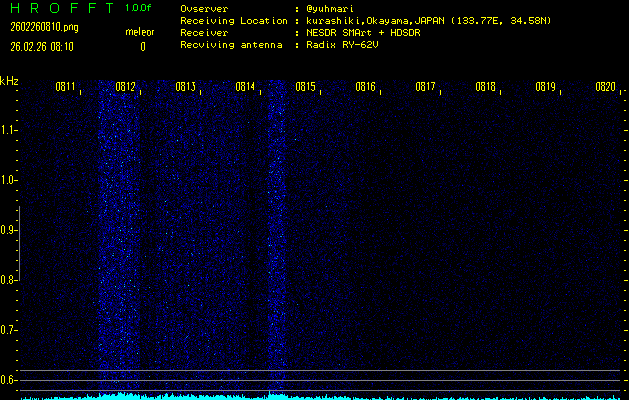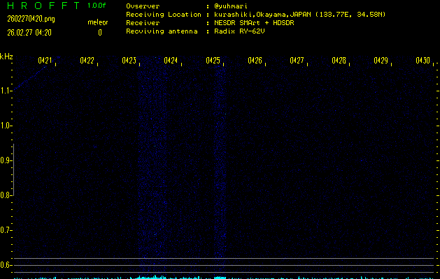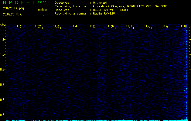 ただいま宮崎大学無線部OB会によって運用されているアマチュア無線50.017MHz(JA6YBR,50/10/1/0.1W,CW)を利用して試験受信を行っています。
