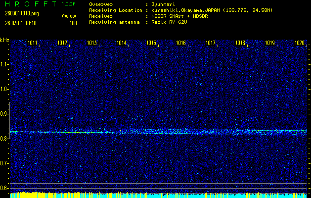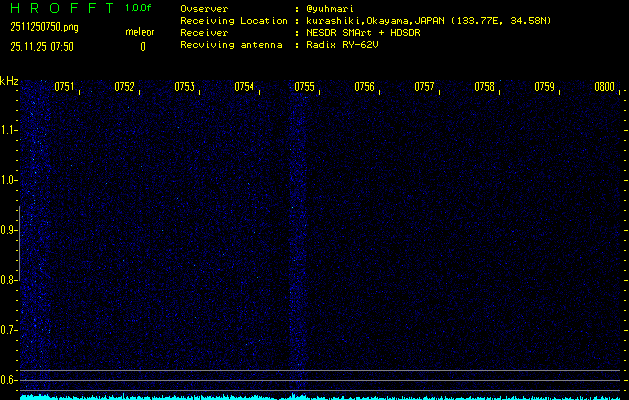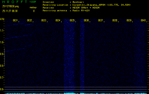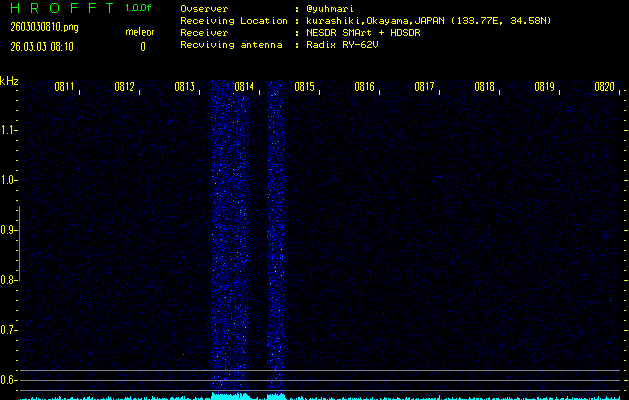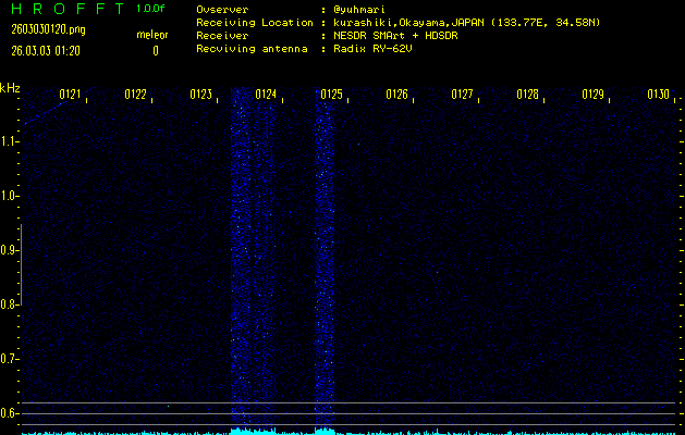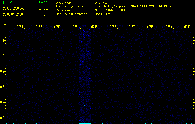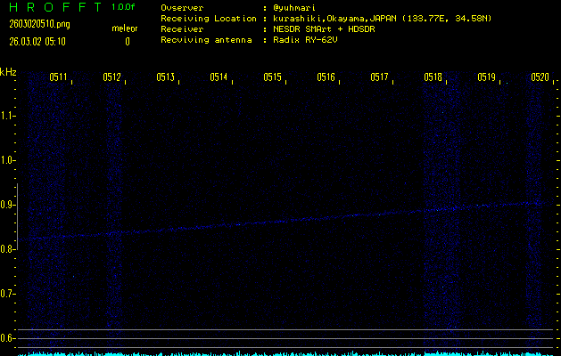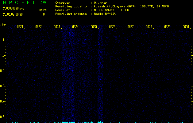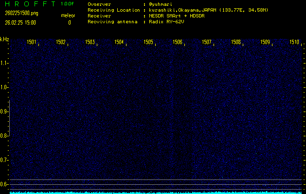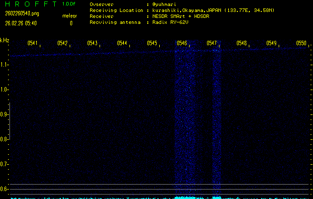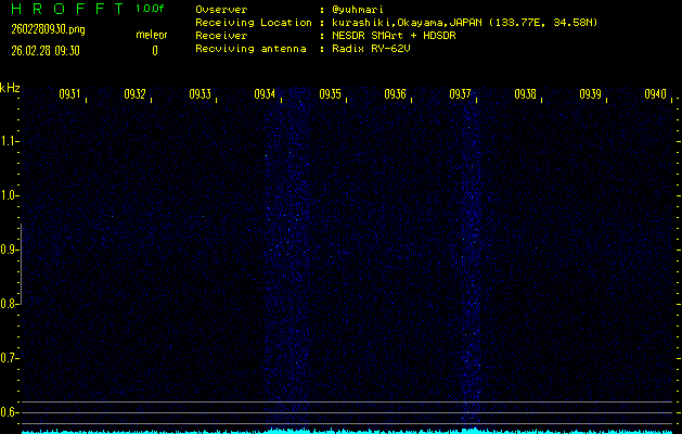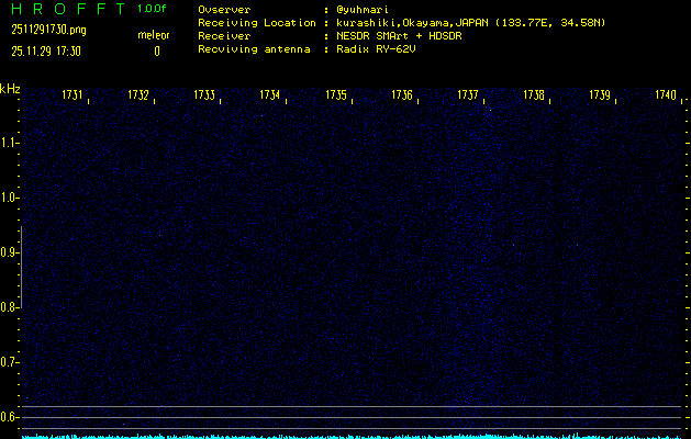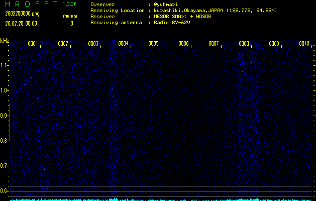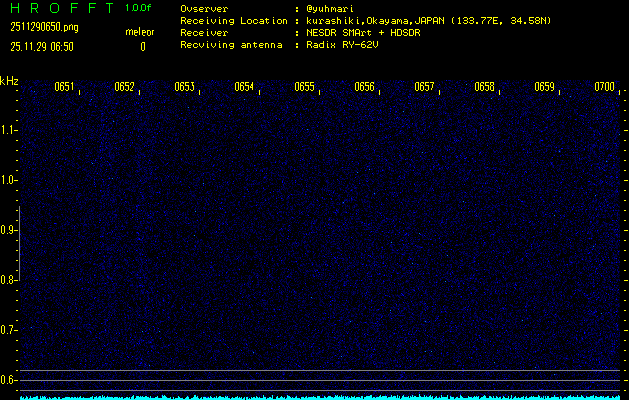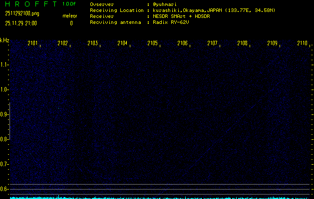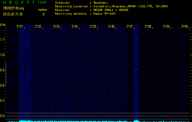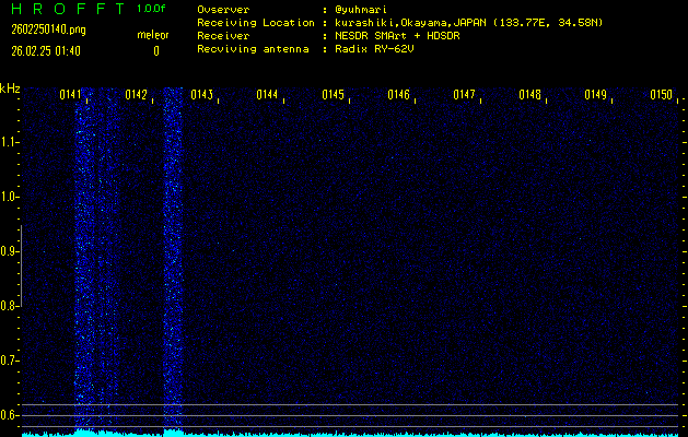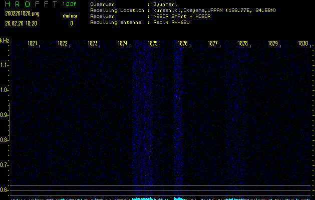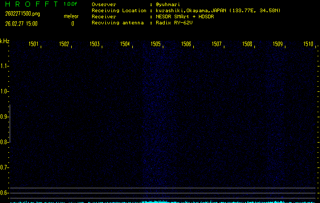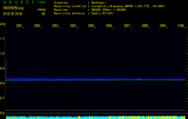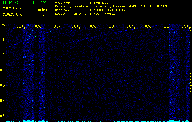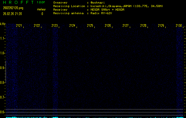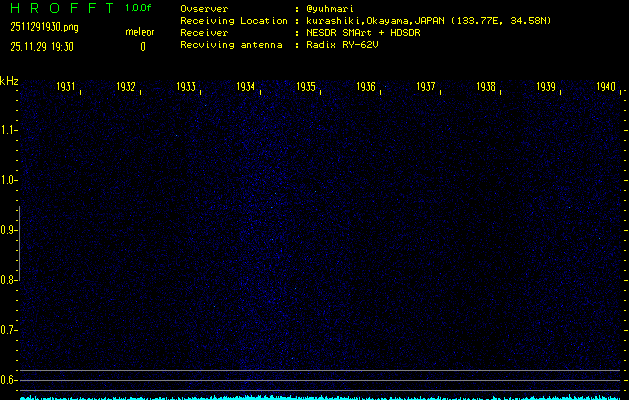 ただいま宮崎大学無線部OB会によって運用されているアマチュア無線50.017MHz(JA6YBR,50/10/1/0.1W,CW)を利用して試験受信を行っています。