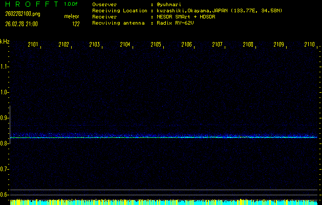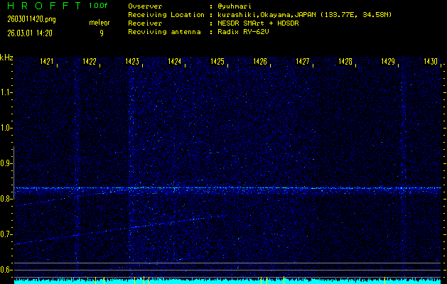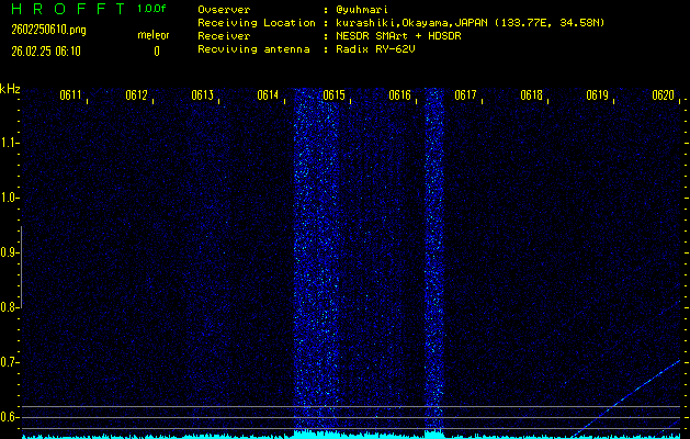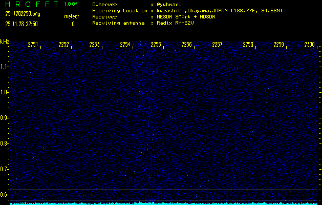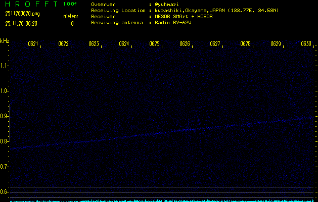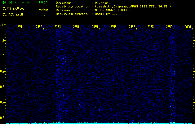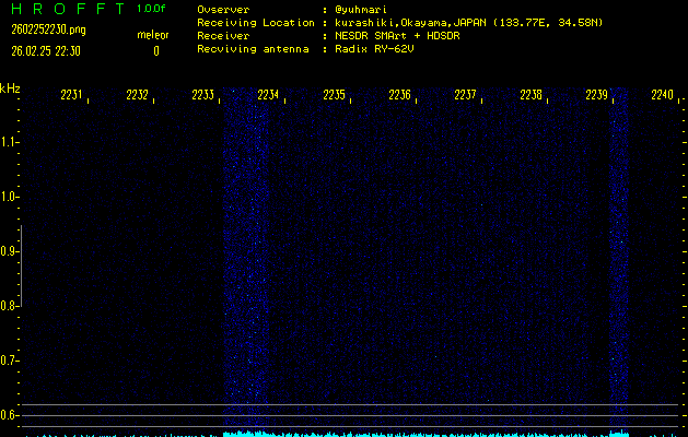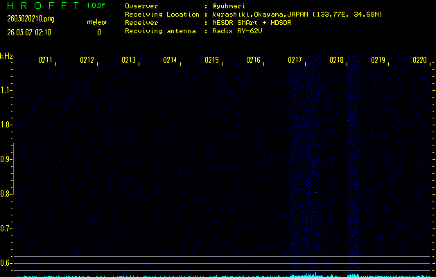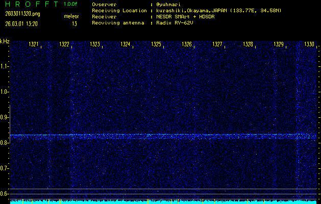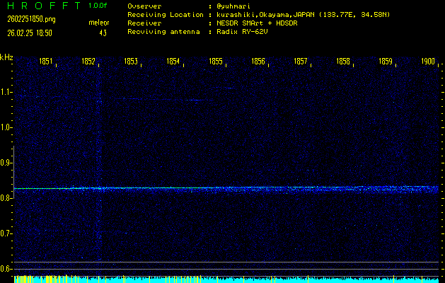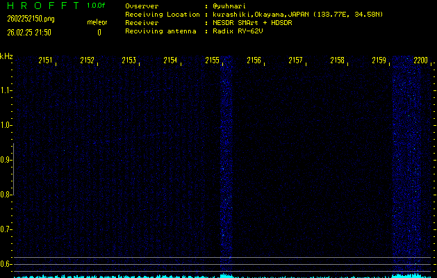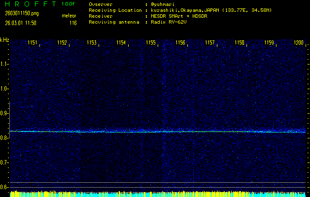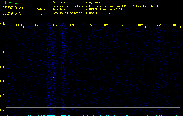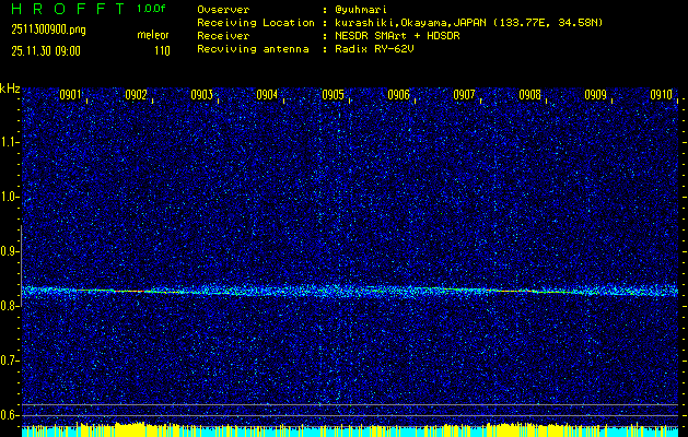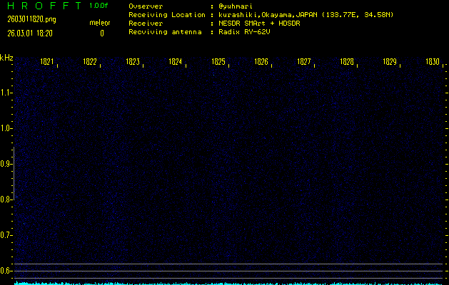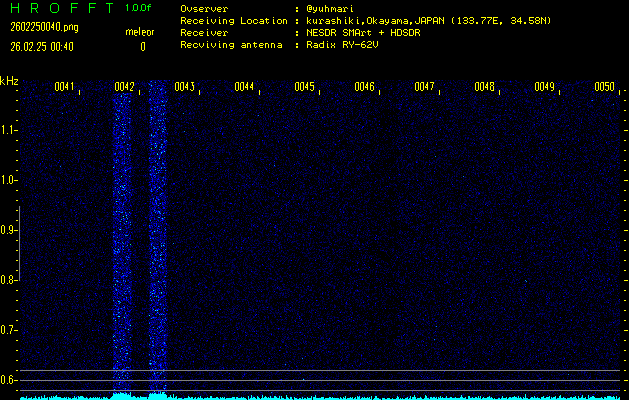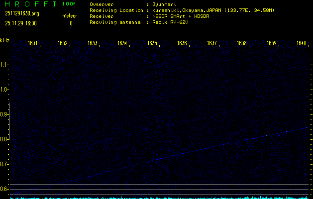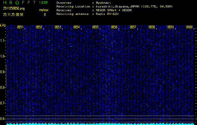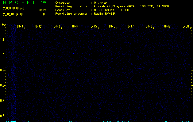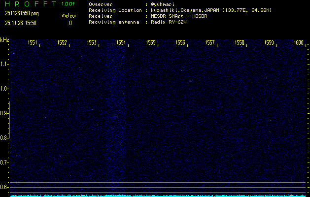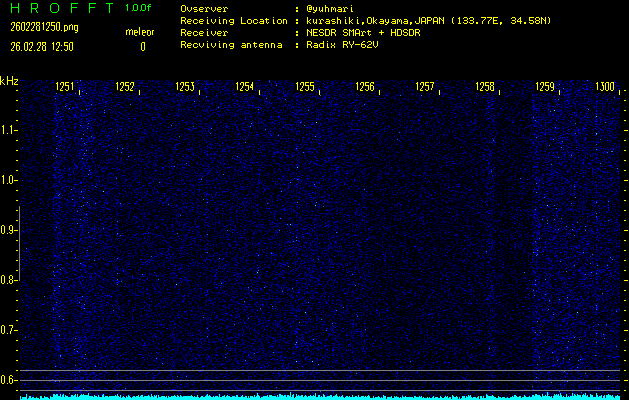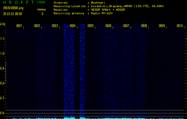 ただいま宮崎大学無線部OB会によって運用されているアマチュア無線50.017MHz(JA6YBR,50/10/1/0.1W,CW)を利用して試験受信を行っています。