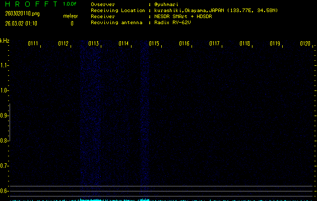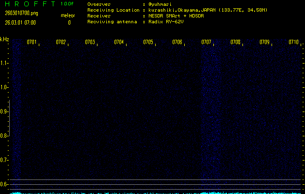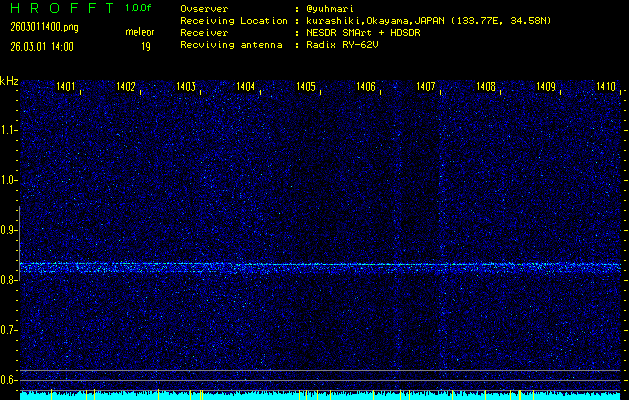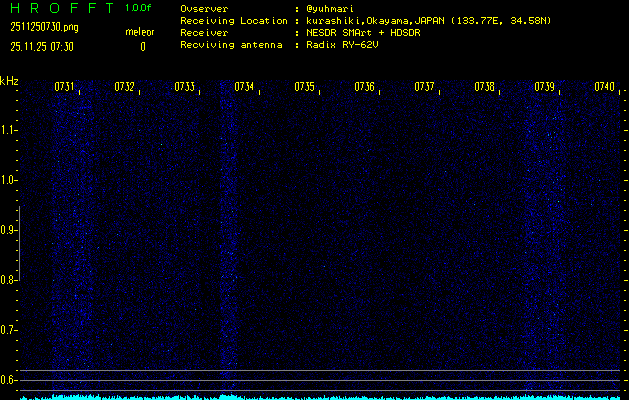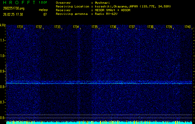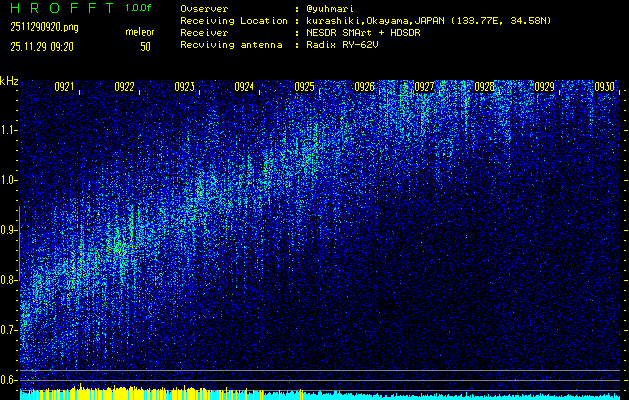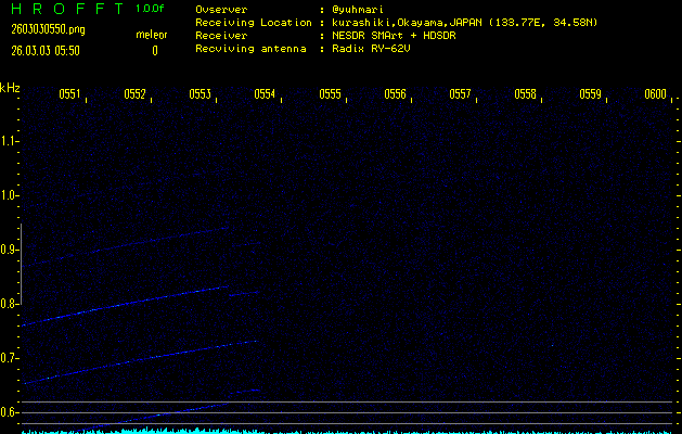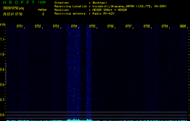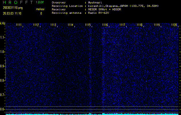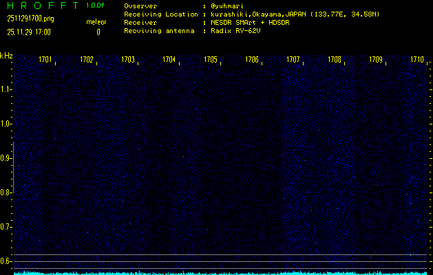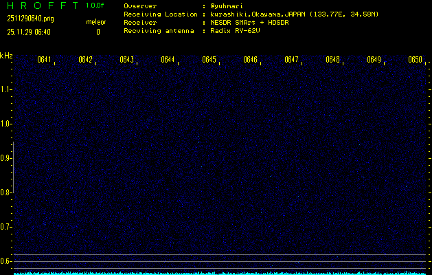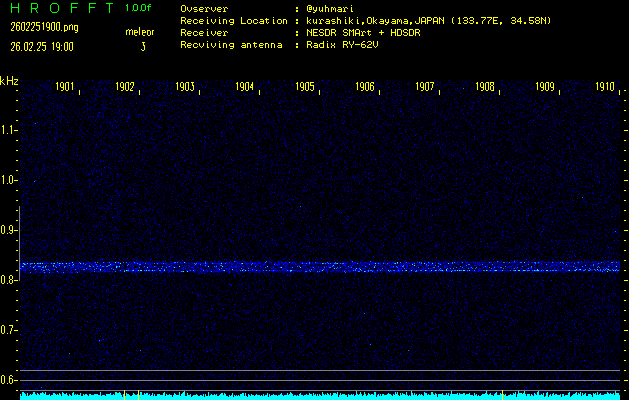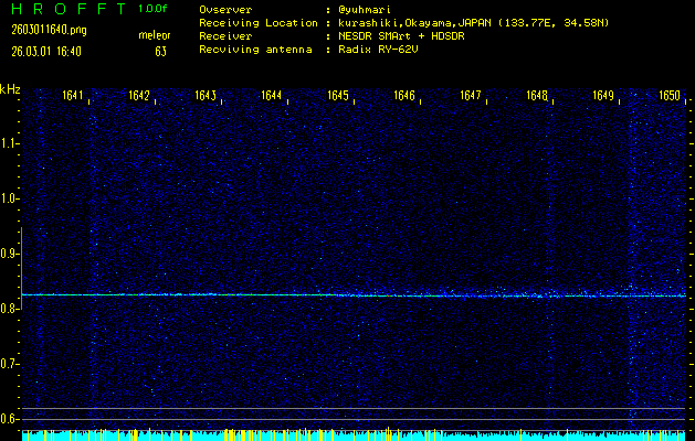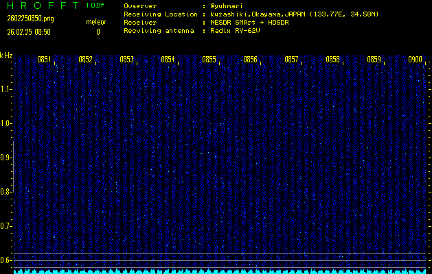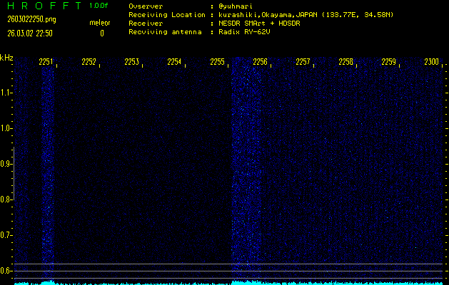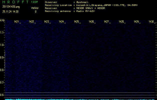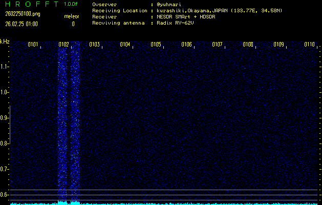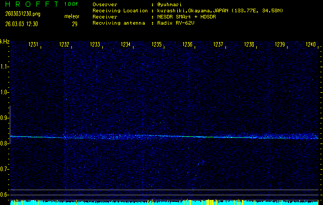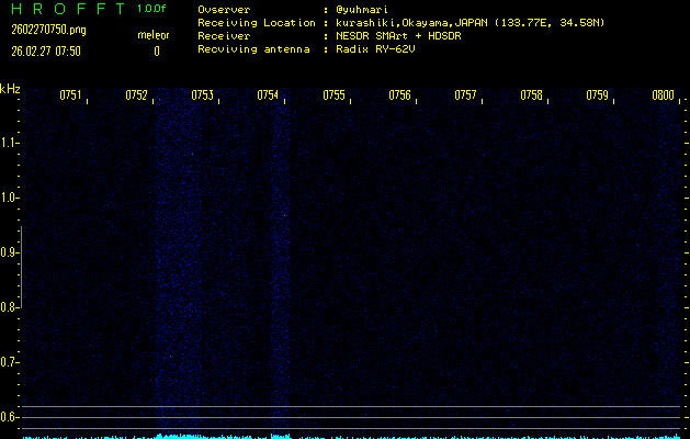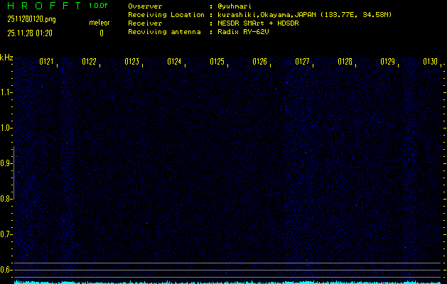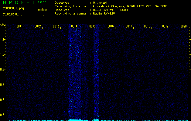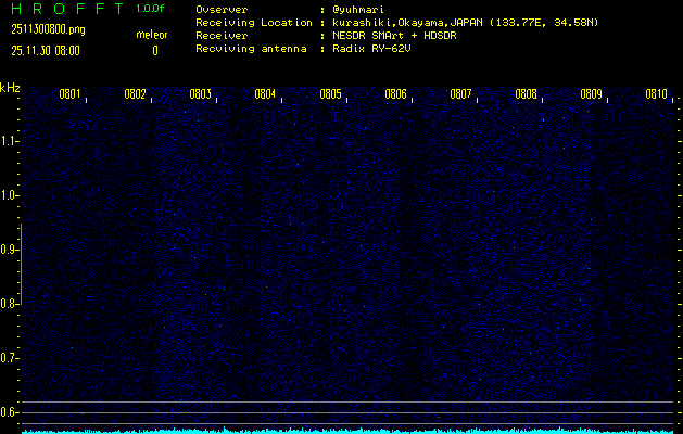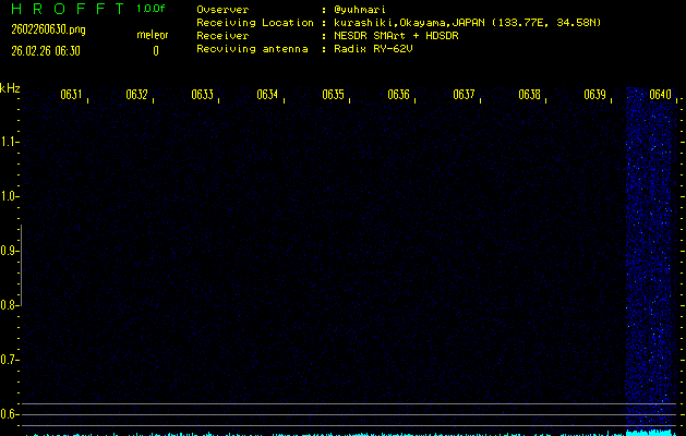 ただいま宮崎大学無線部OB会によって運用されているアマチュア無線50.017MHz(JA6YBR,50/10/1/0.1W,CW)を利用して試験受信を行っています。
