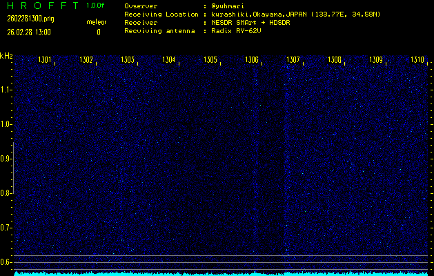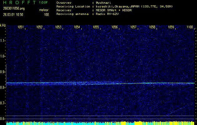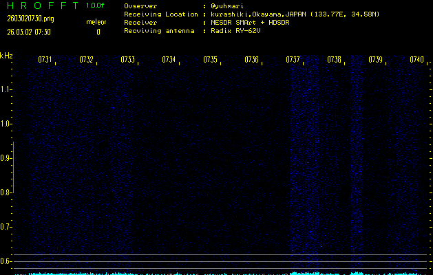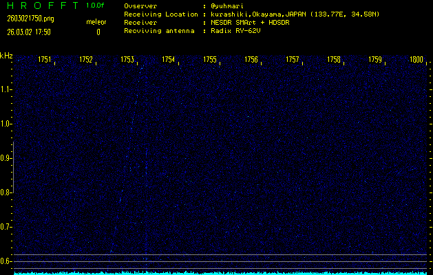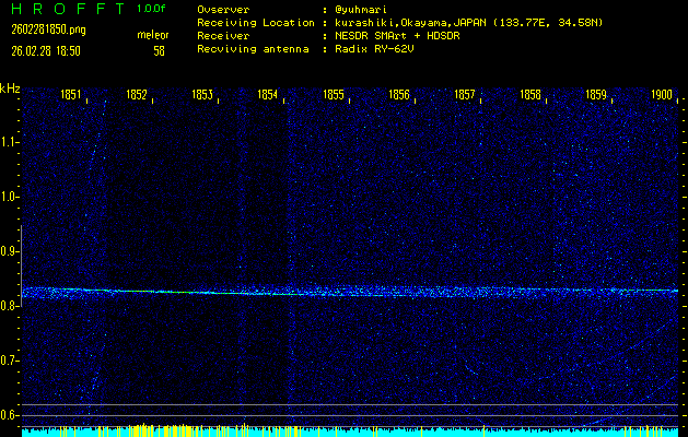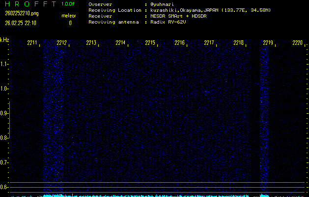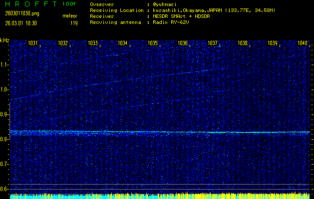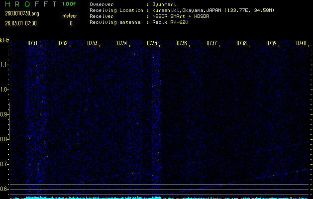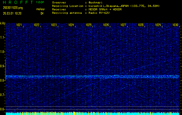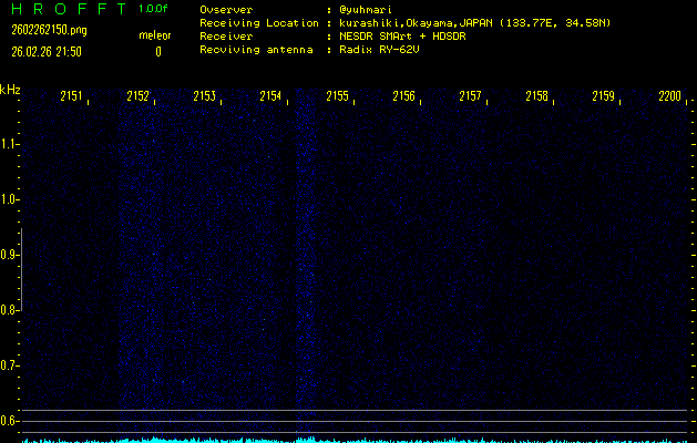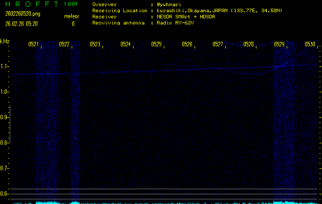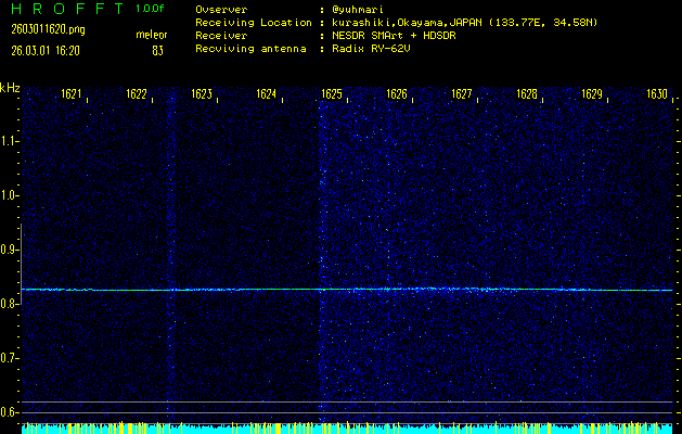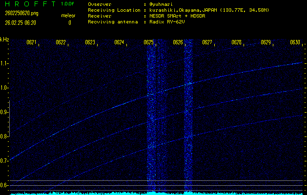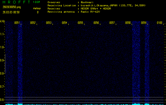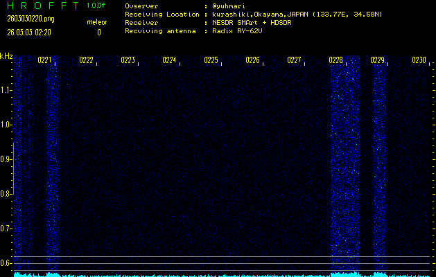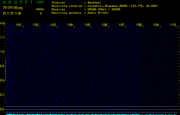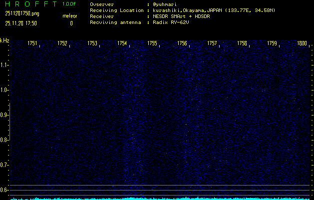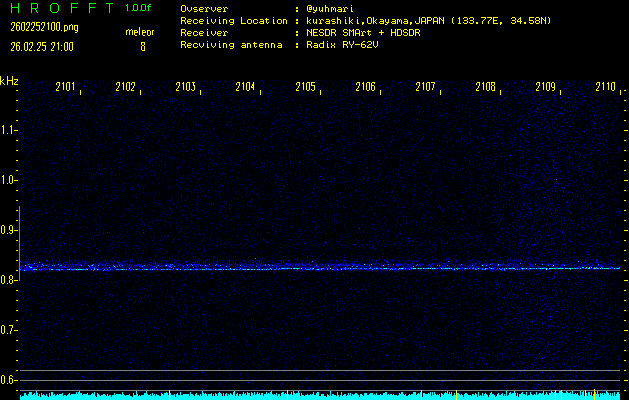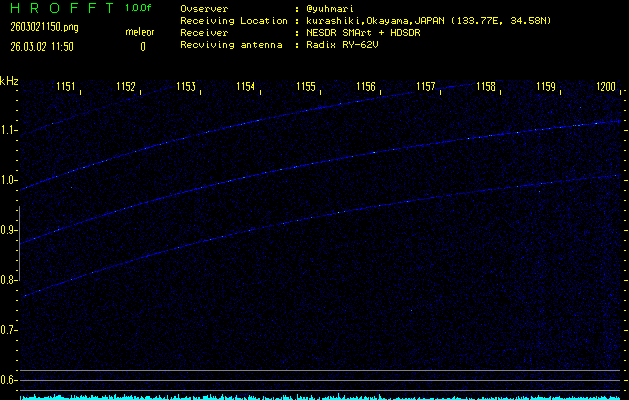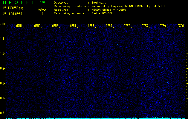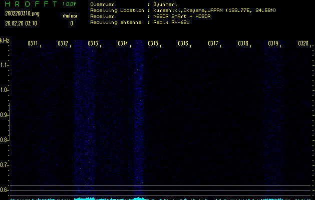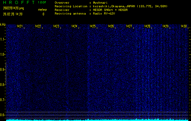 ただいま宮崎大学無線部OB会によって運用されているアマチュア無線50.017MHz(JA6YBR,50/10/1/0.1W,CW)を利用して試験受信を行っています。