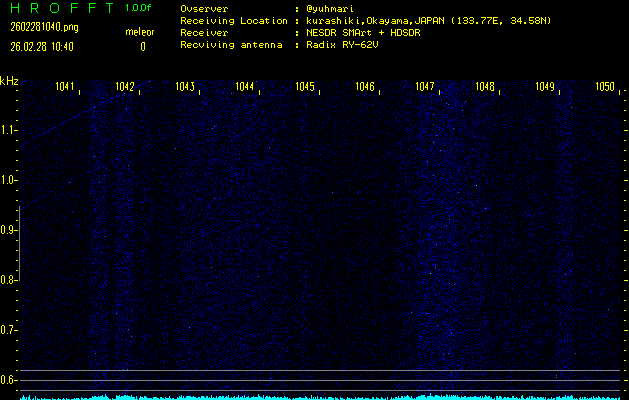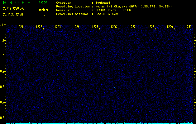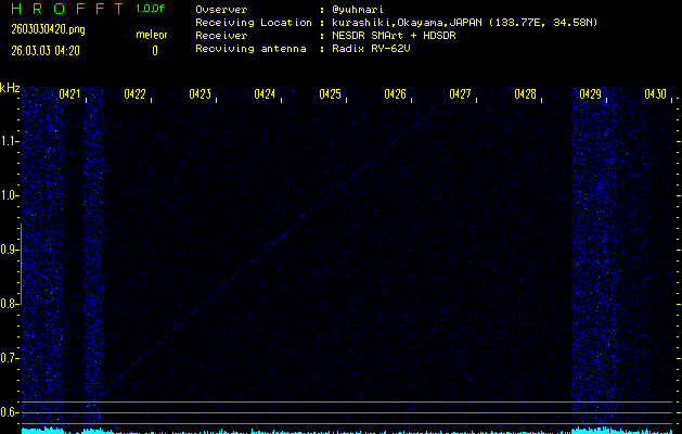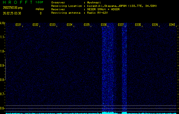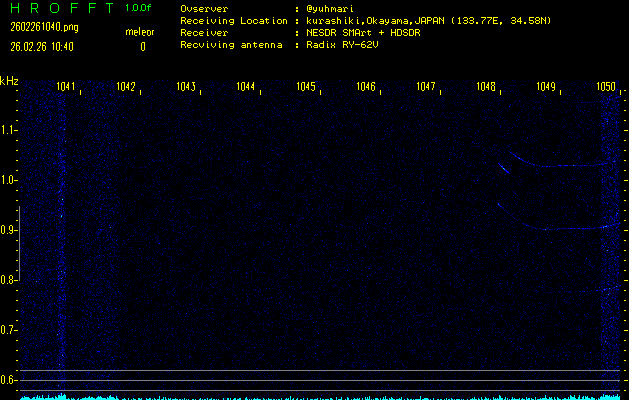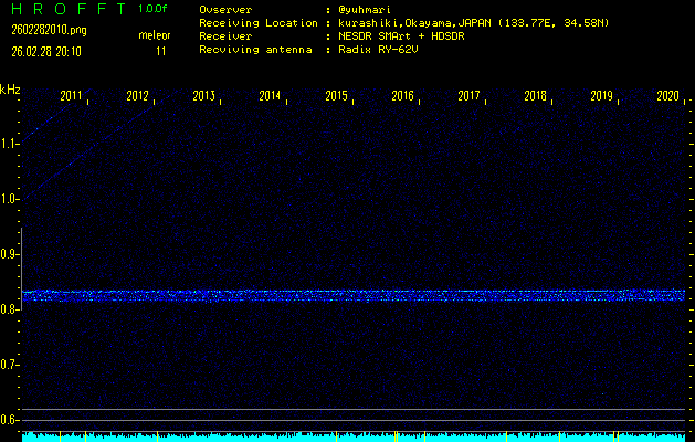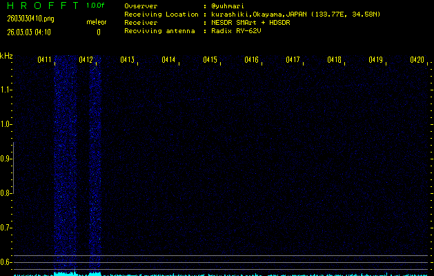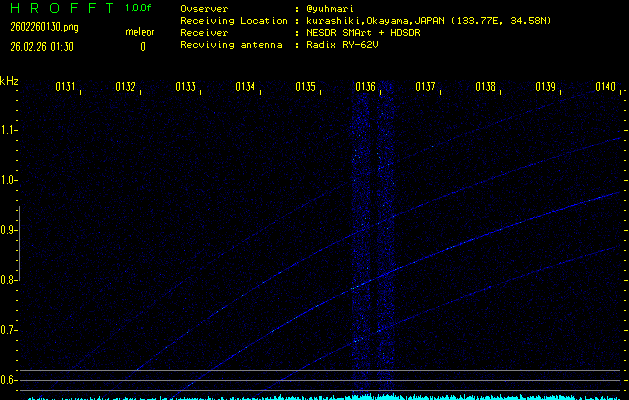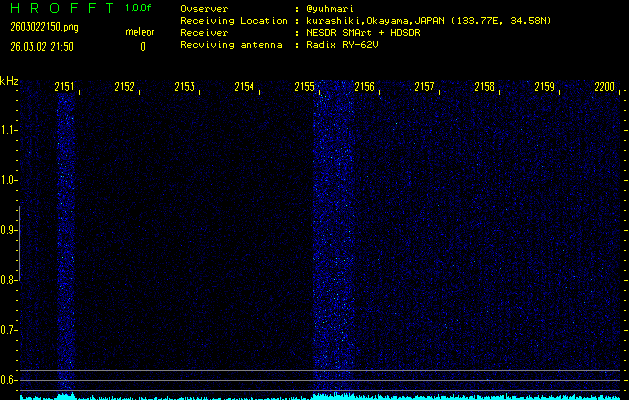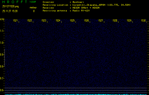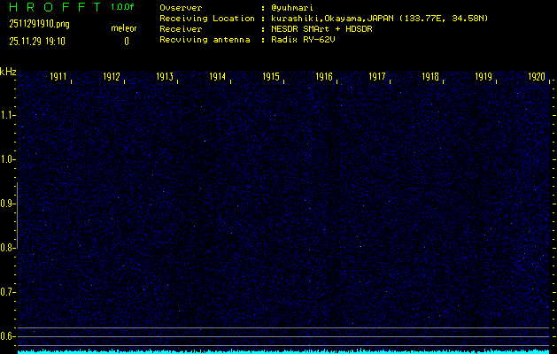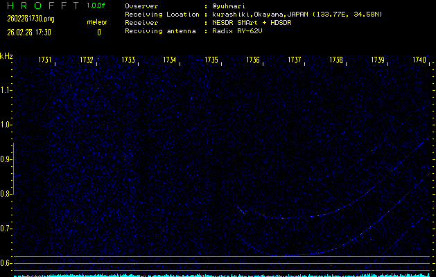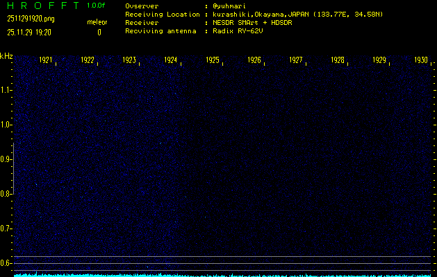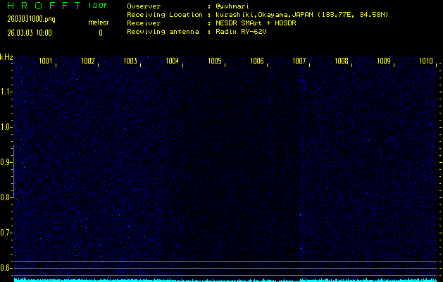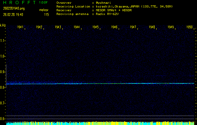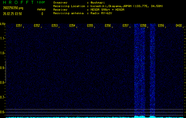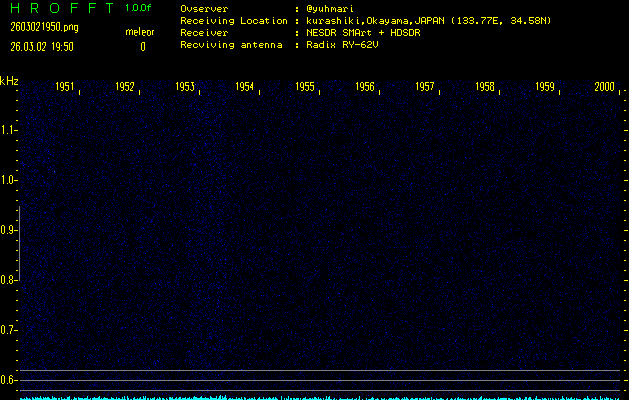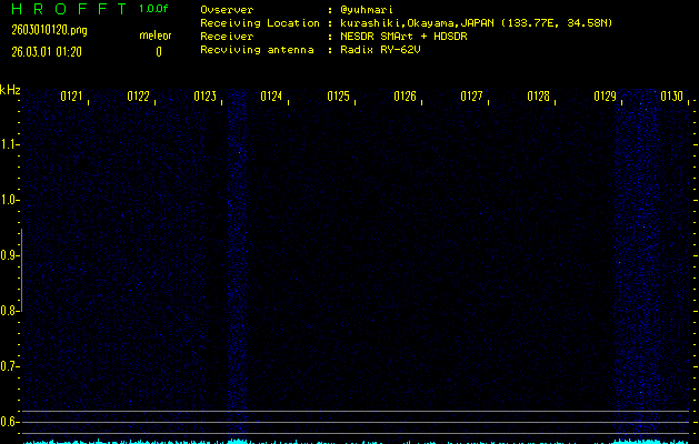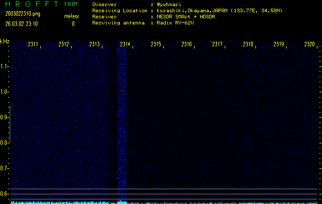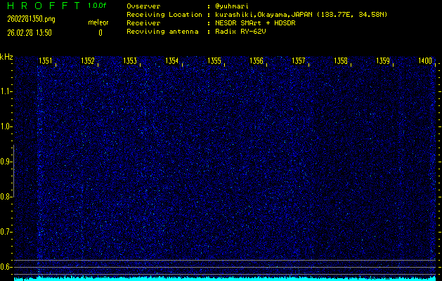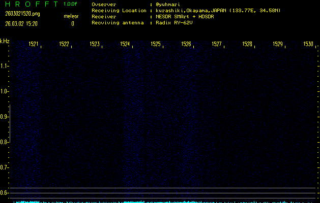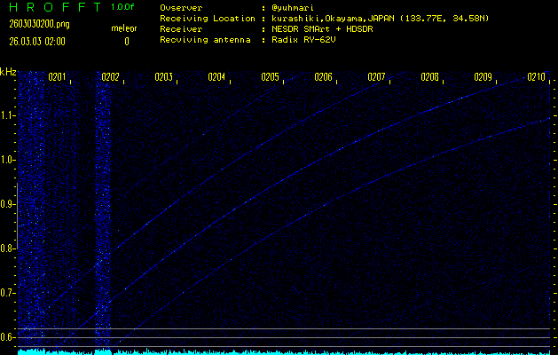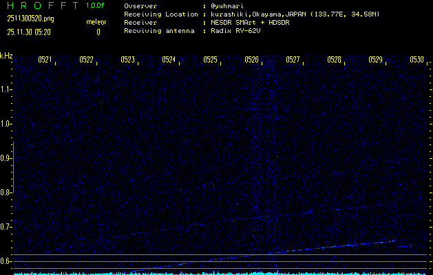 ただいま宮崎大学無線部OB会によって運用されているアマチュア無線50.017MHz(JA6YBR,50/10/1/0.1W,CW)を利用して試験受信を行っています。