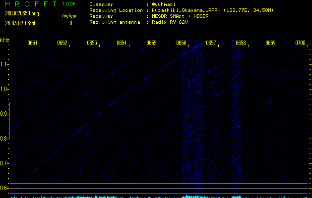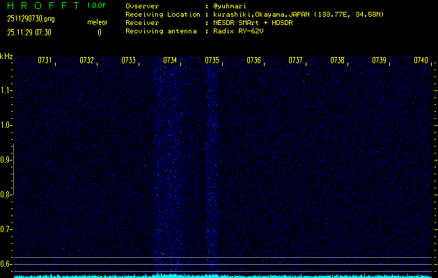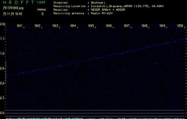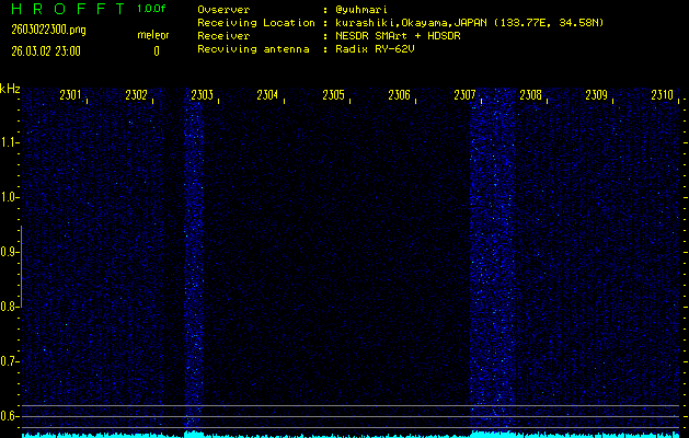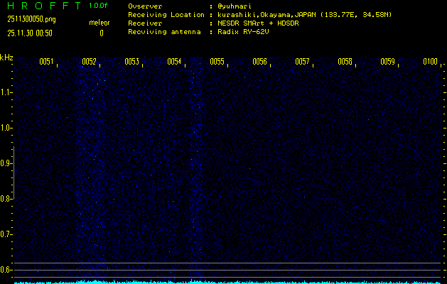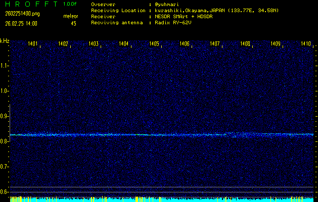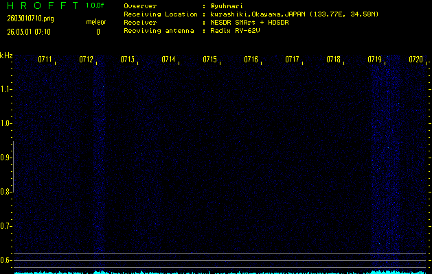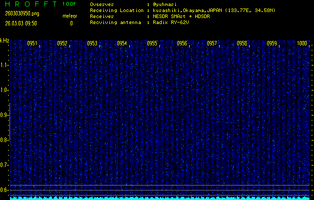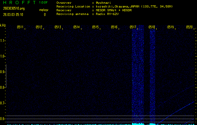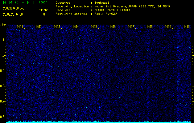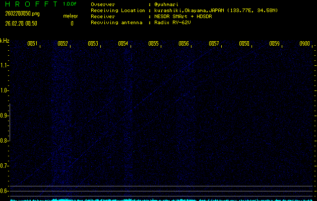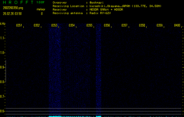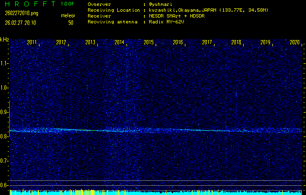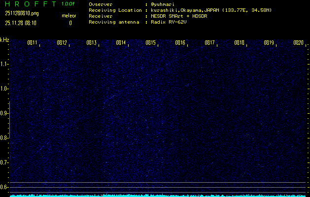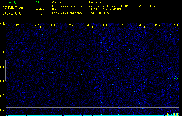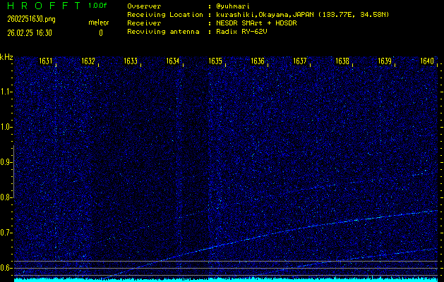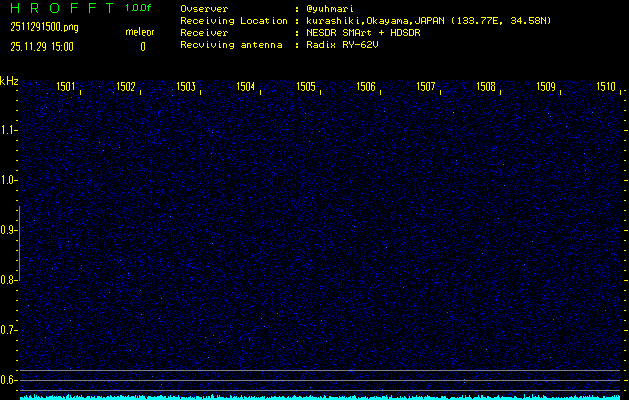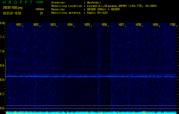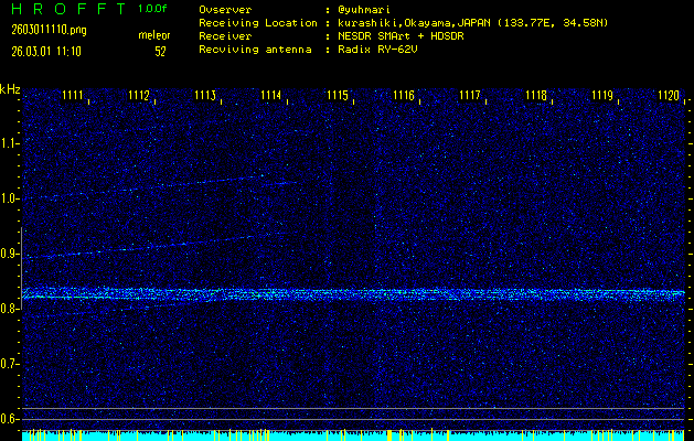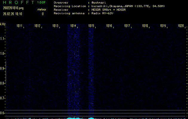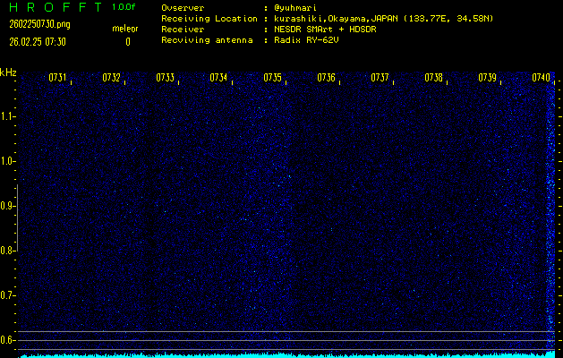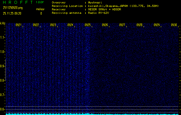 ただいま宮崎大学無線部OB会によって運用されているアマチュア無線50.017MHz(JA6YBR,50/10/1/0.1W,CW)を利用して試験受信を行っています。
