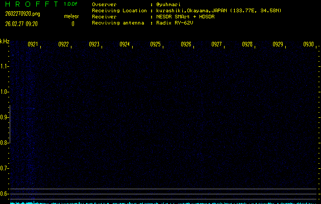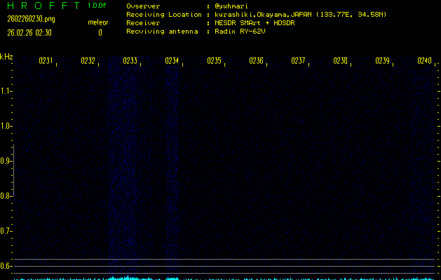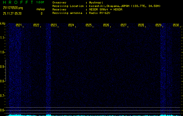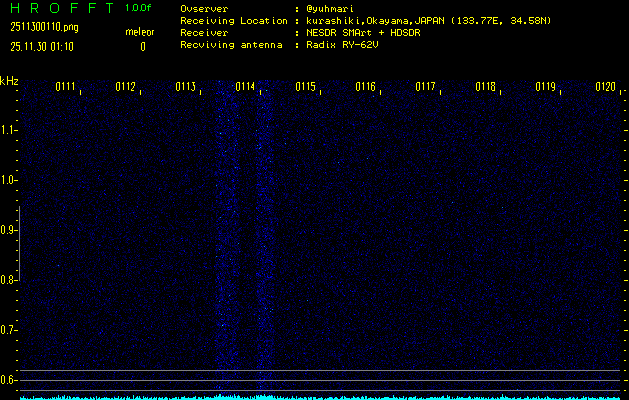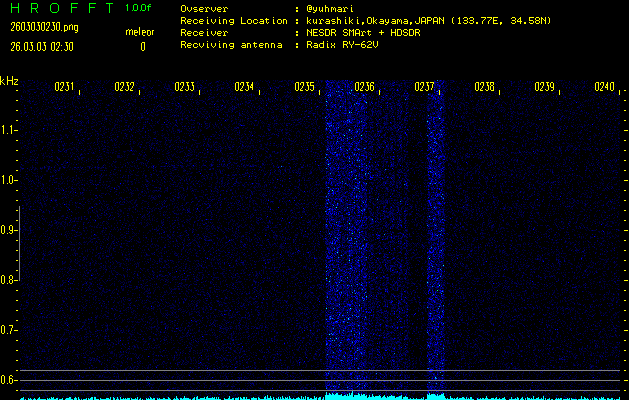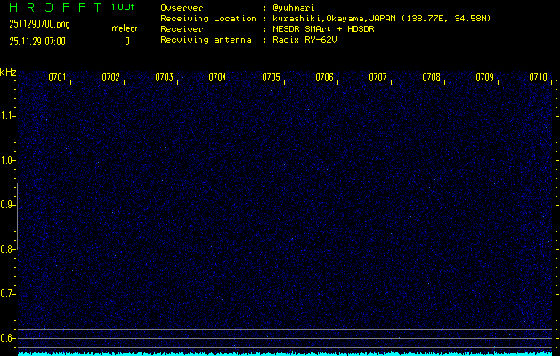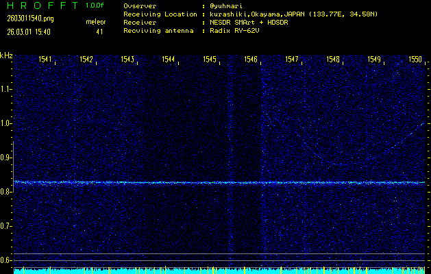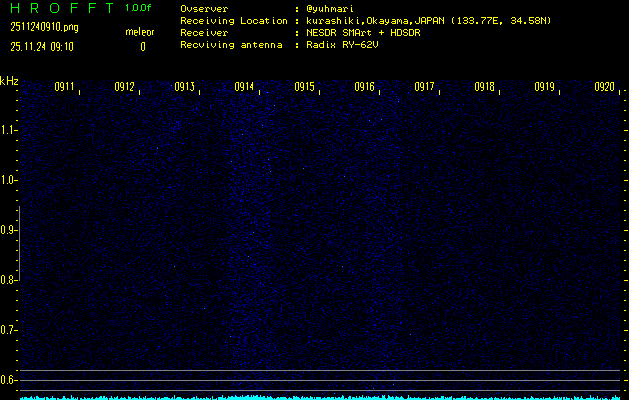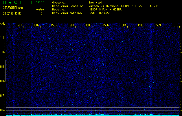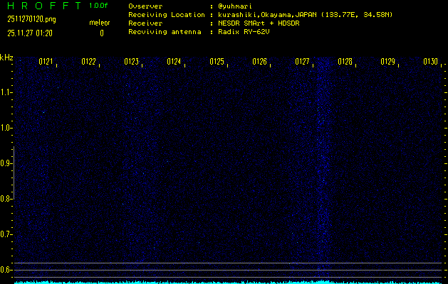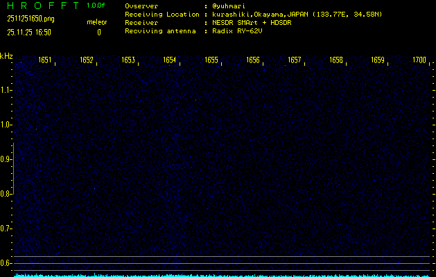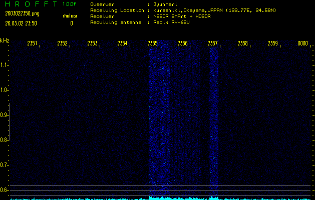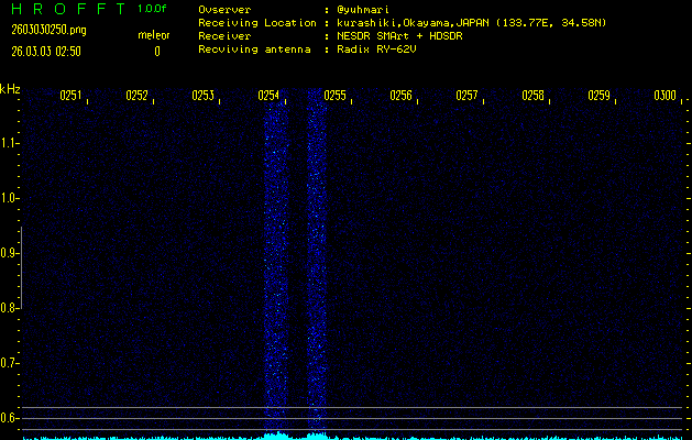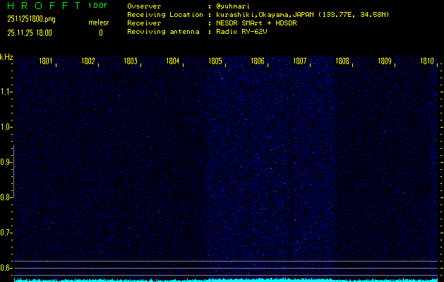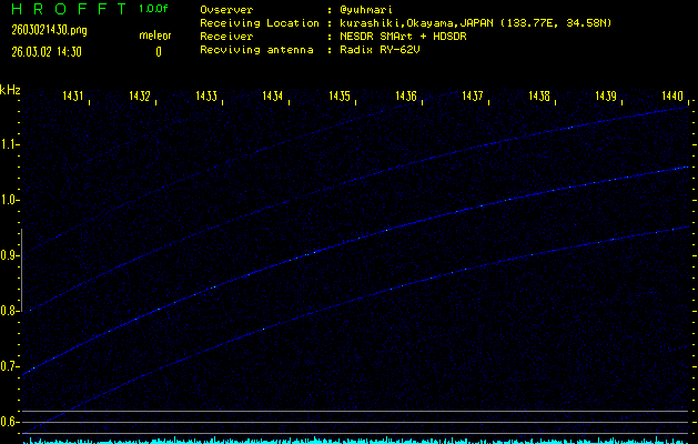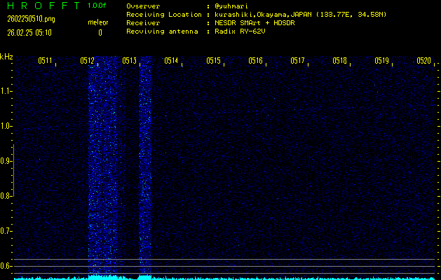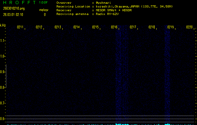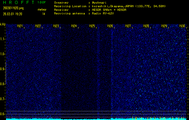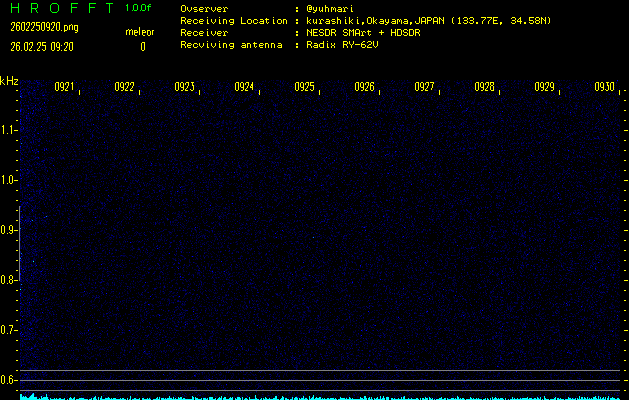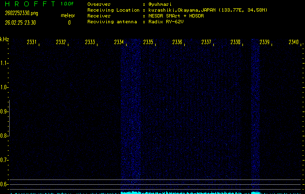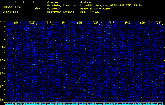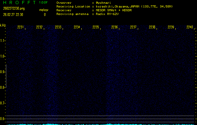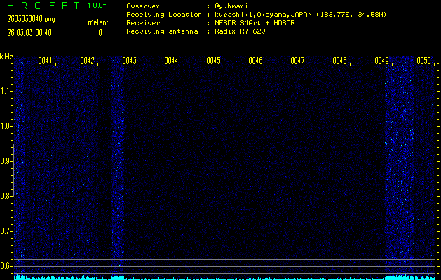 ただいま宮崎大学無線部OB会によって運用されているアマチュア無線50.017MHz(JA6YBR,50/10/1/0.1W,CW)を利用して試験受信を行っています。