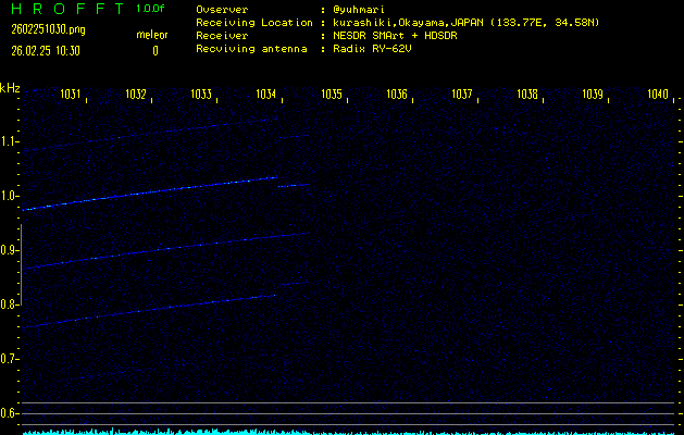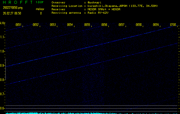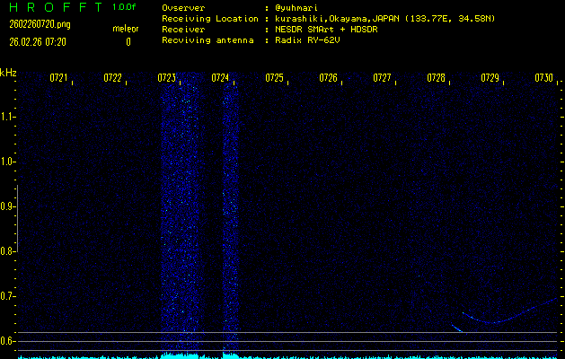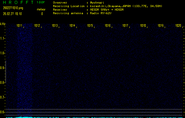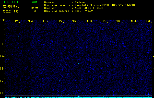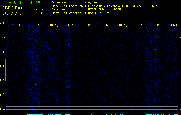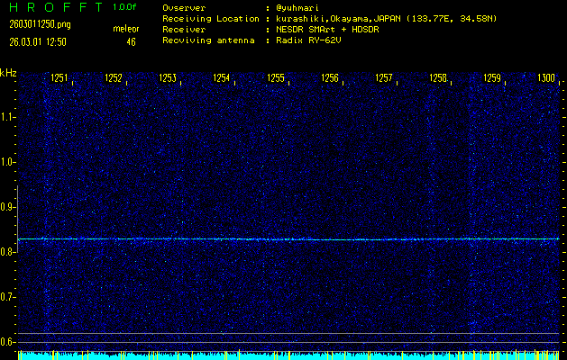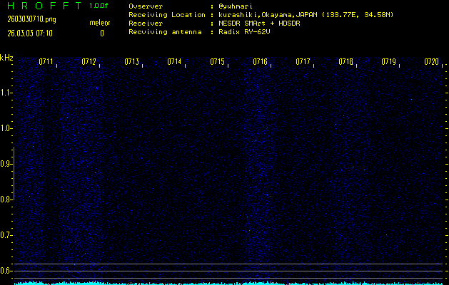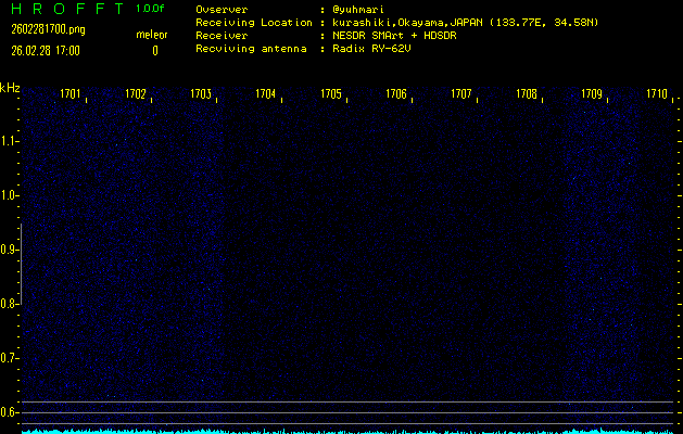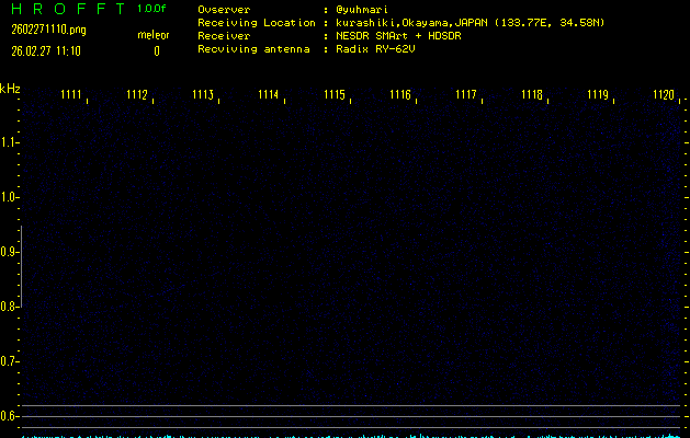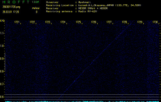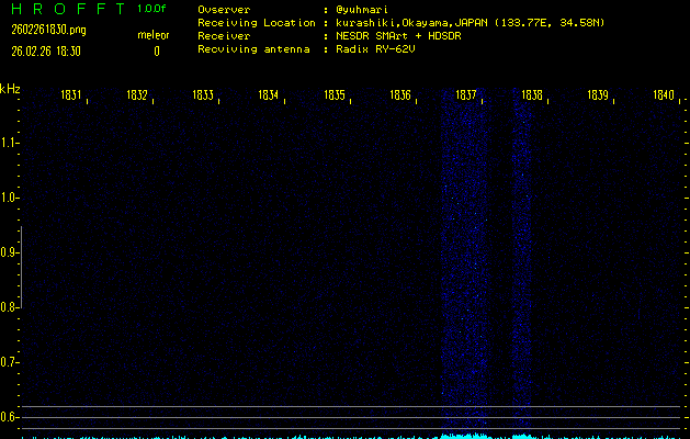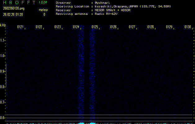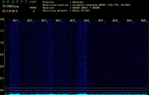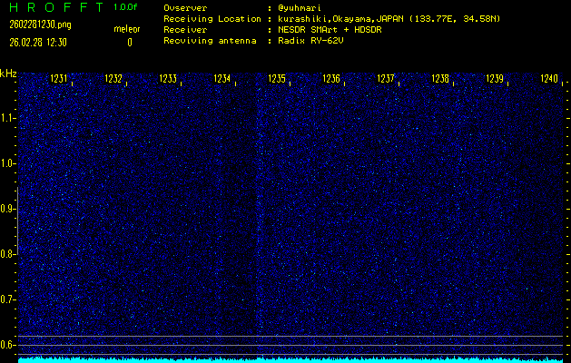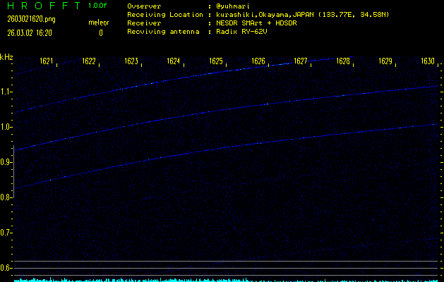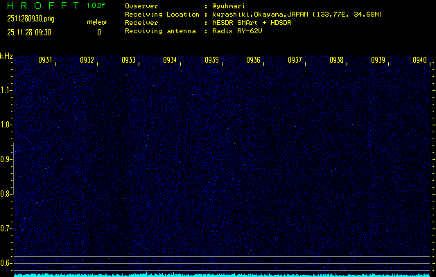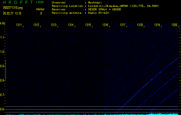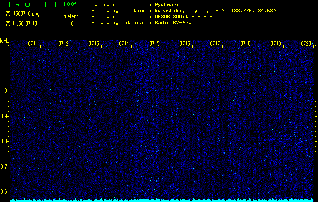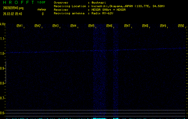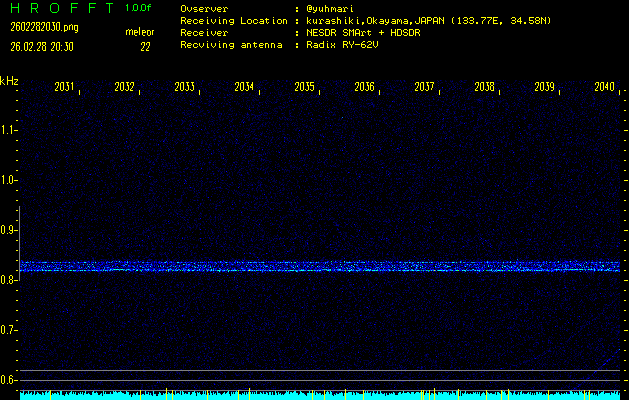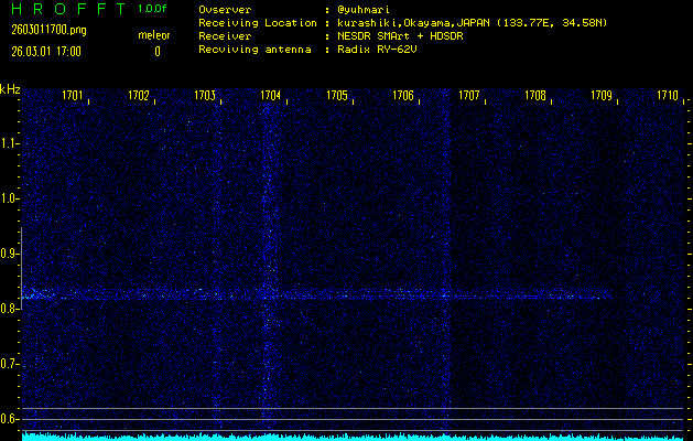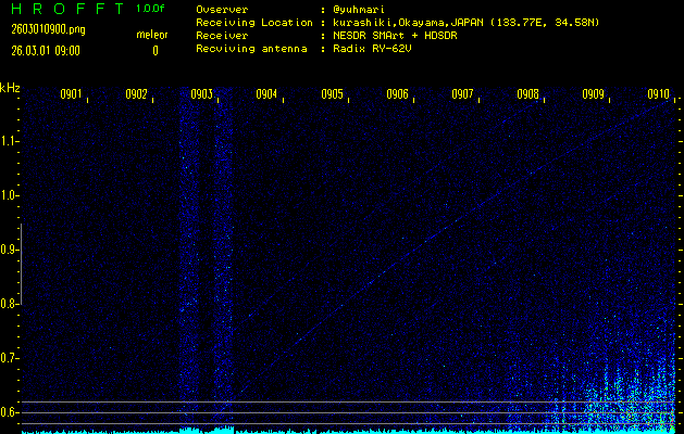 ただいま宮崎大学無線部OB会によって運用されているアマチュア無線50.017MHz(JA6YBR,50/10/1/0.1W,CW)を利用して試験受信を行っています。