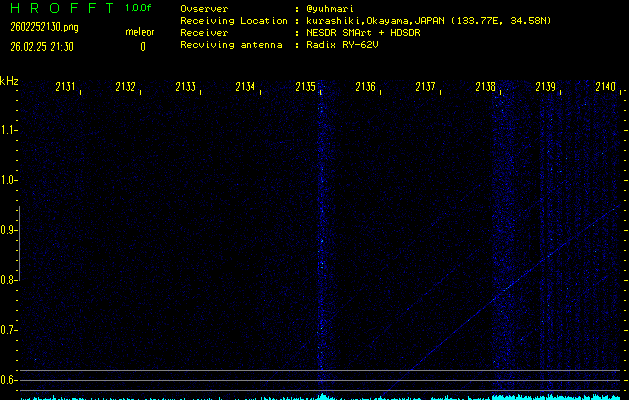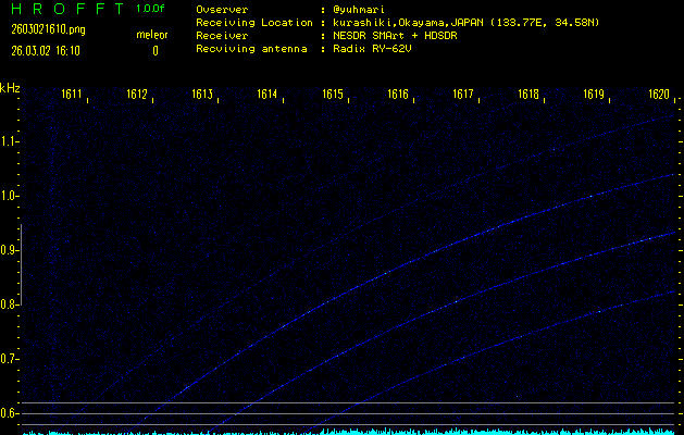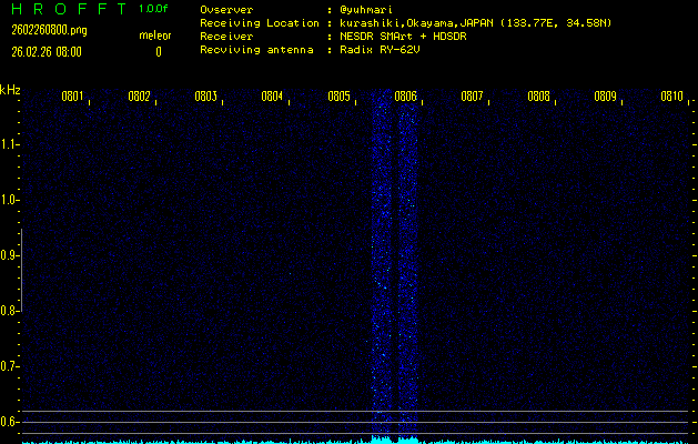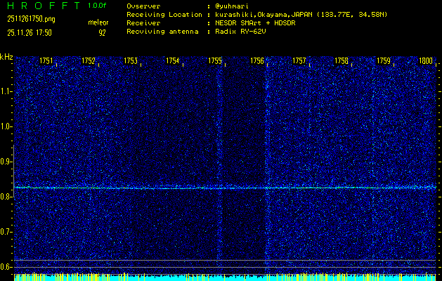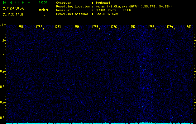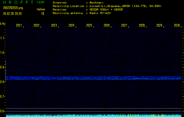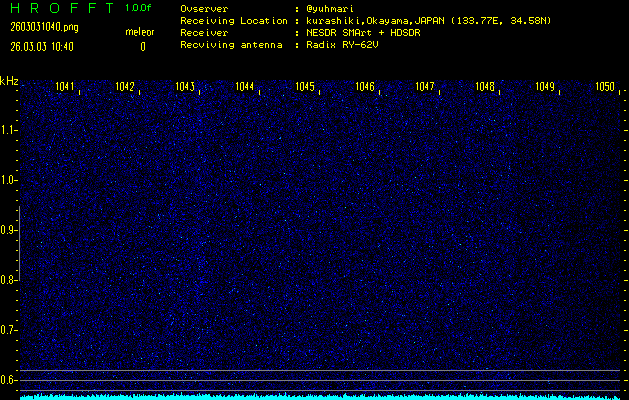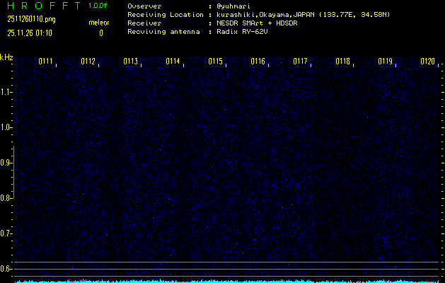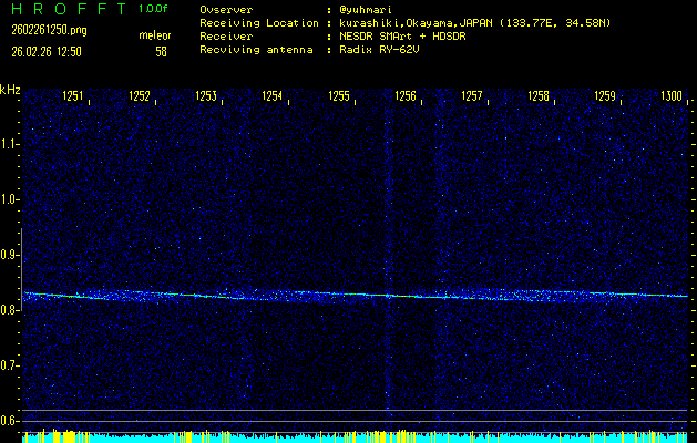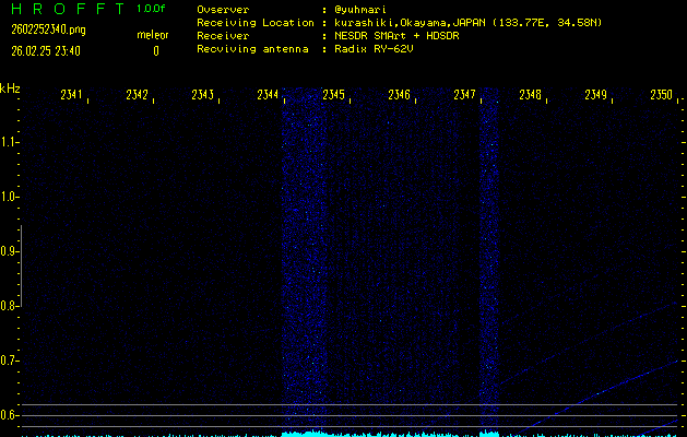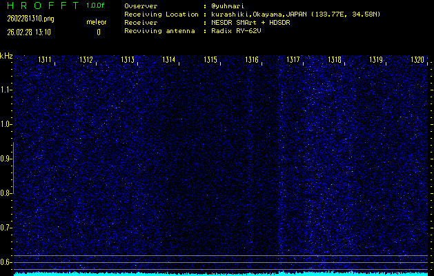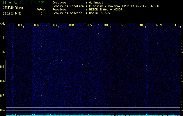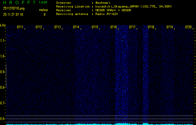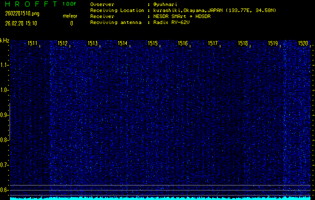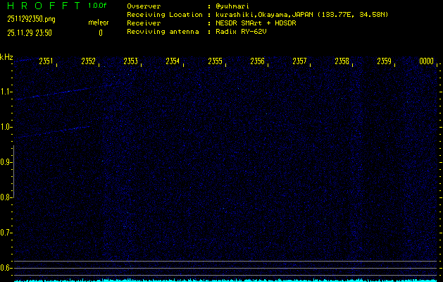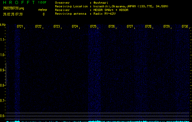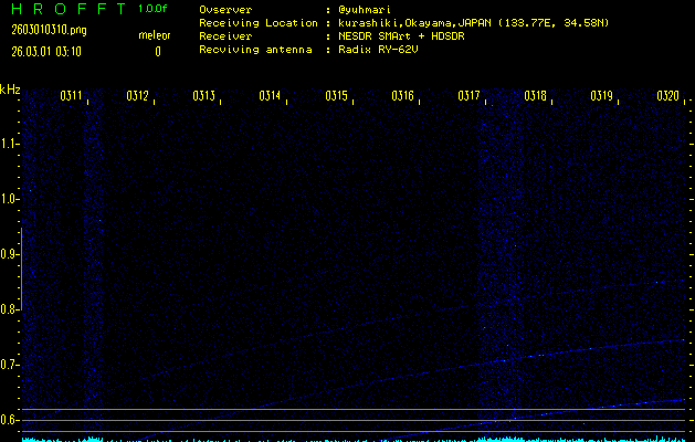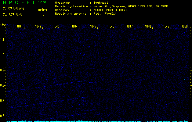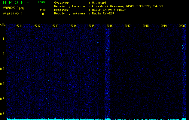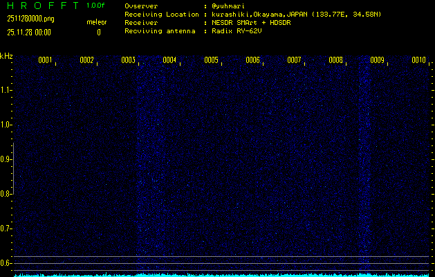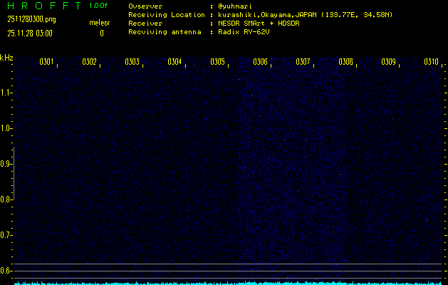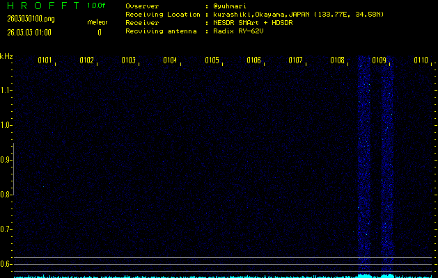 ただいま宮崎大学無線部OB会によって運用されているアマチュア無線50.017MHz(JA6YBR,50/10/1/0.1W,CW)を利用して試験受信を行っています。