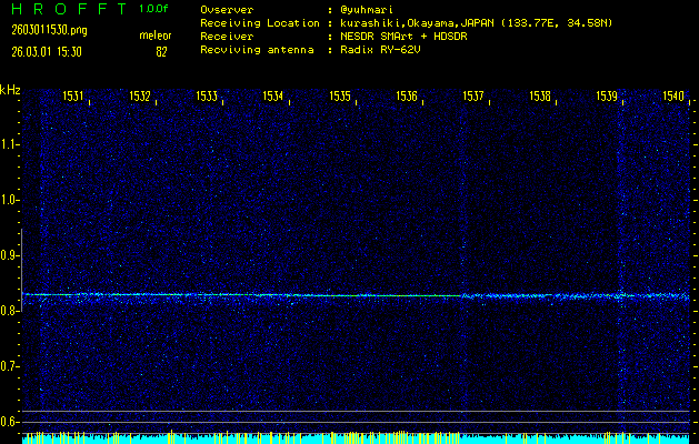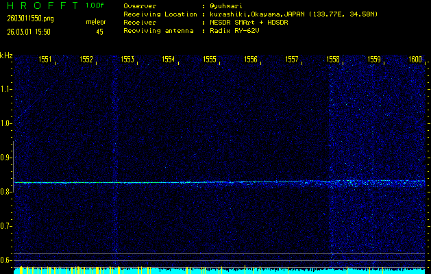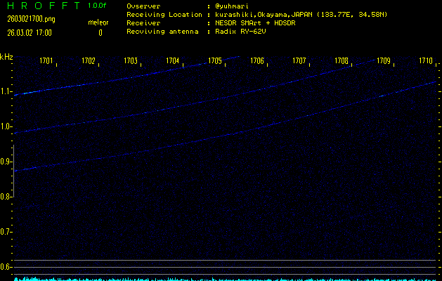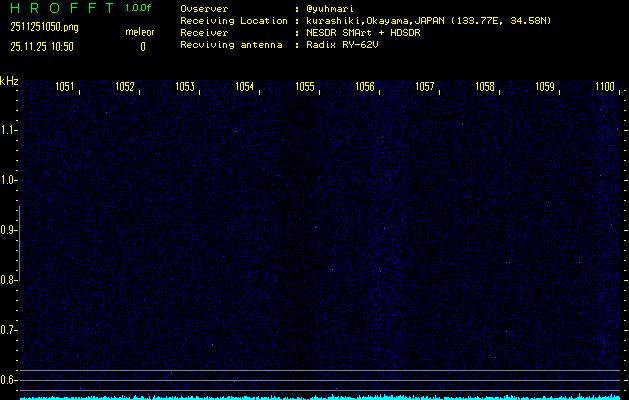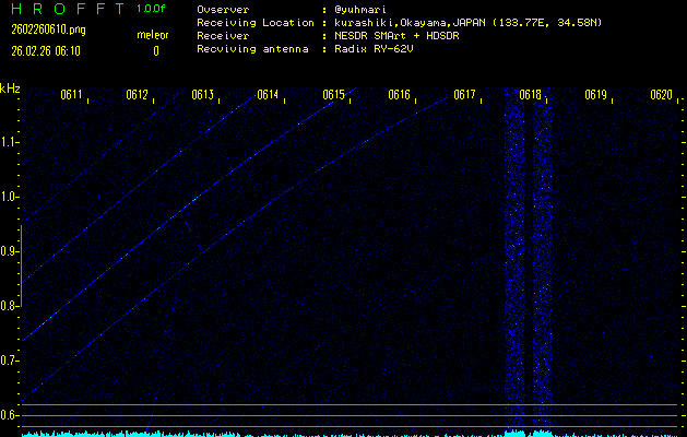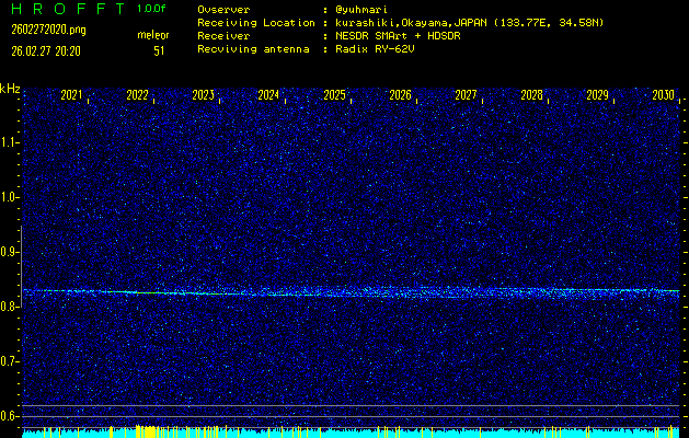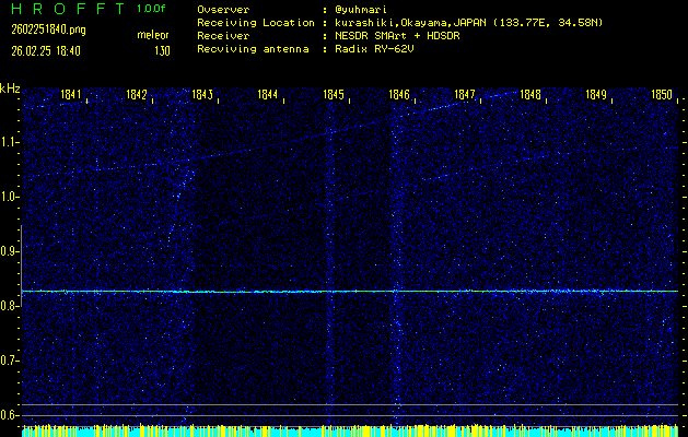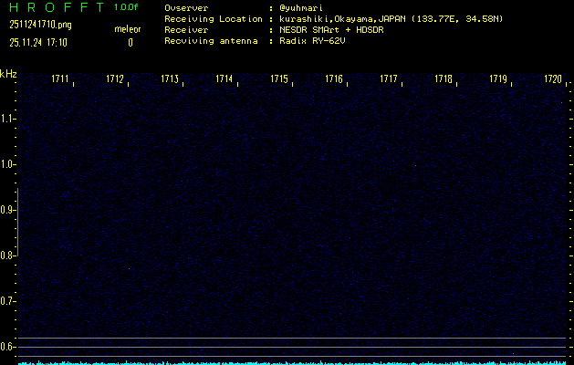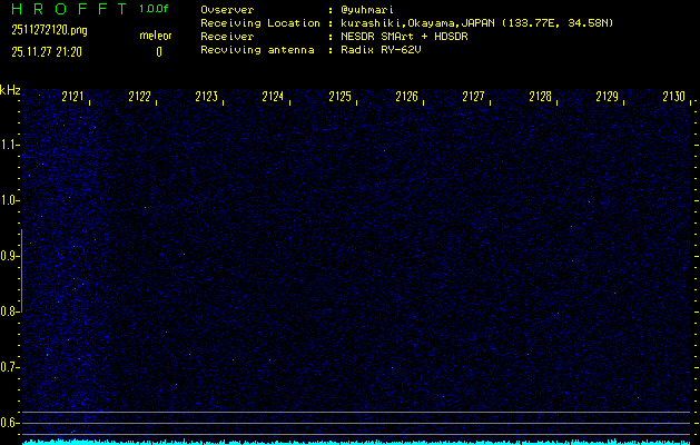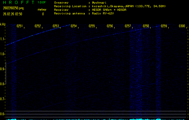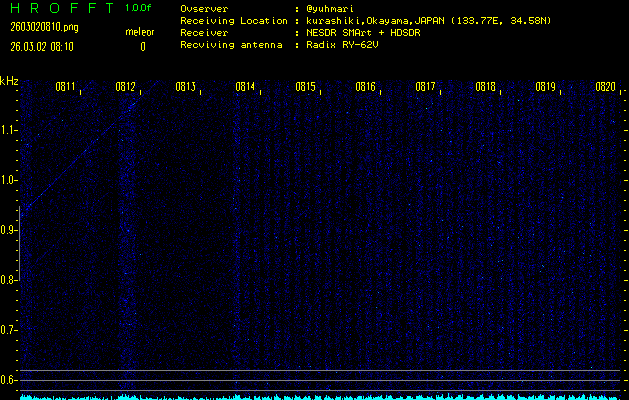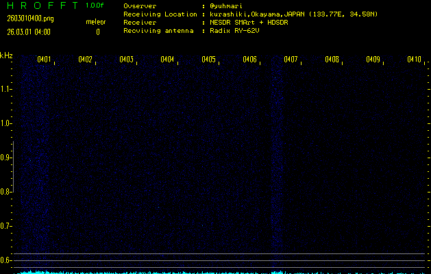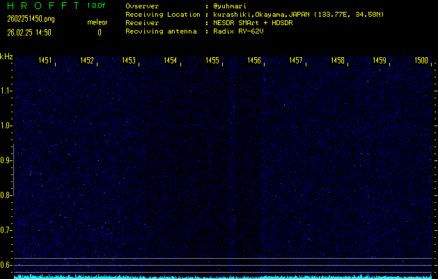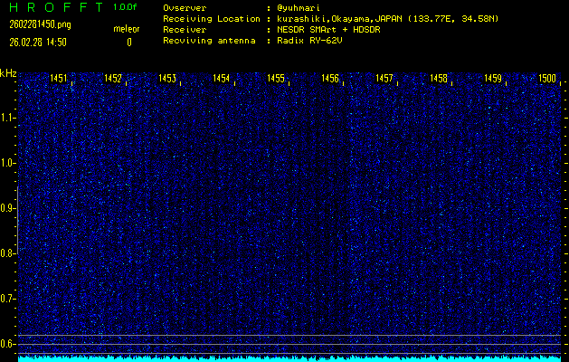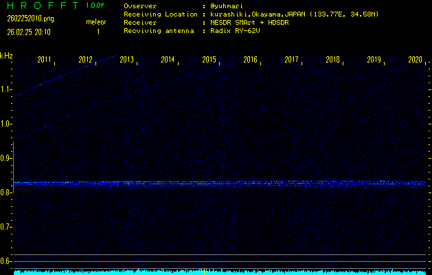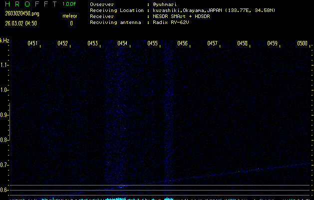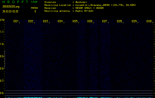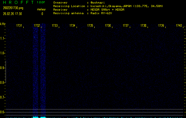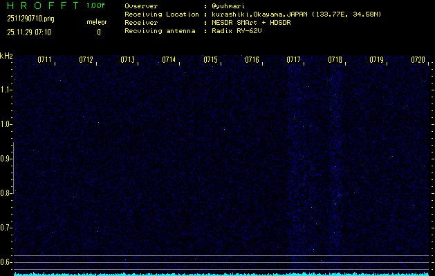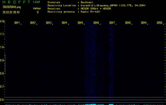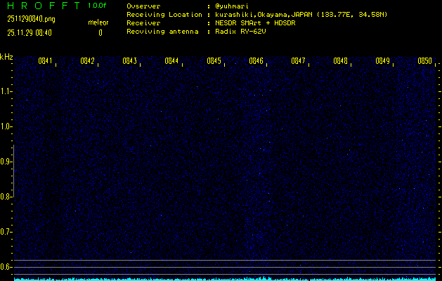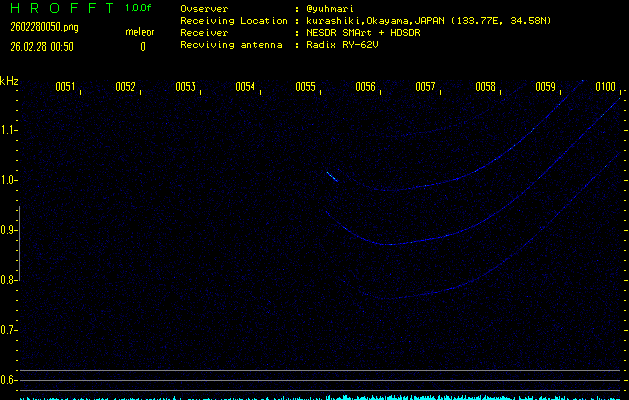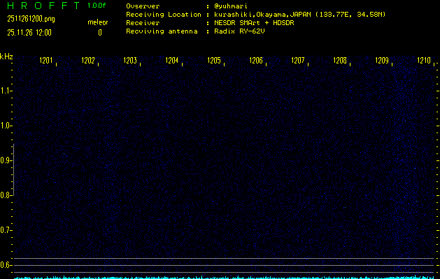 ただいま宮崎大学無線部OB会によって運用されているアマチュア無線50.017MHz(JA6YBR,50/10/1/0.1W,CW)を利用して試験受信を行っています。