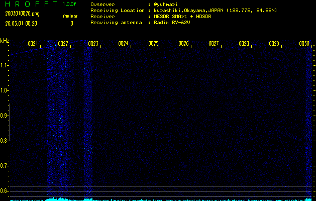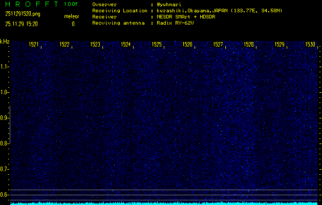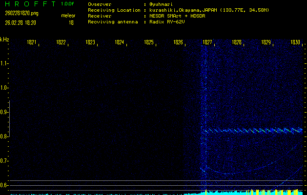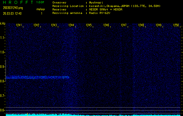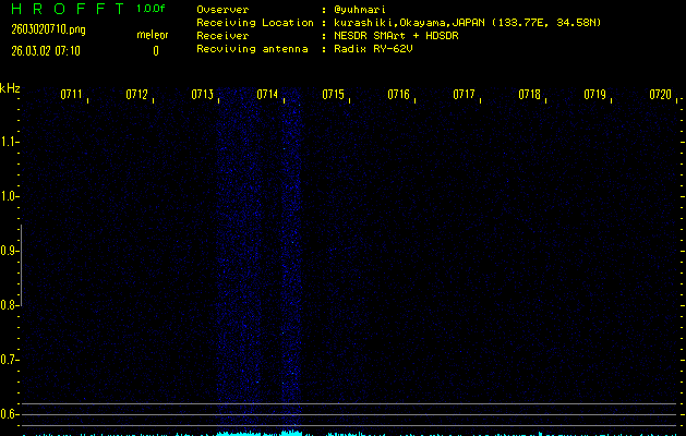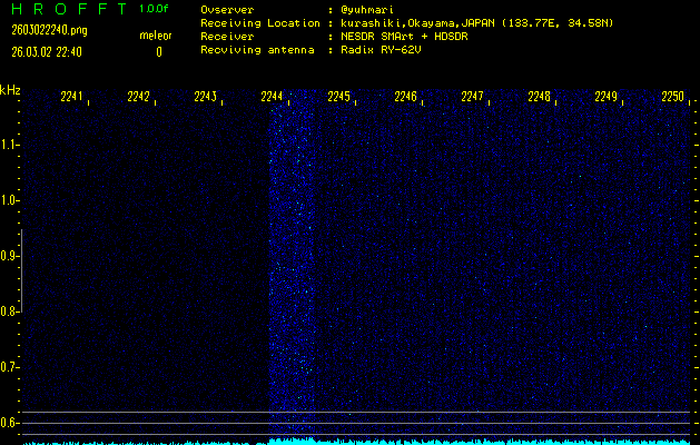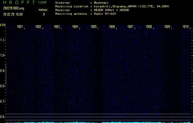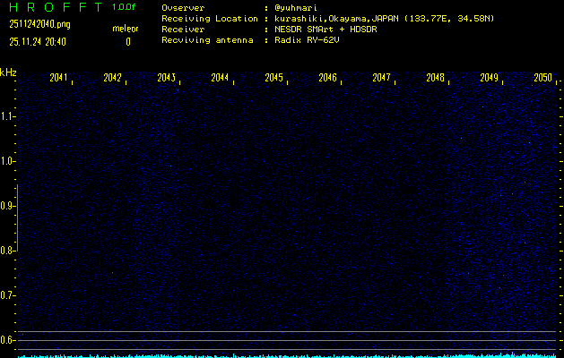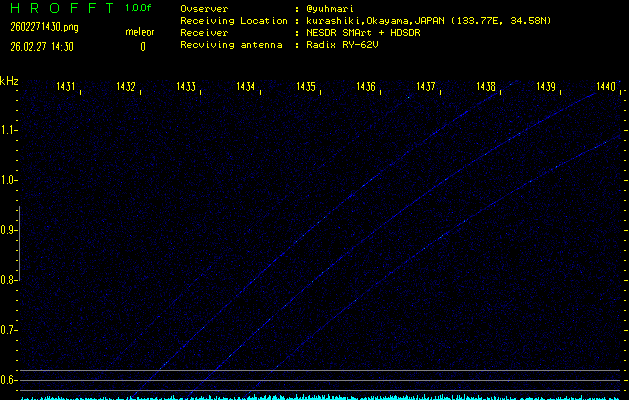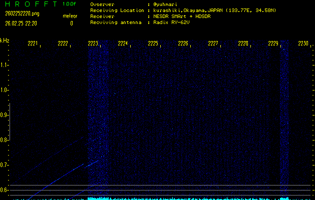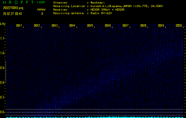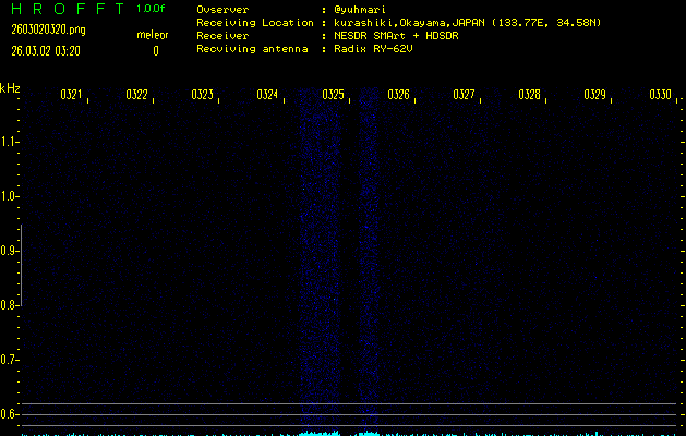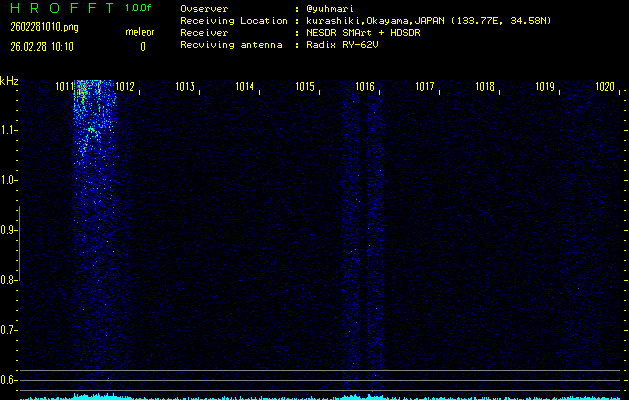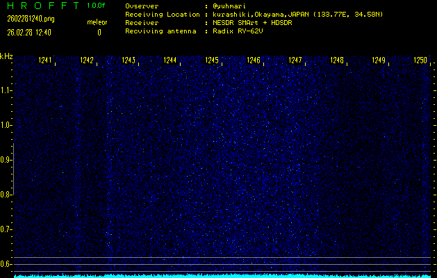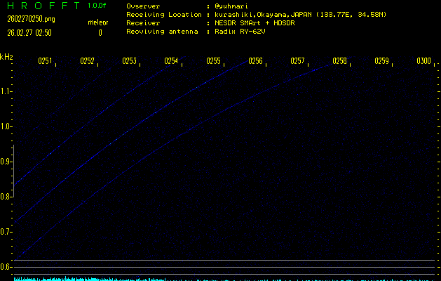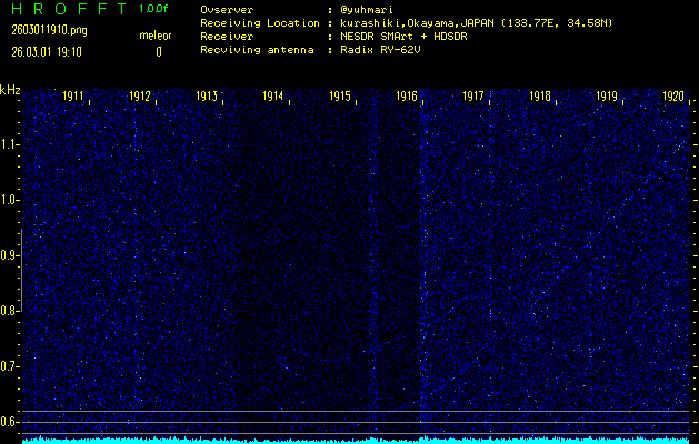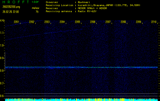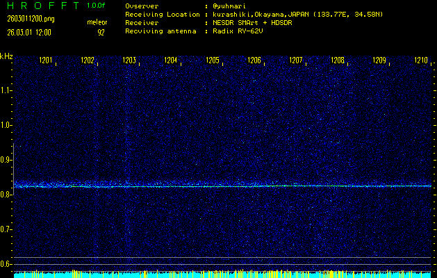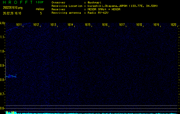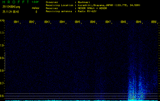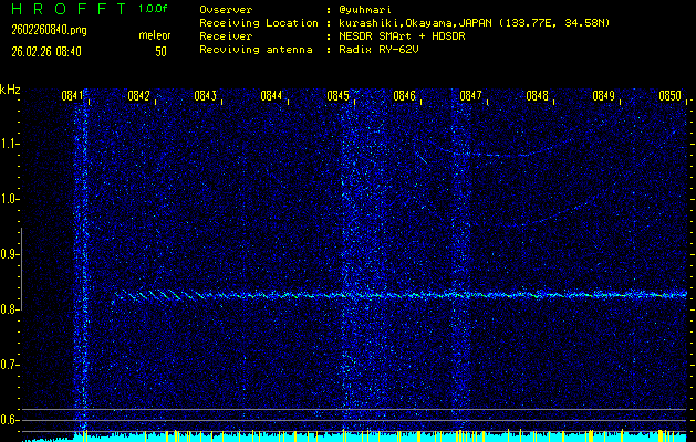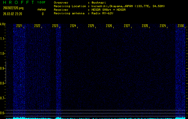 ただいま宮崎大学無線部OB会によって運用されているアマチュア無線50.017MHz(JA6YBR,50/10/1/0.1W,CW)を利用して試験受信を行っています。