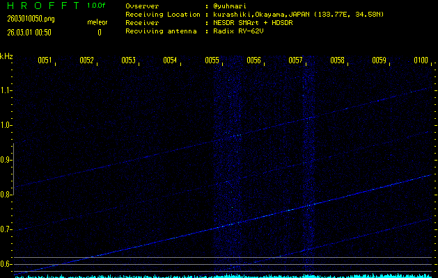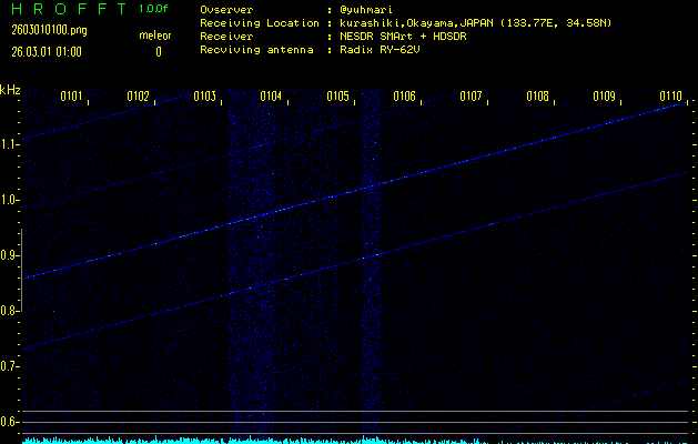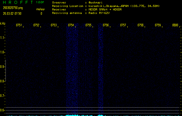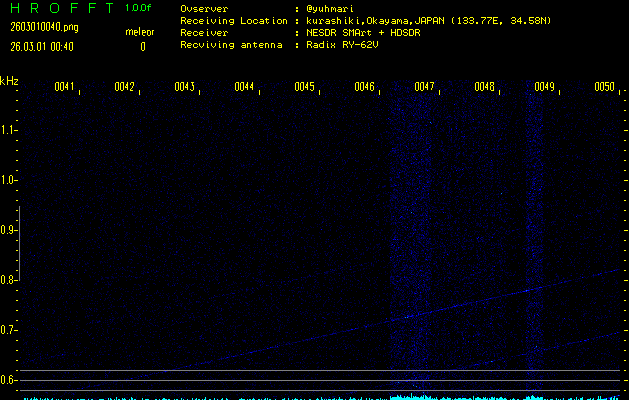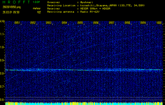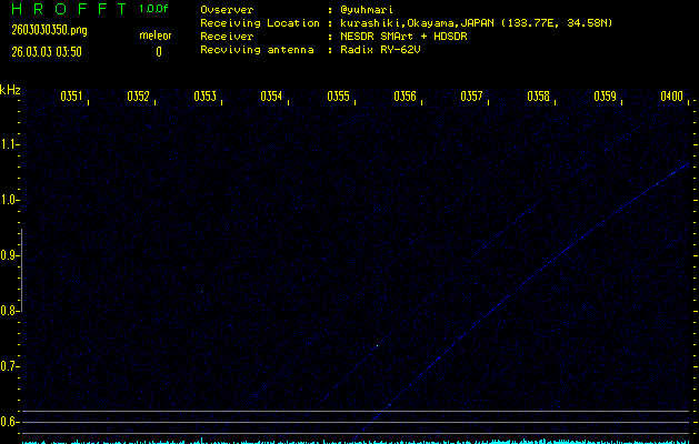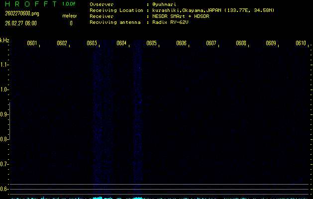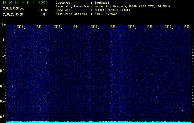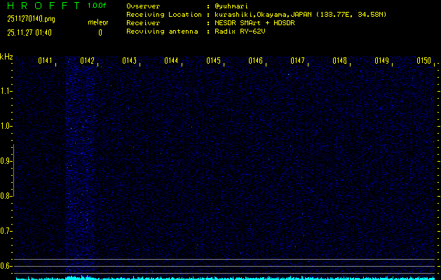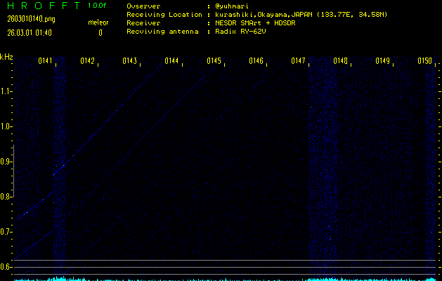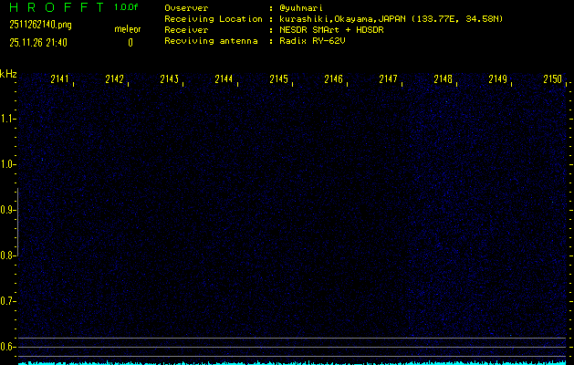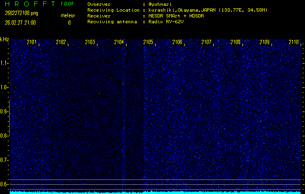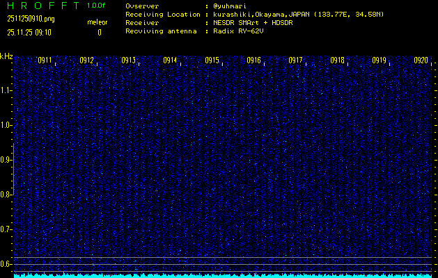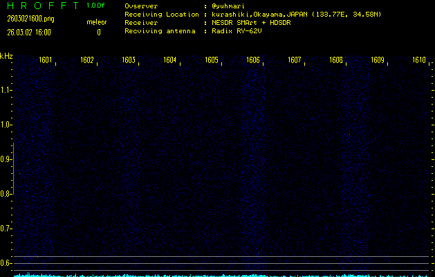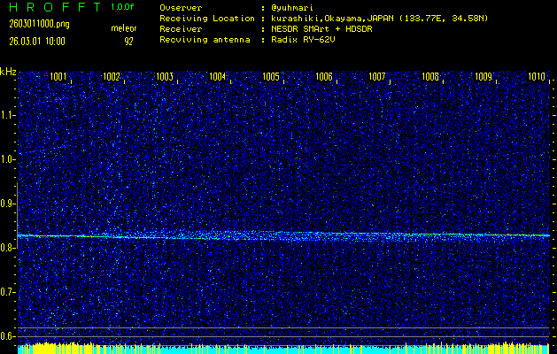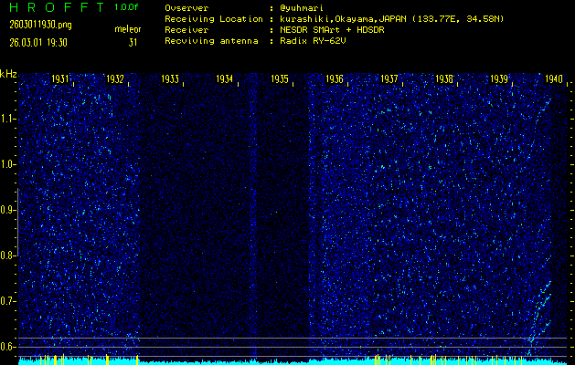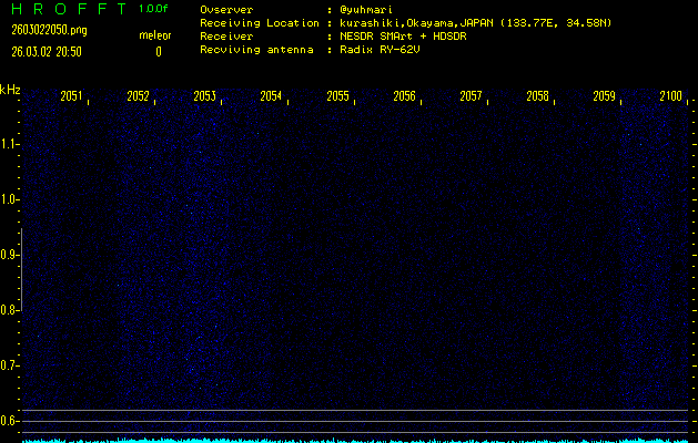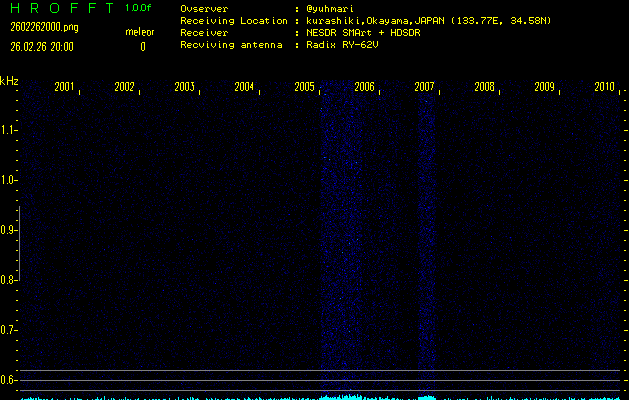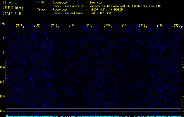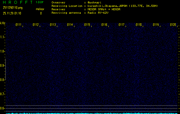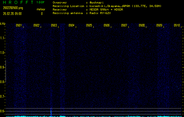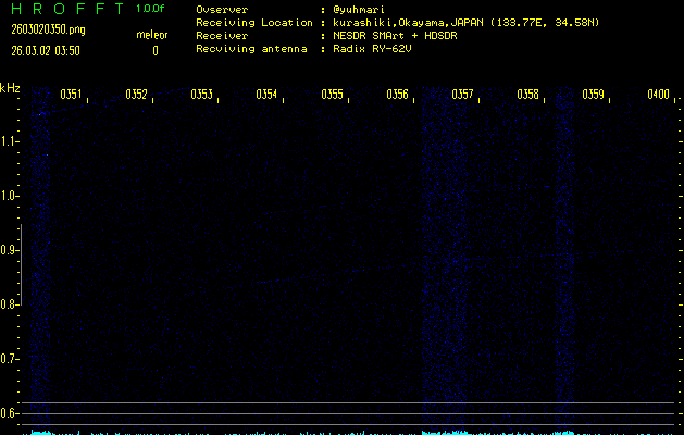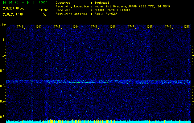 ただいま宮崎大学無線部OB会によって運用されているアマチュア無線50.017MHz(JA6YBR,50/10/1/0.1W,CW)を利用して試験受信を行っています。