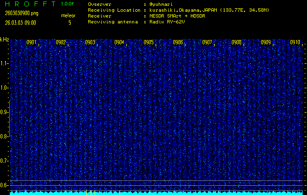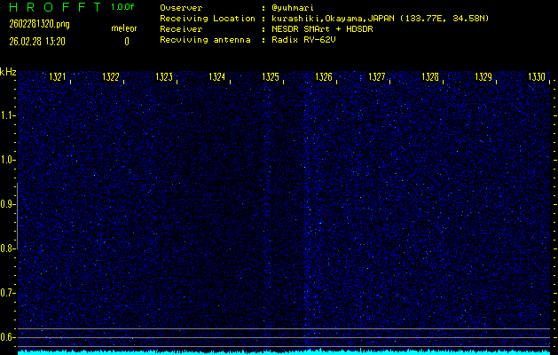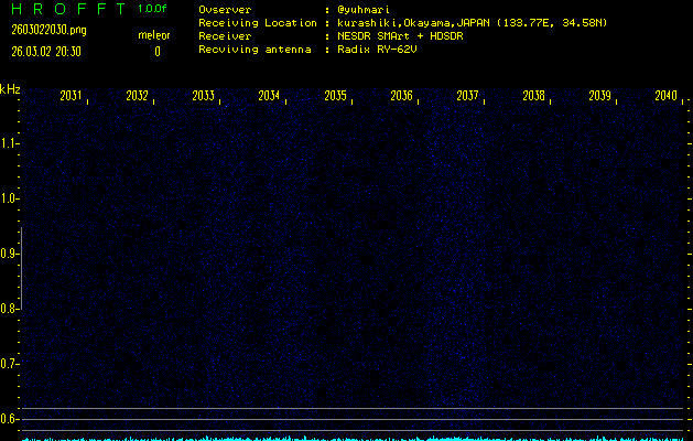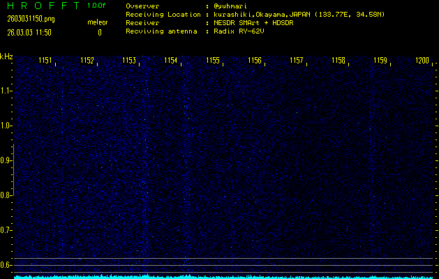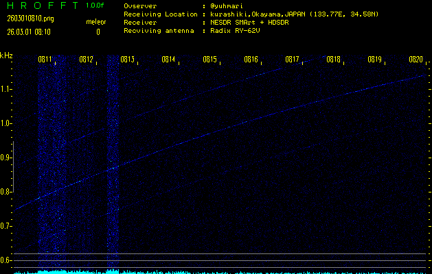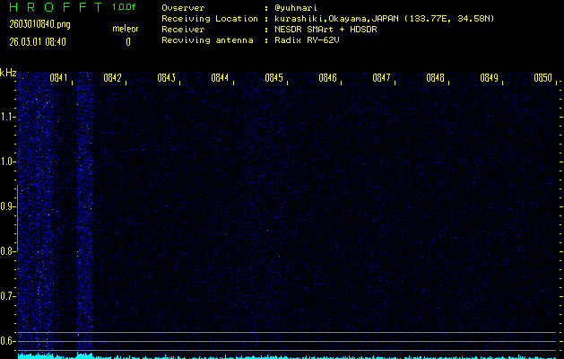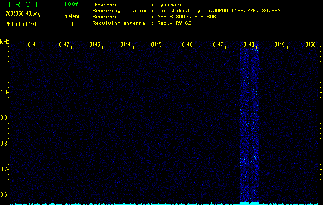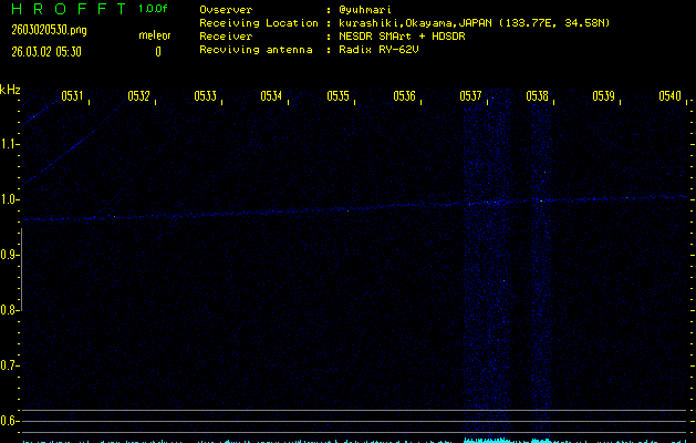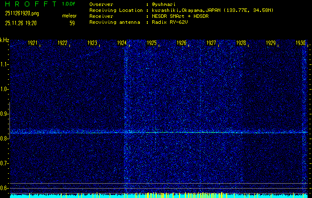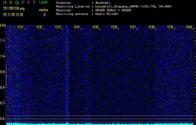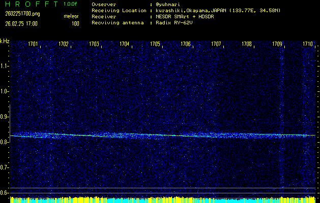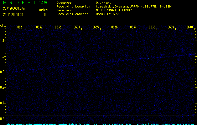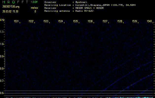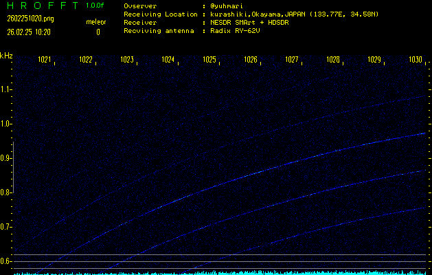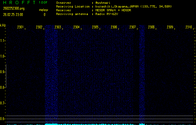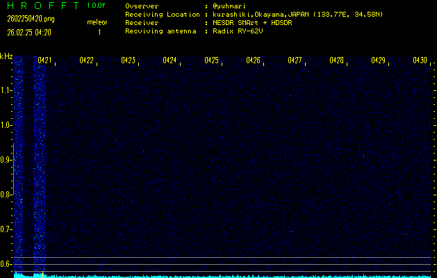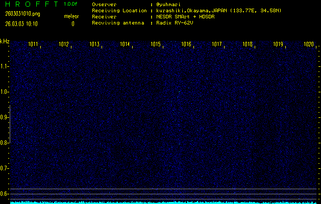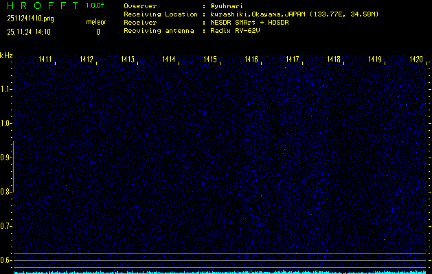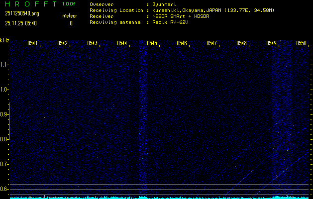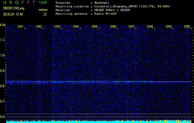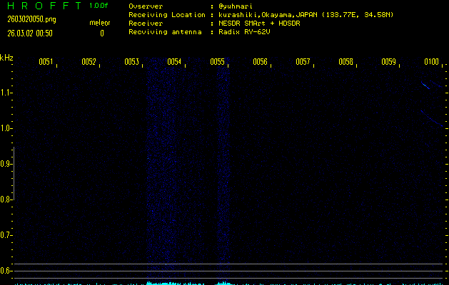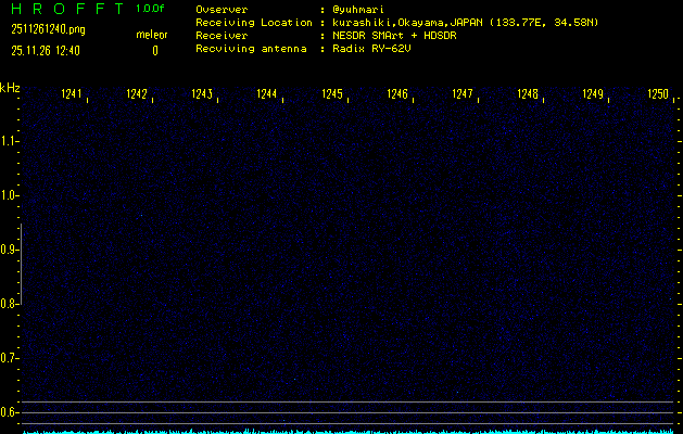 ただいま宮崎大学無線部OB会によって運用されているアマチュア無線50.017MHz(JA6YBR,50/10/1/0.1W,CW)を利用して試験受信を行っています。