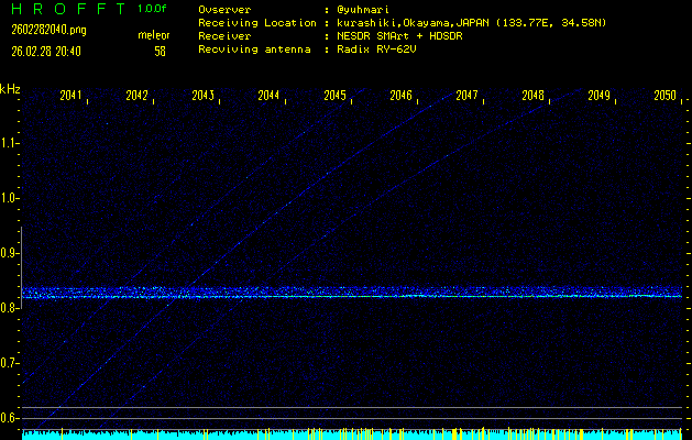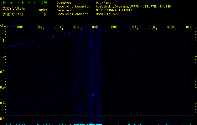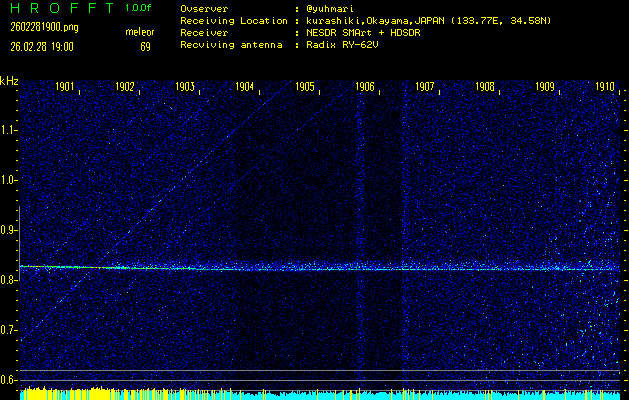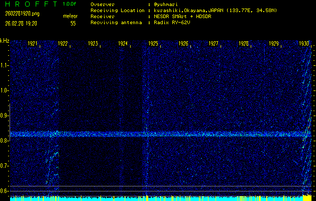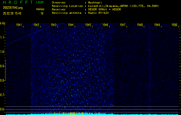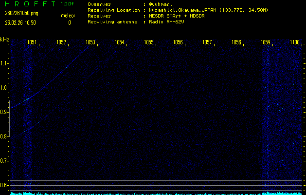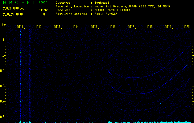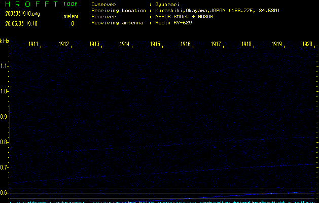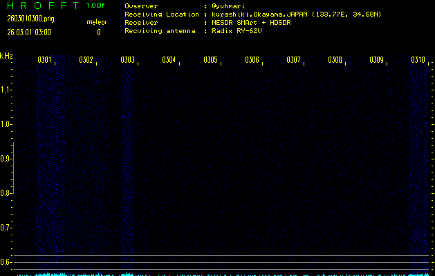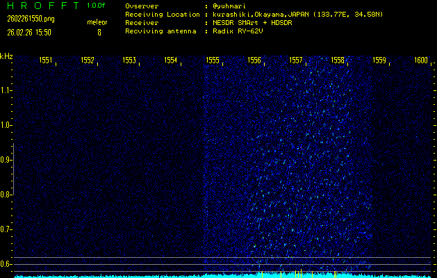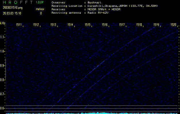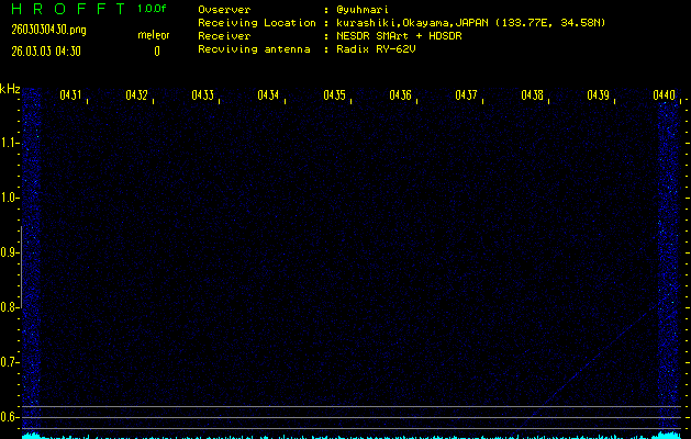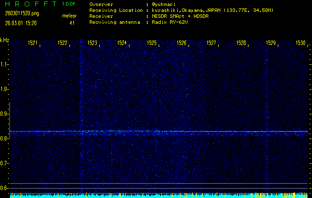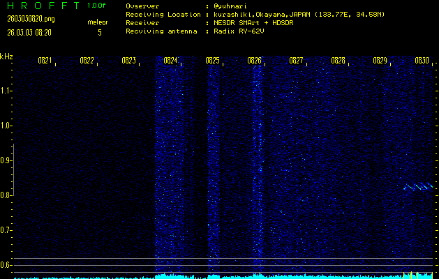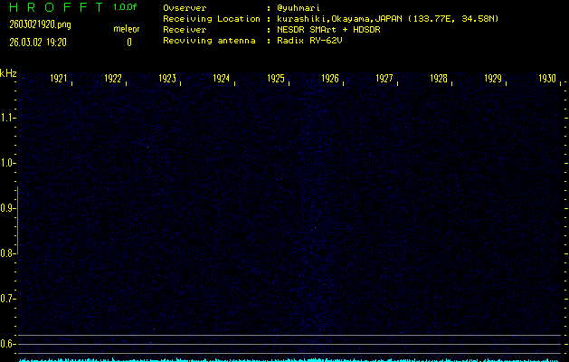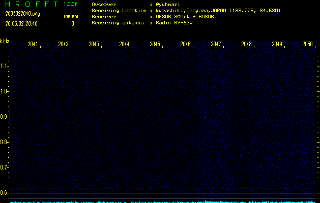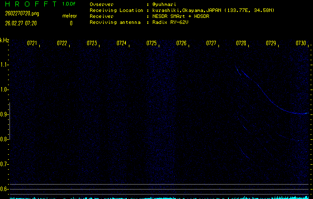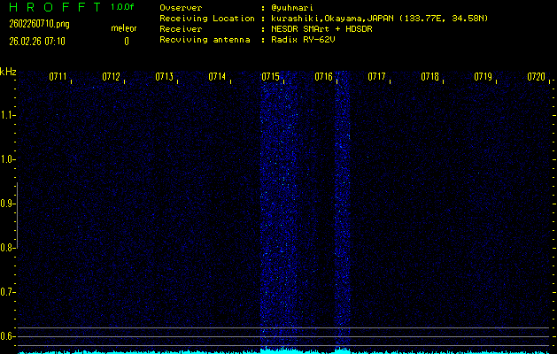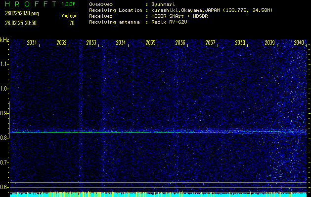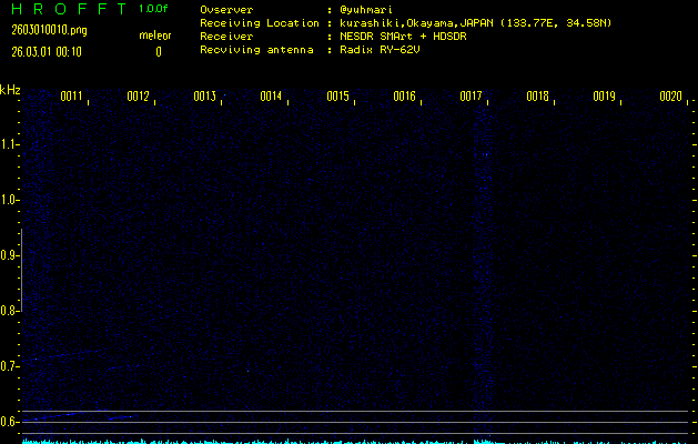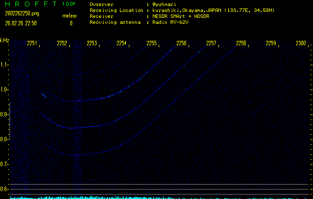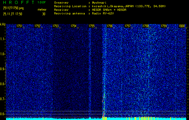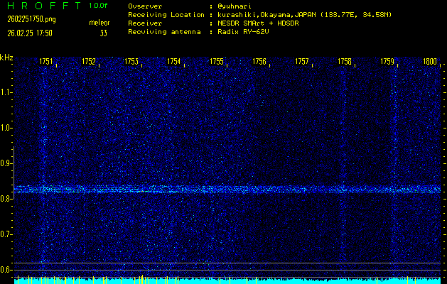 ただいま宮崎大学無線部OB会によって運用されているアマチュア無線50.017MHz(JA6YBR,50/10/1/0.1W,CW)を利用して試験受信を行っています。