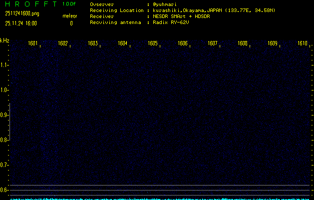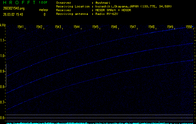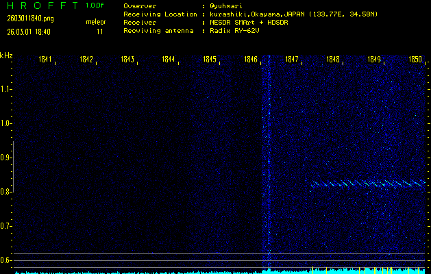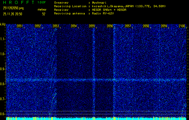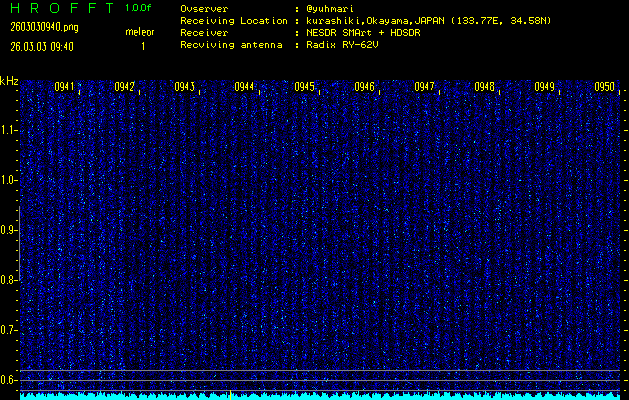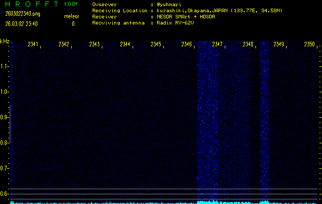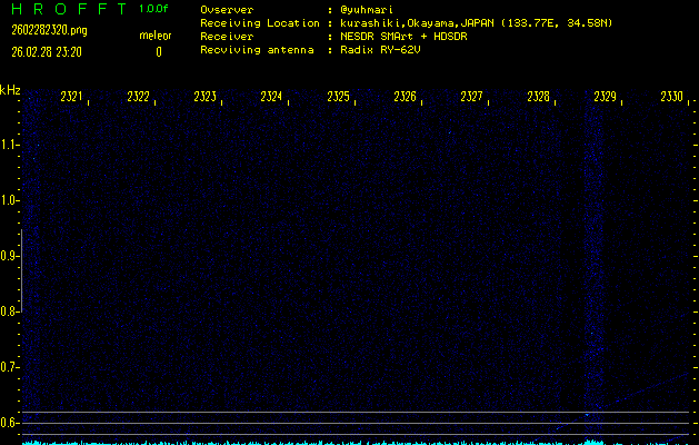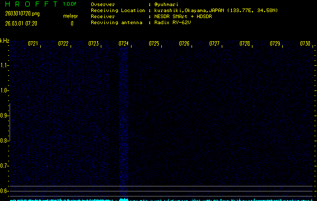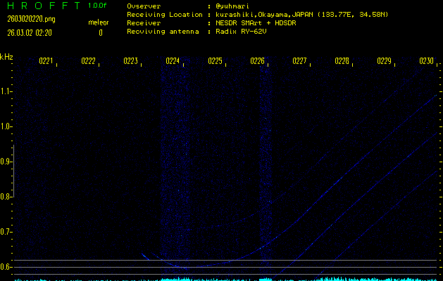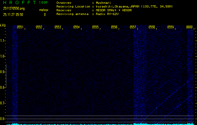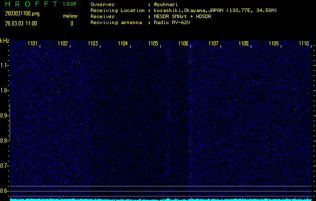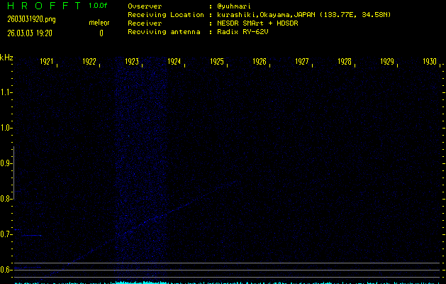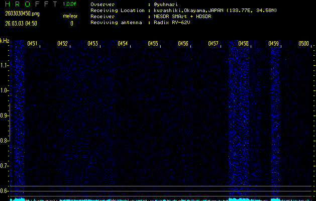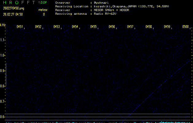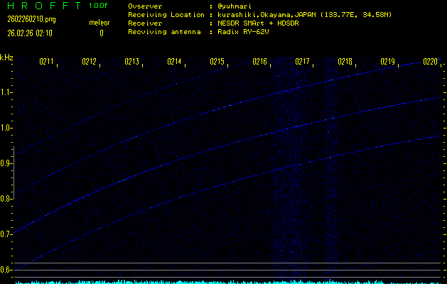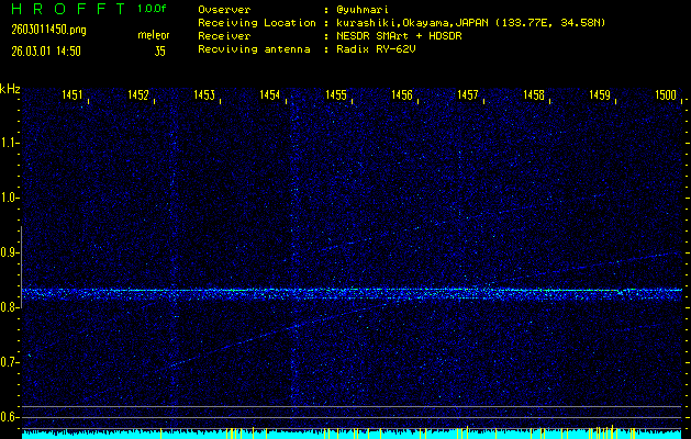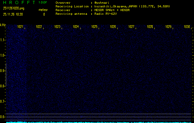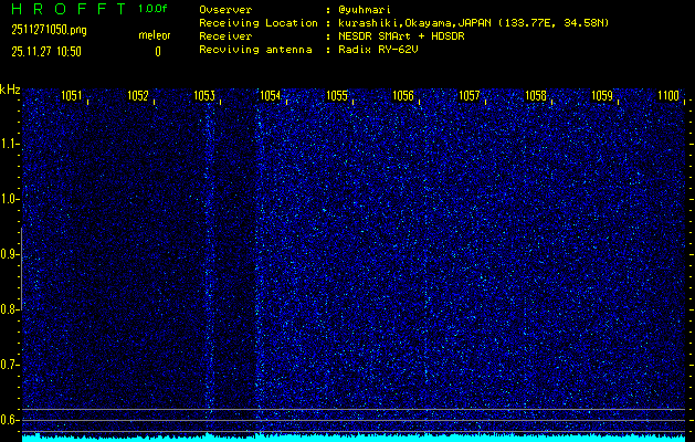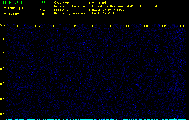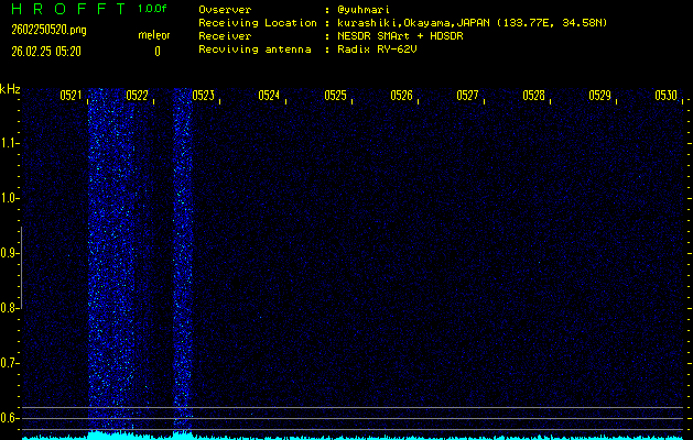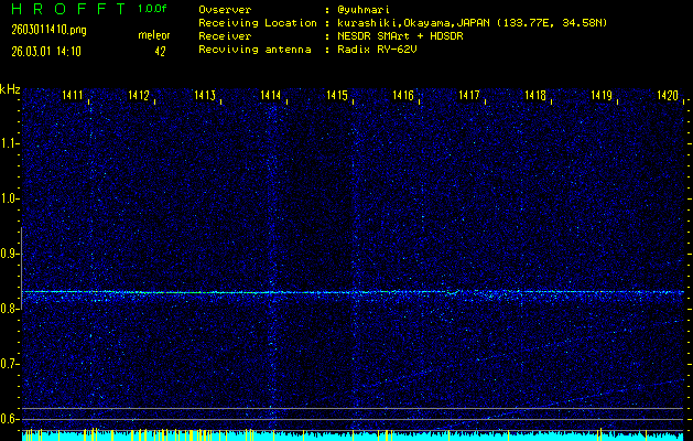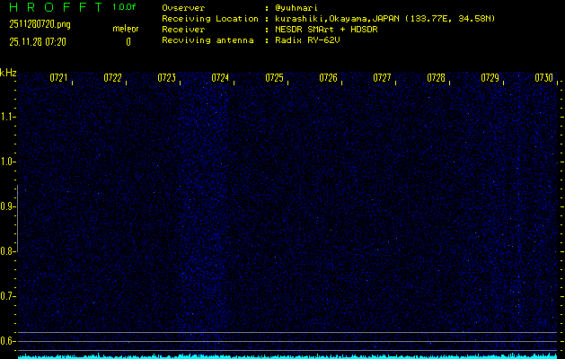 ただいま宮崎大学無線部OB会によって運用されているアマチュア無線50.017MHz(JA6YBR,50/10/1/0.1W,CW)を利用して試験受信を行っています。