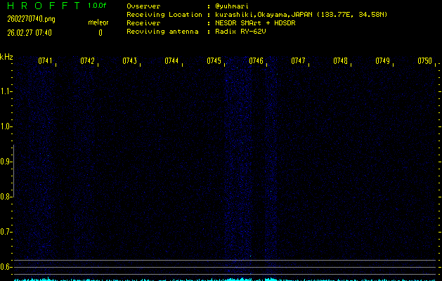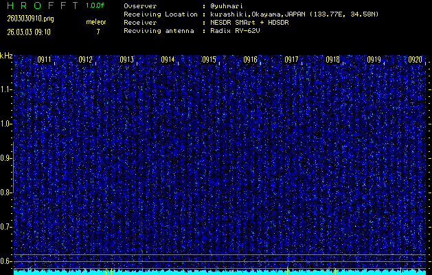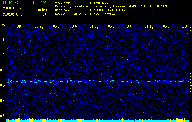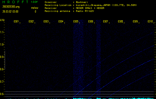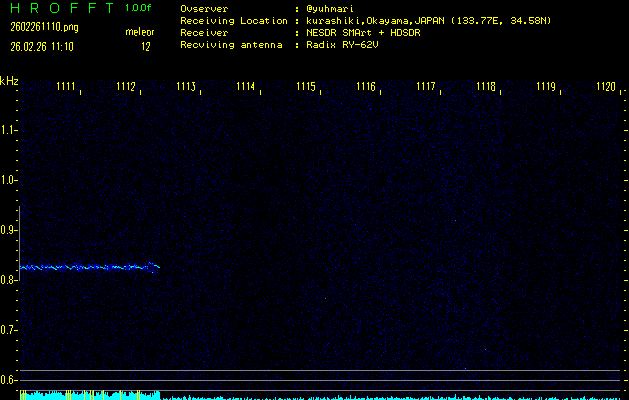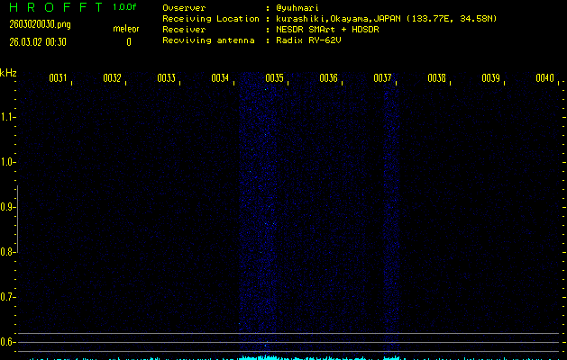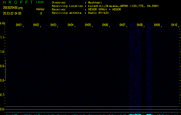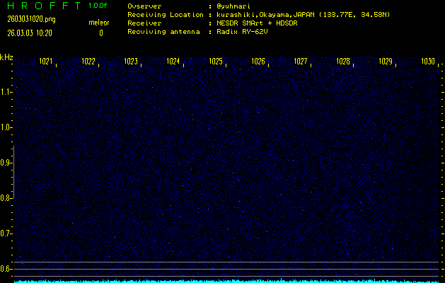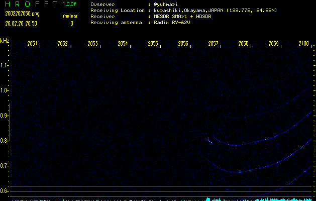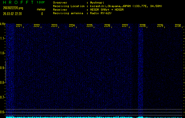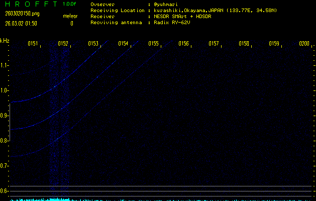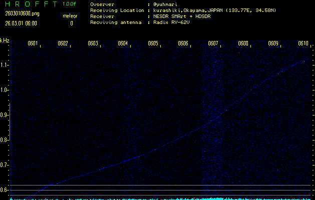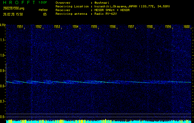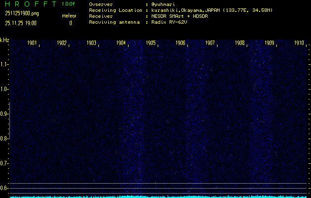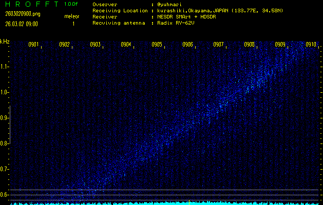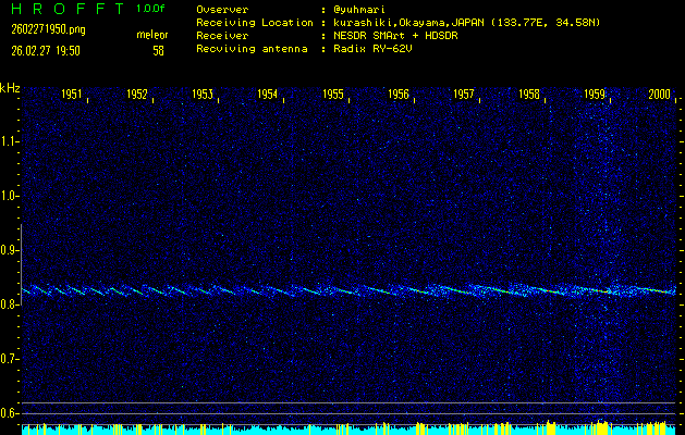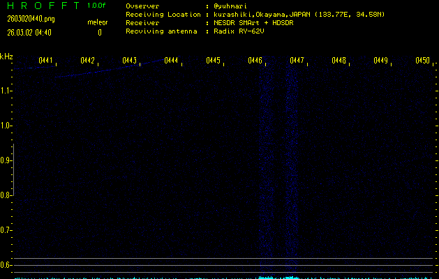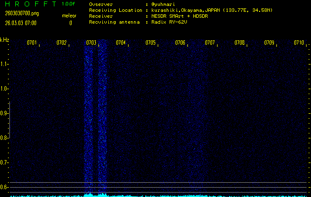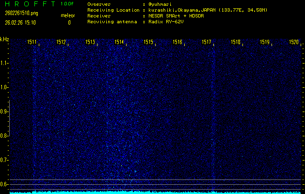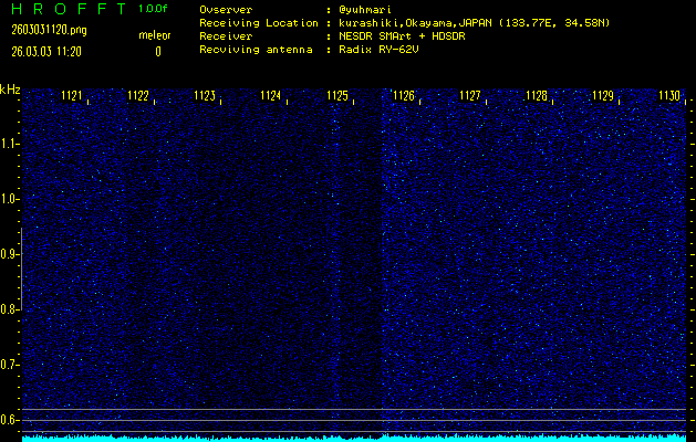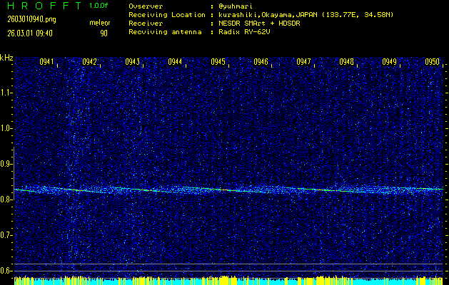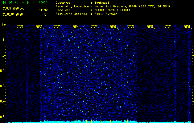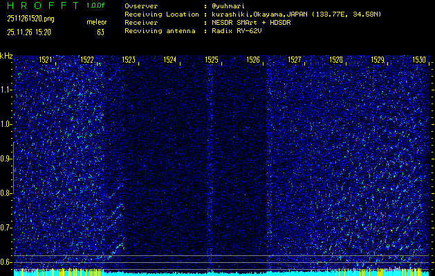 ただいま宮崎大学無線部OB会によって運用されているアマチュア無線50.017MHz(JA6YBR,50/10/1/0.1W,CW)を利用して試験受信を行っています。
