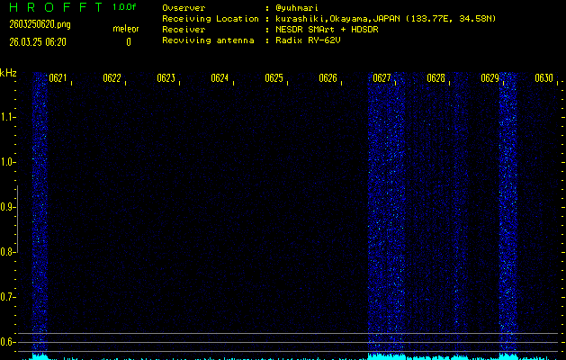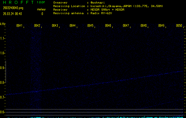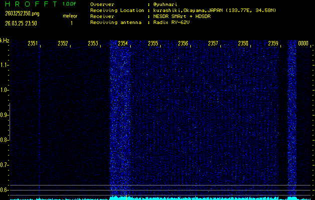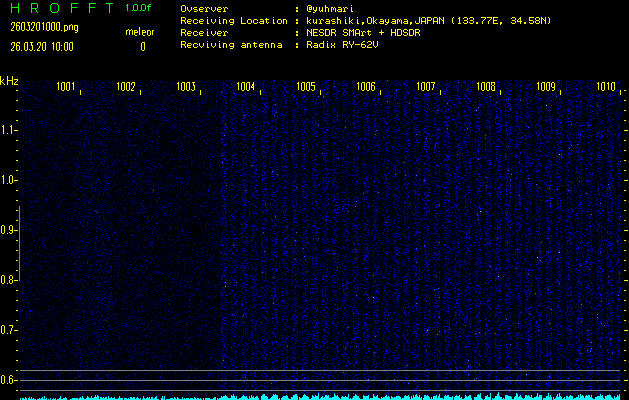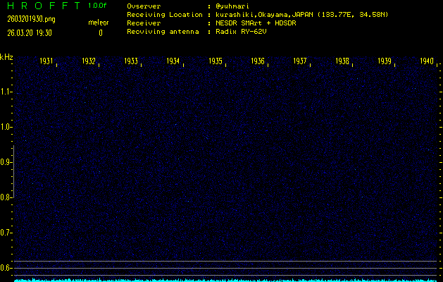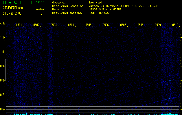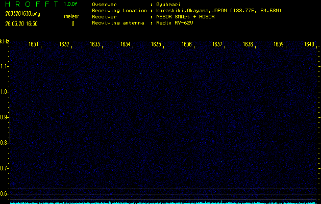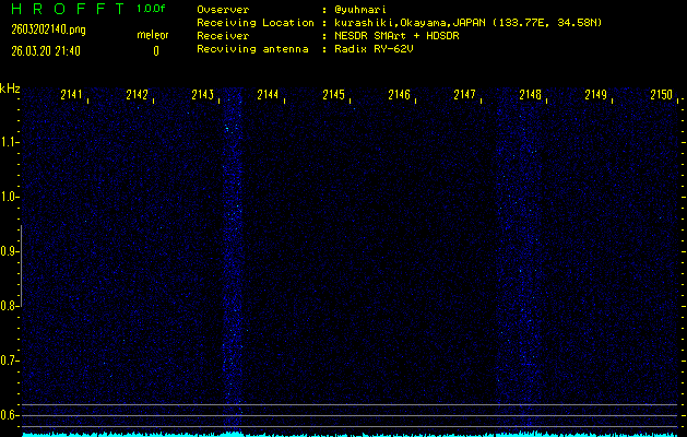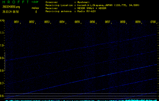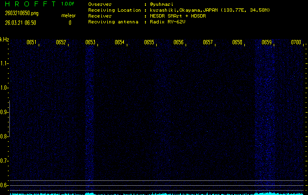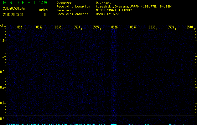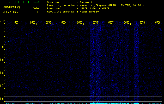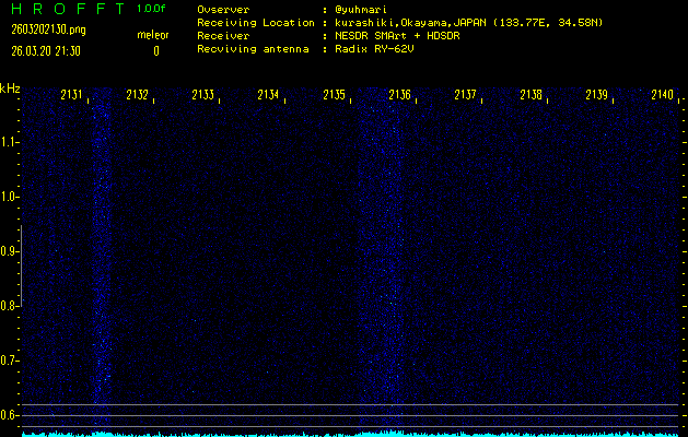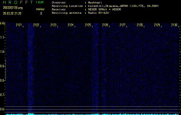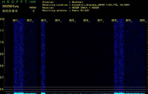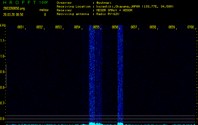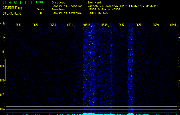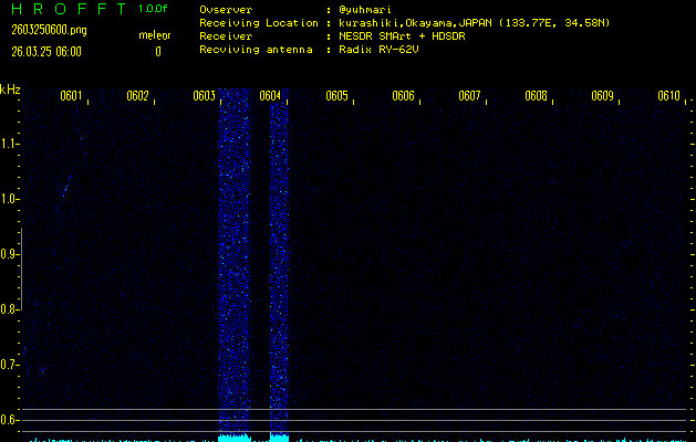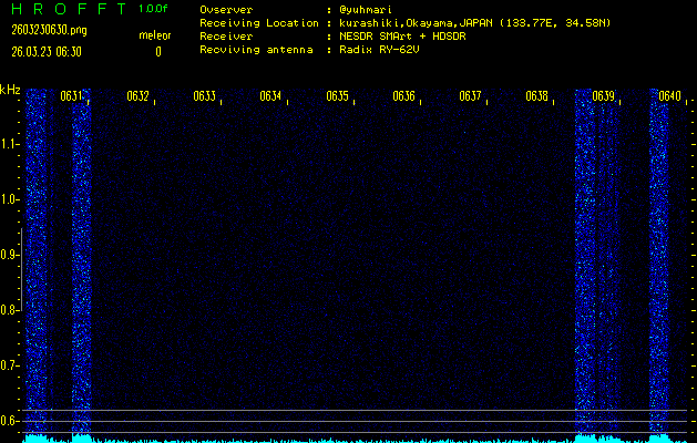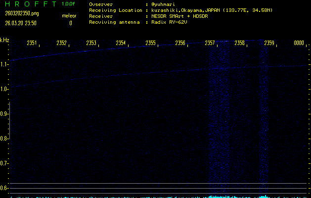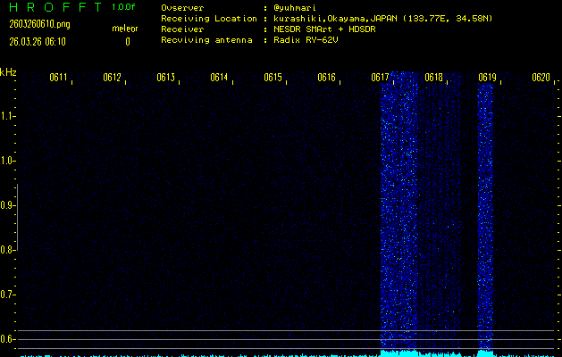 ただいま宮崎大学無線部OB会によって運用されているアマチュア無線50.017MHz(JA6YBR,50/10/1/0.1W,CW)を利用して試験受信を行っています。