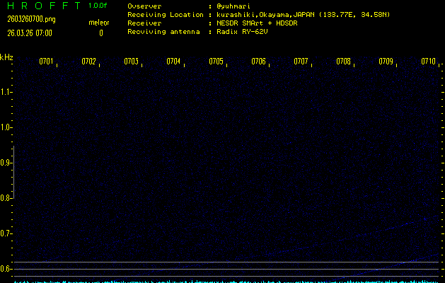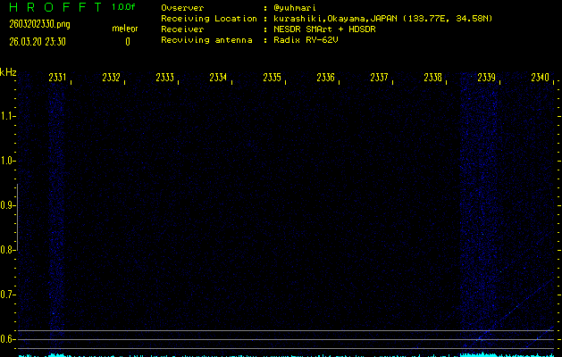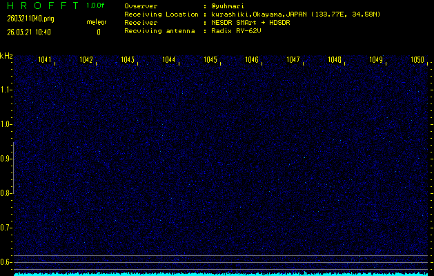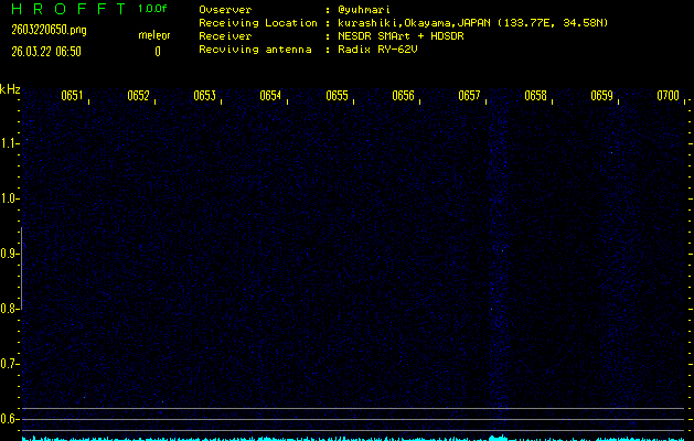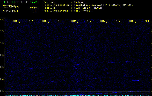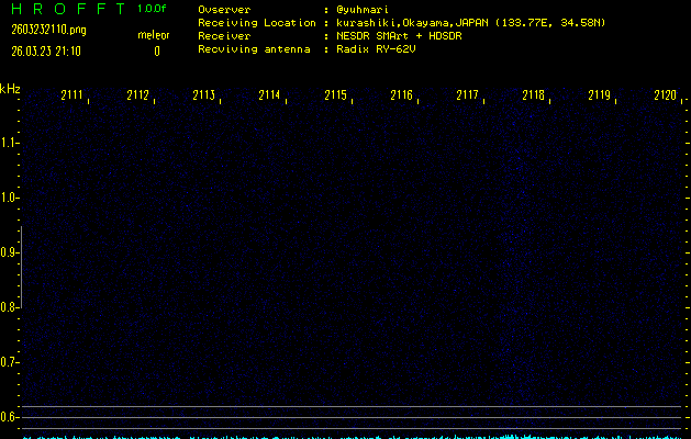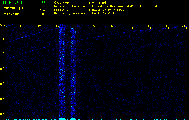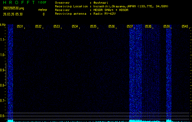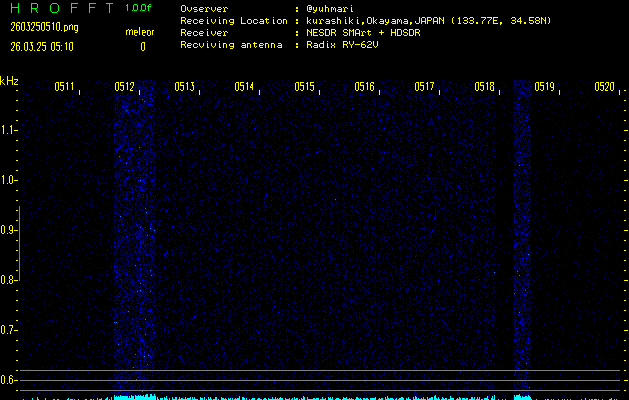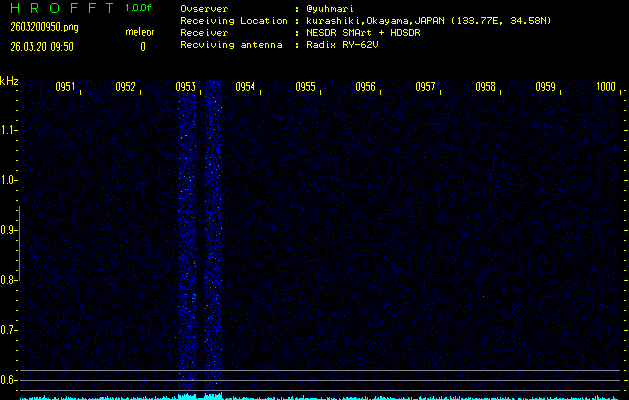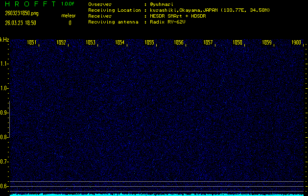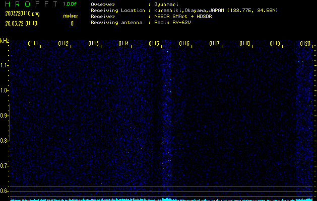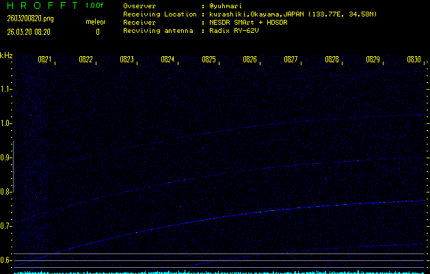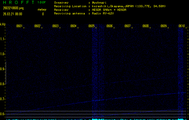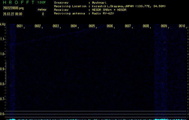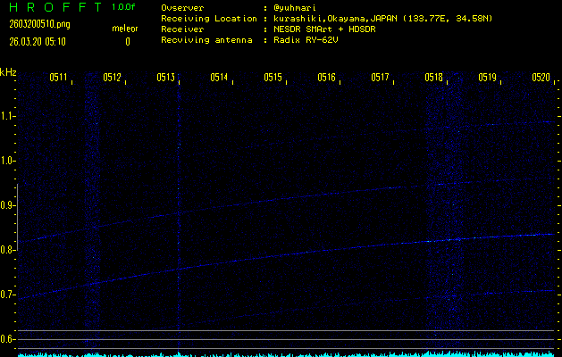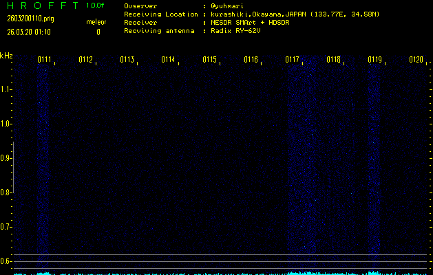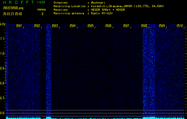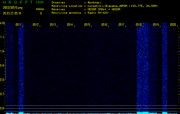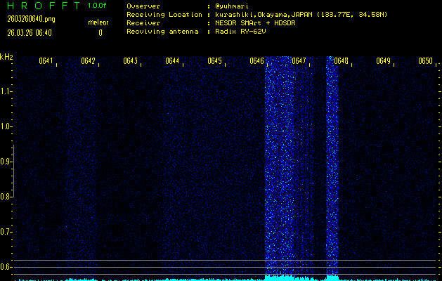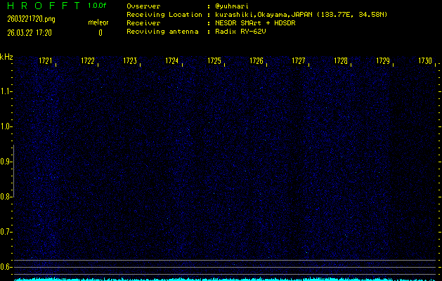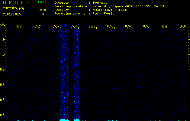 ただいま宮崎大学無線部OB会によって運用されているアマチュア無線50.017MHz(JA6YBR,50/10/1/0.1W,CW)を利用して試験受信を行っています。