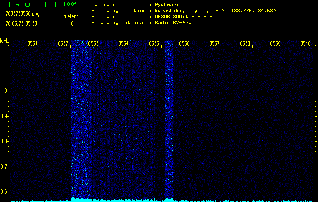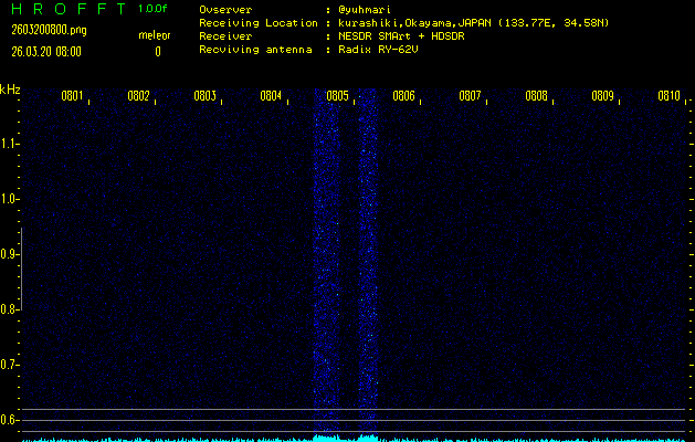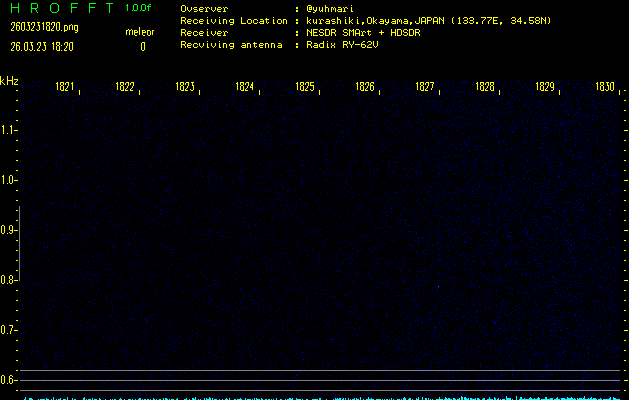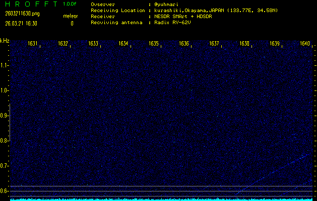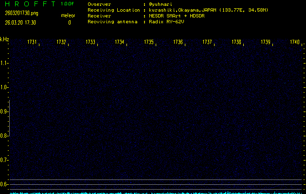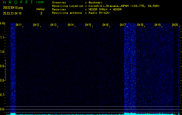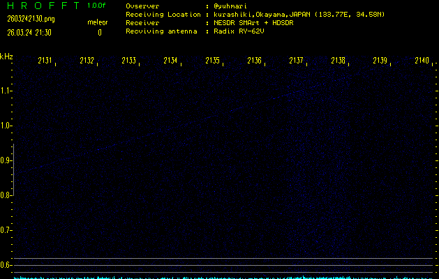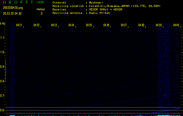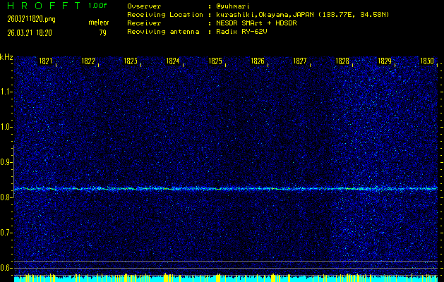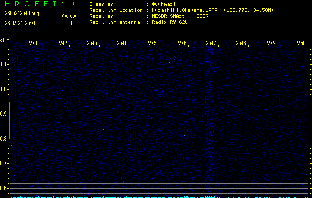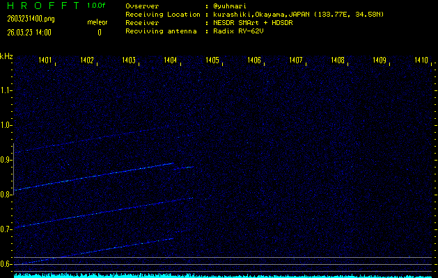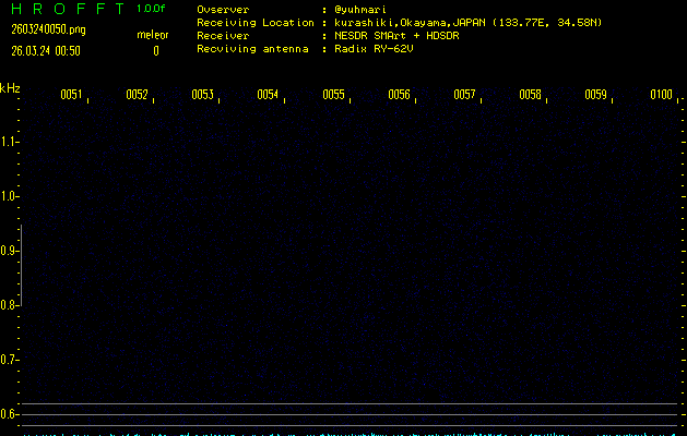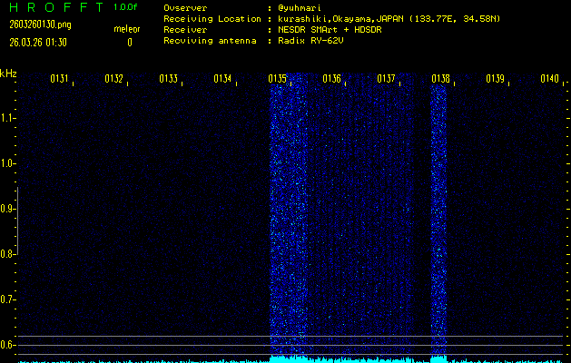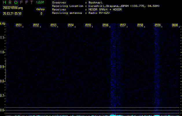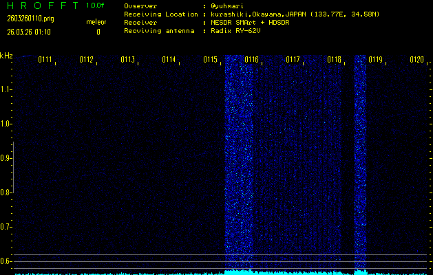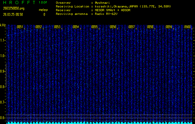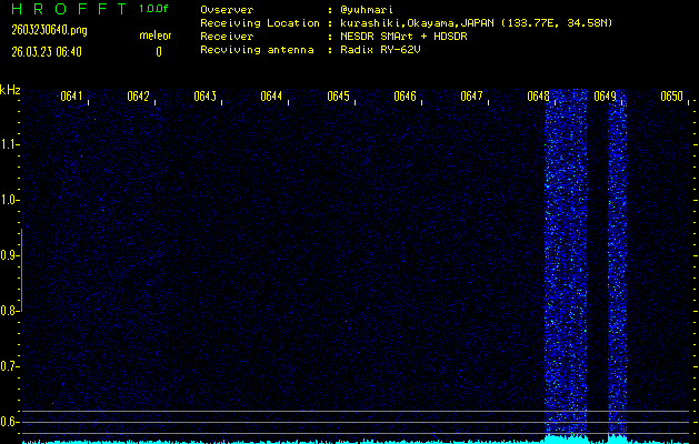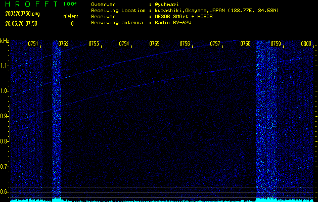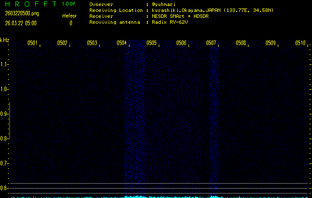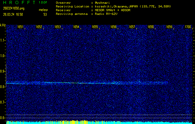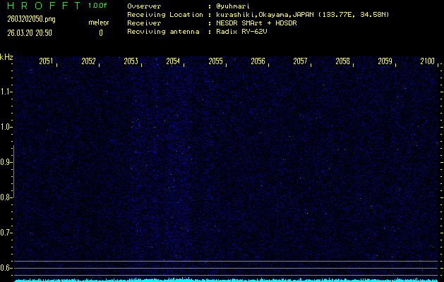 ただいま宮崎大学無線部OB会によって運用されているアマチュア無線50.017MHz(JA6YBR,50/10/1/0.1W,CW)を利用して試験受信を行っています。