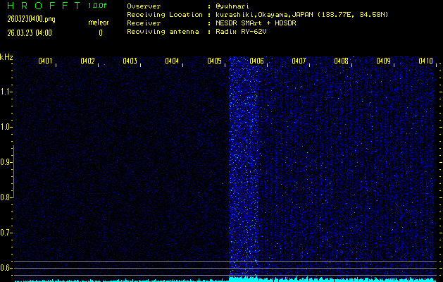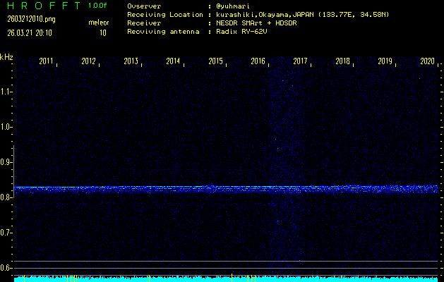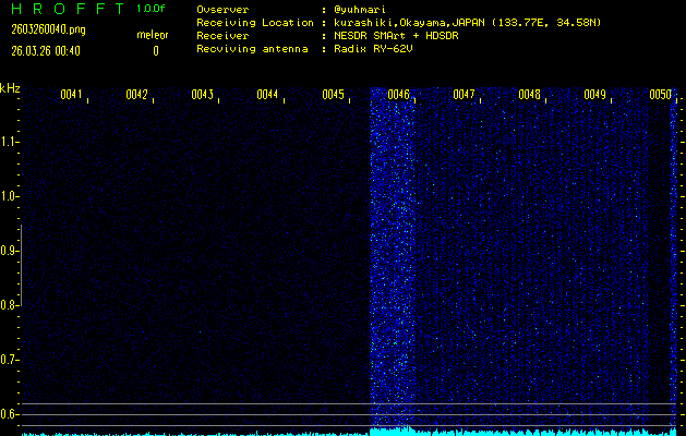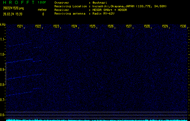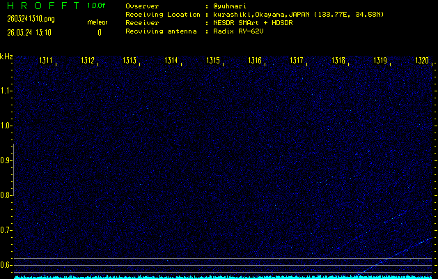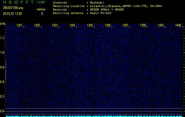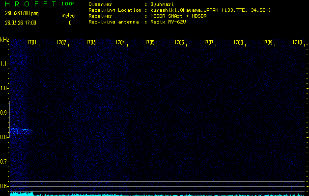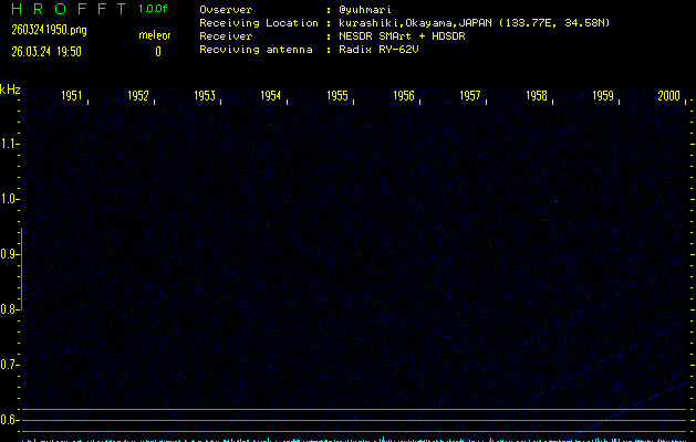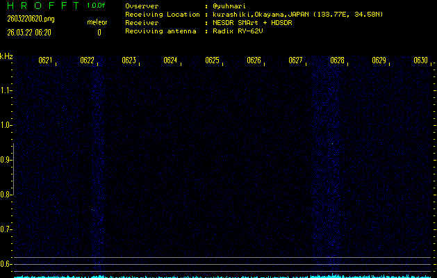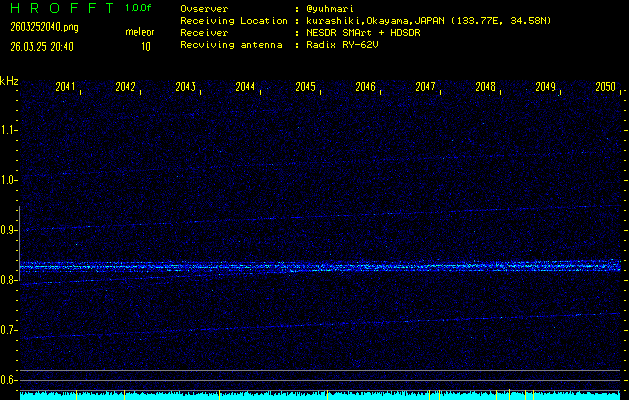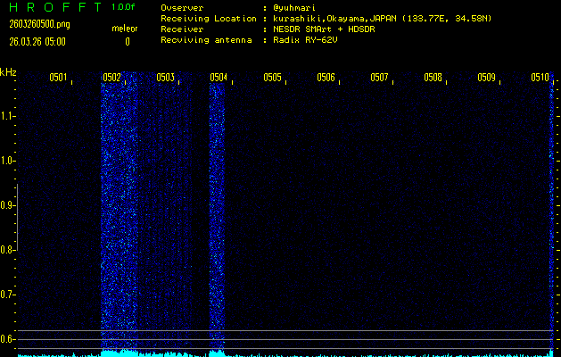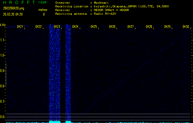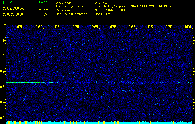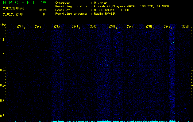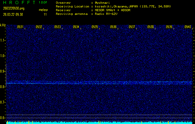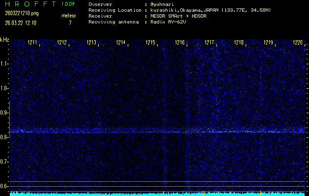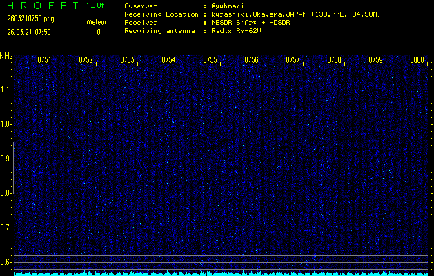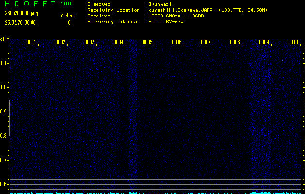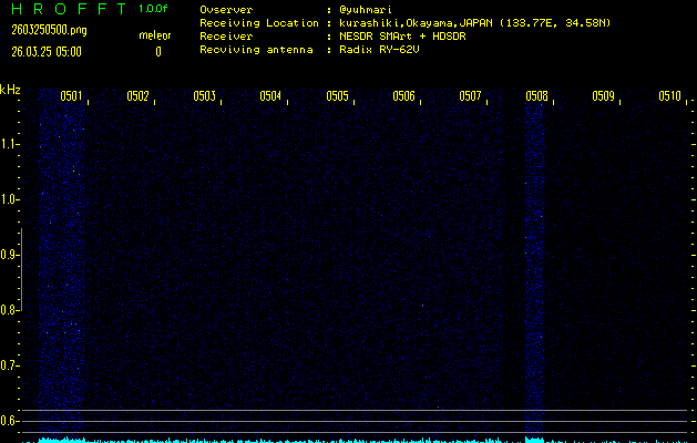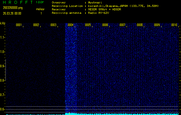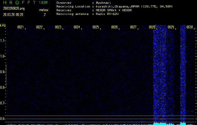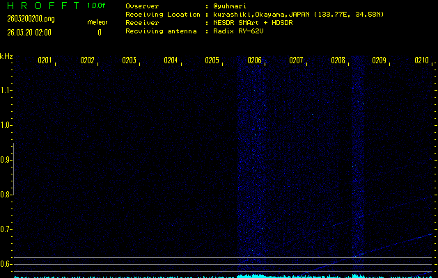 ただいま宮崎大学無線部OB会によって運用されているアマチュア無線50.017MHz(JA6YBR,50/10/1/0.1W,CW)を利用して試験受信を行っています。