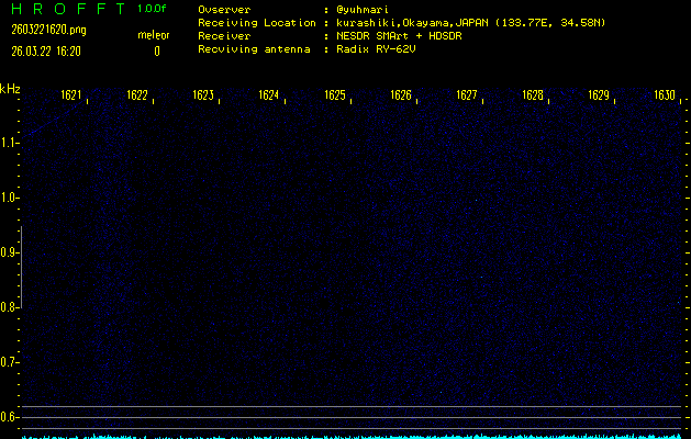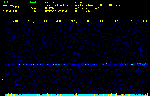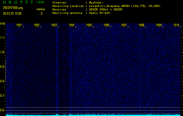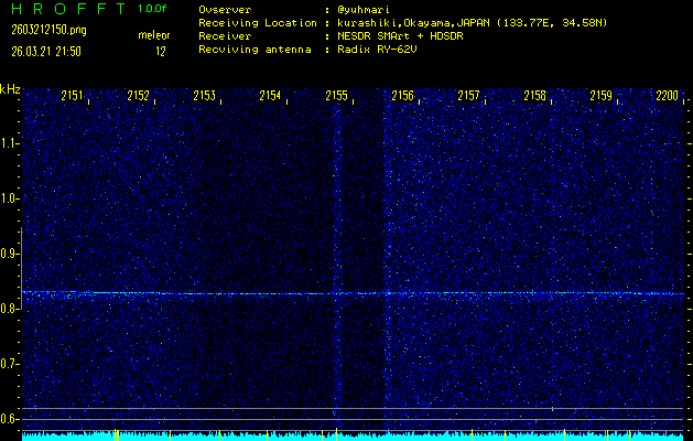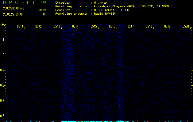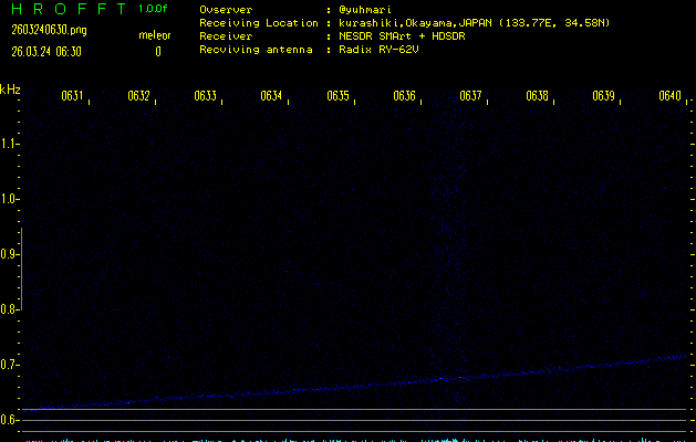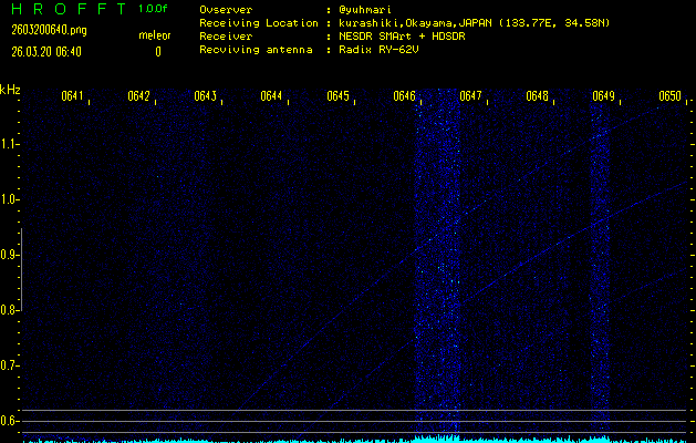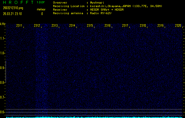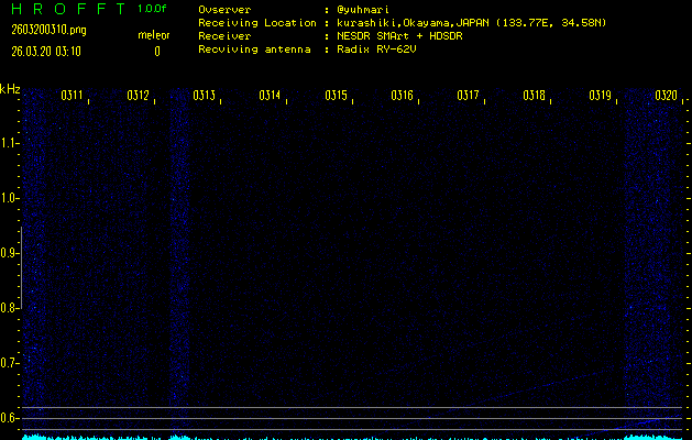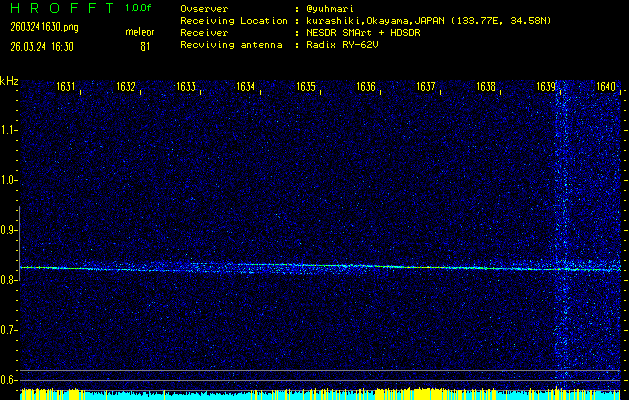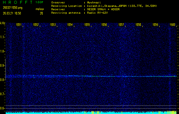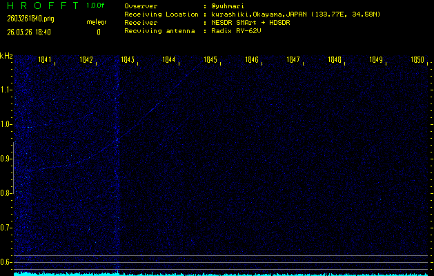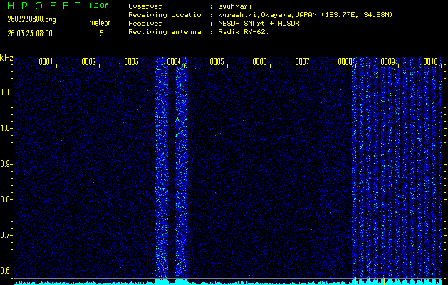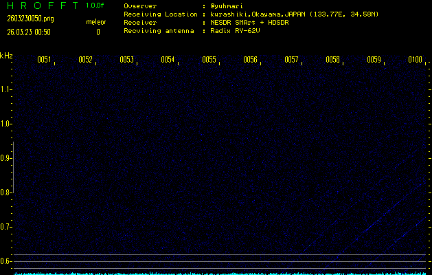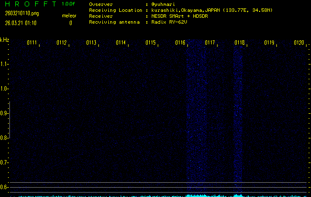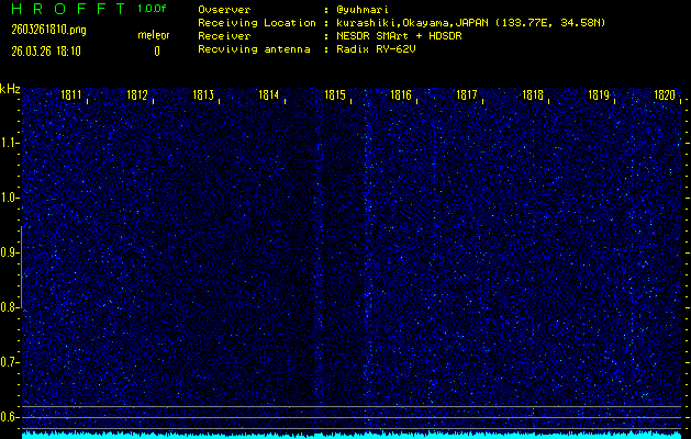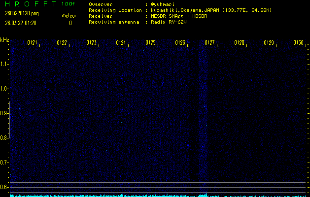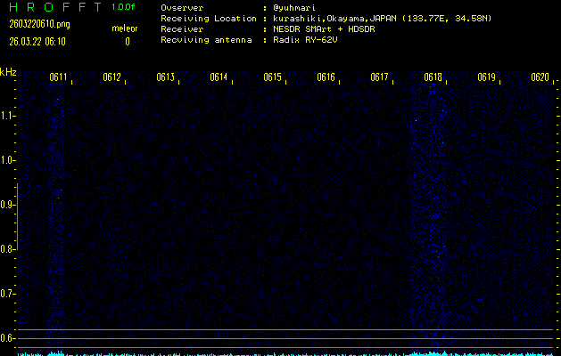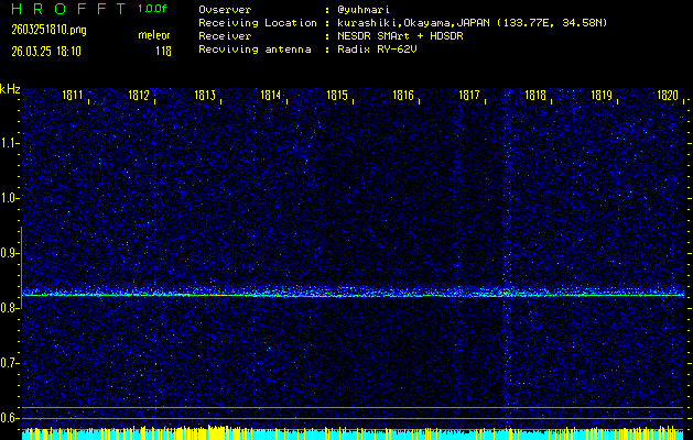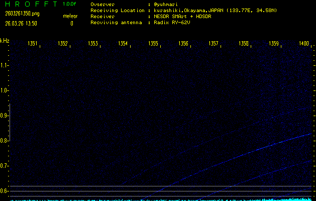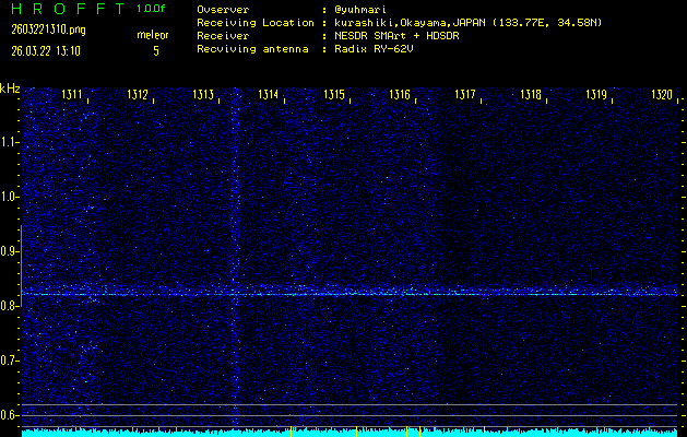ただいま宮崎大学無線部OB会によって運用されているアマチュア無線50.017MHz(JA6YBR,50/10/1/0.1W,CW)を利用して試験受信を行っています。