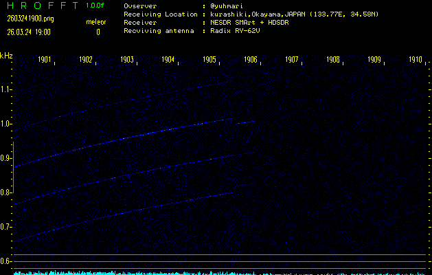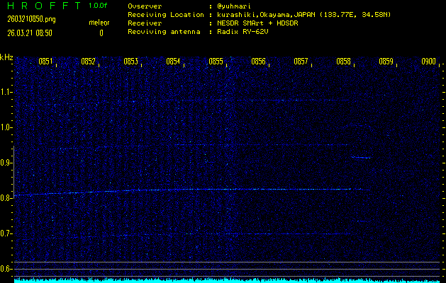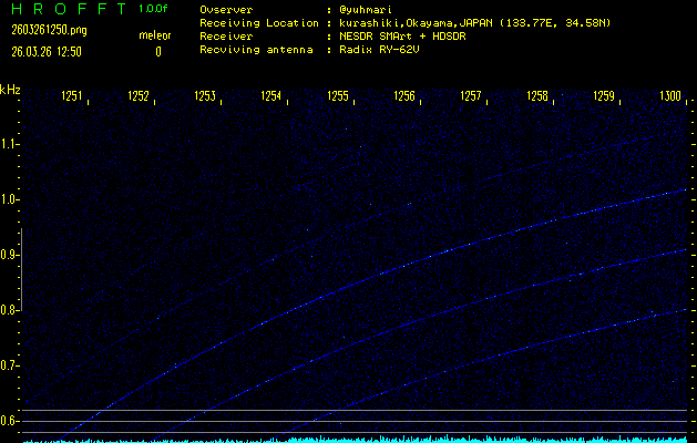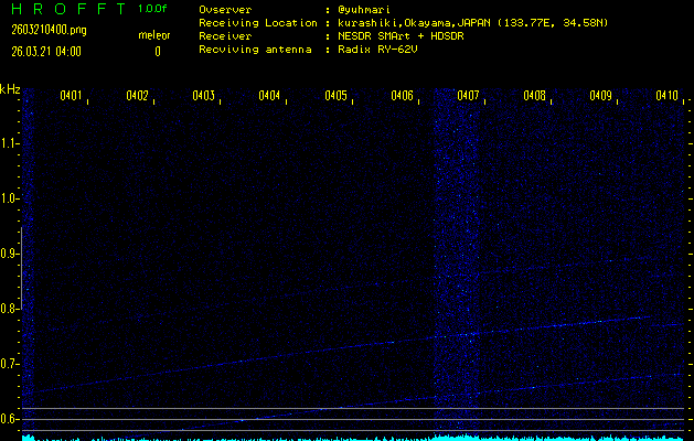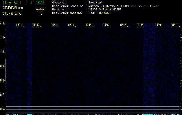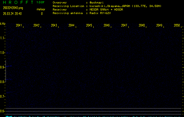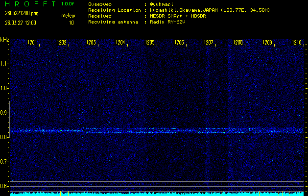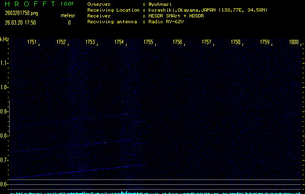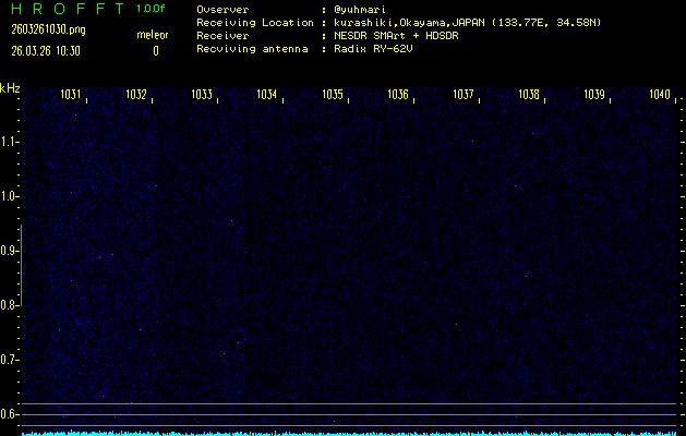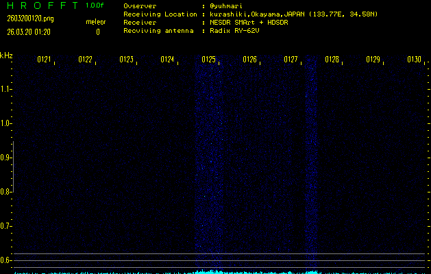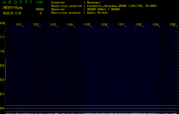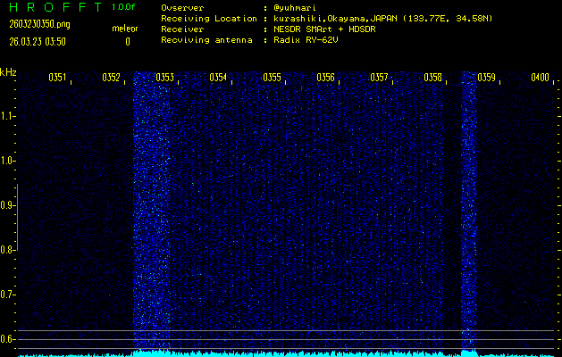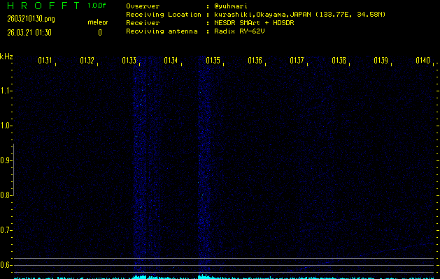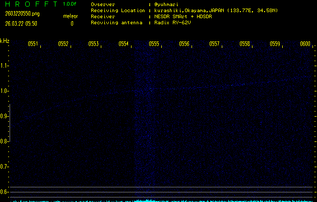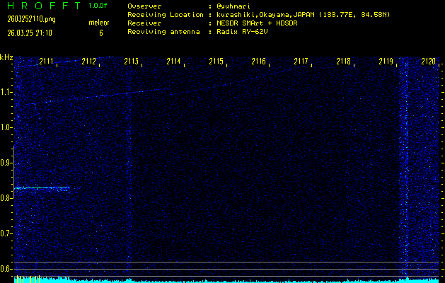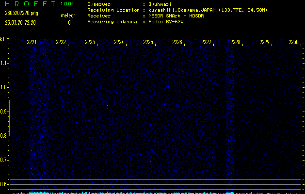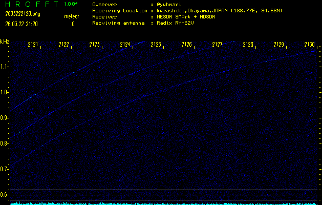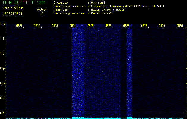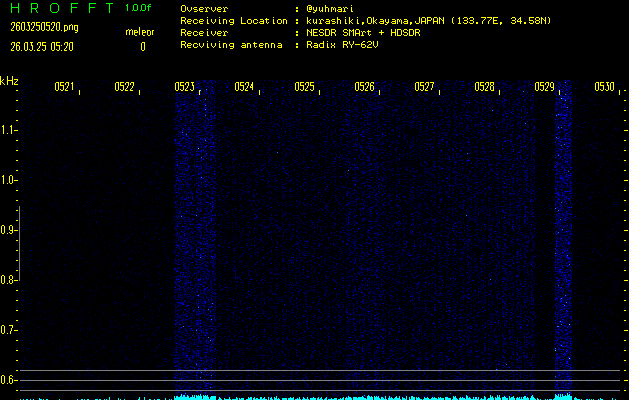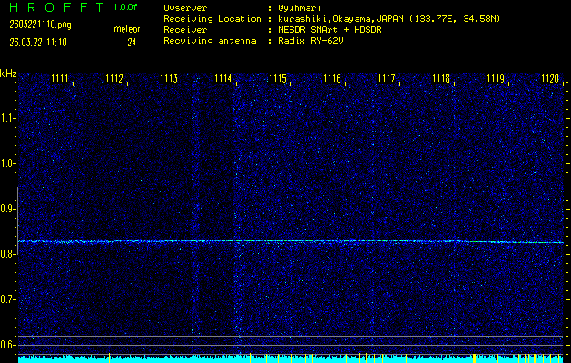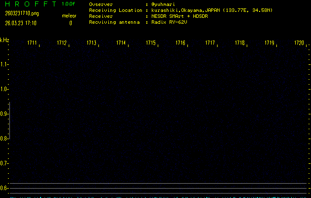 ただいま宮崎大学無線部OB会によって運用されているアマチュア無線50.017MHz(JA6YBR,50/10/1/0.1W,CW)を利用して試験受信を行っています。