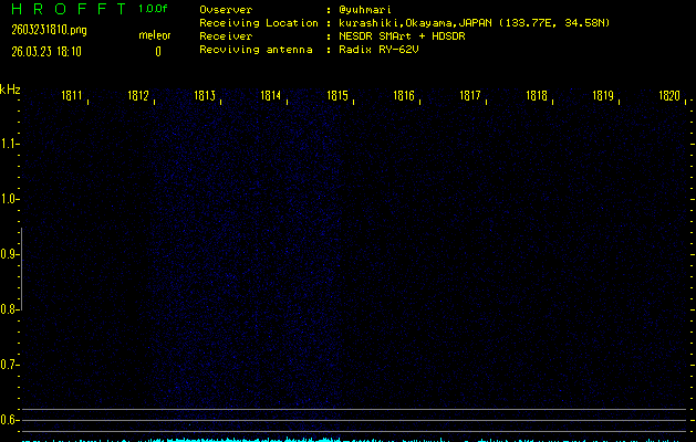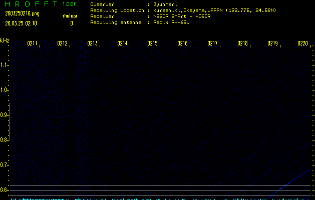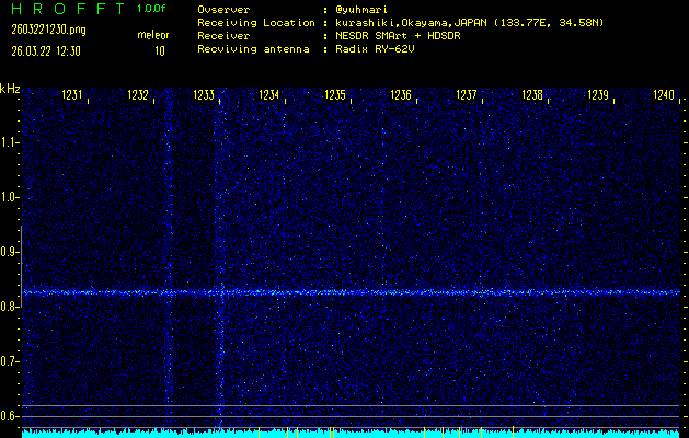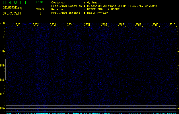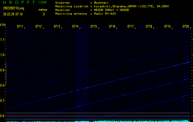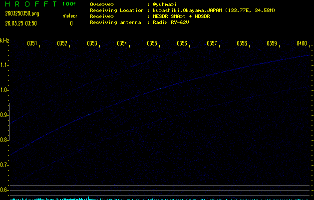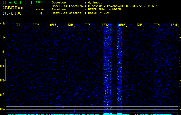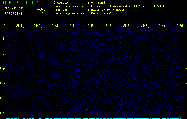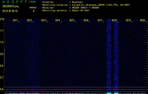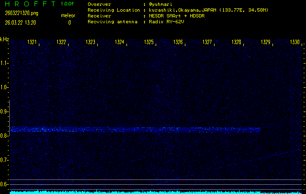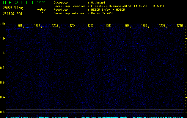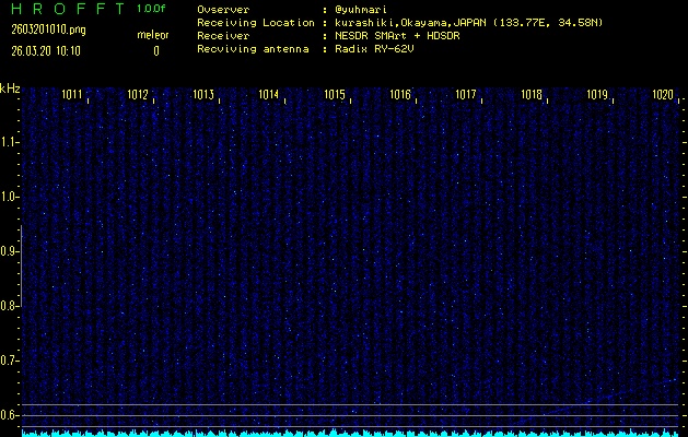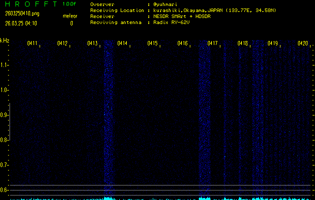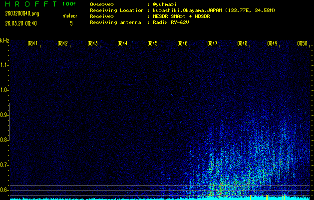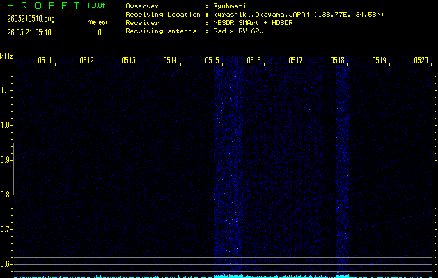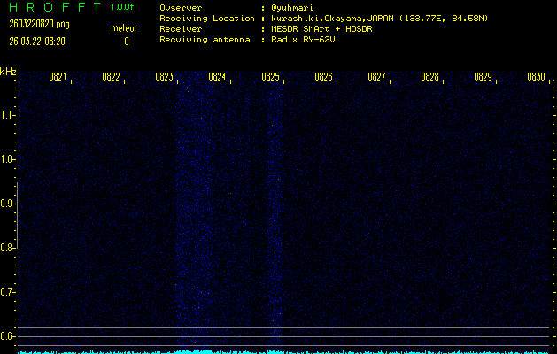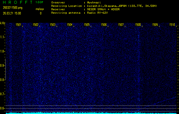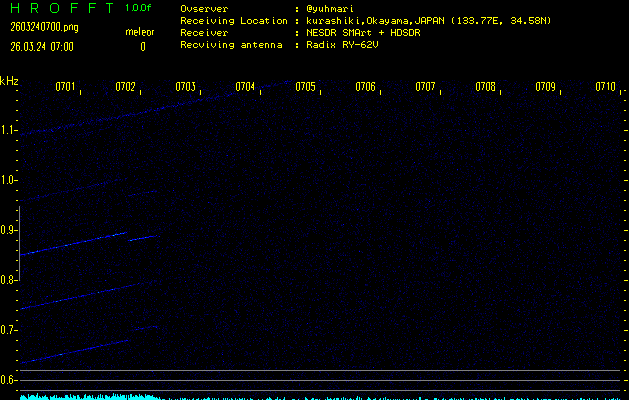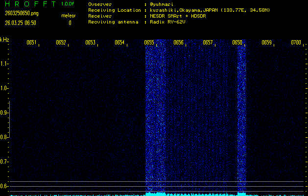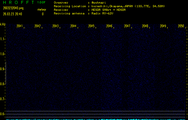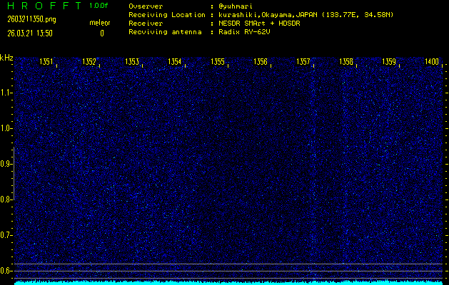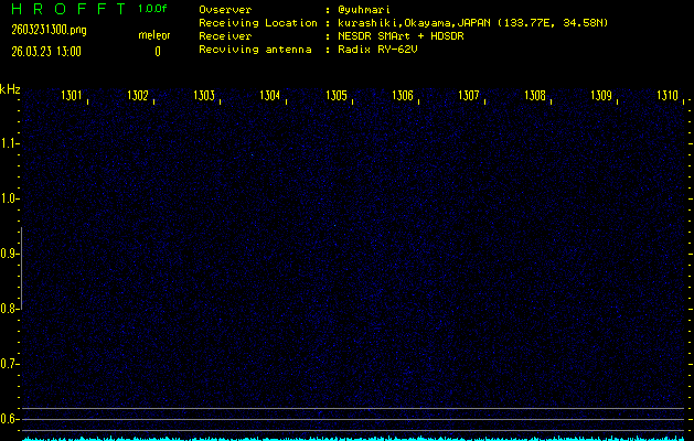 ただいま宮崎大学無線部OB会によって運用されているアマチュア無線50.017MHz(JA6YBR,50/10/1/0.1W,CW)を利用して試験受信を行っています。